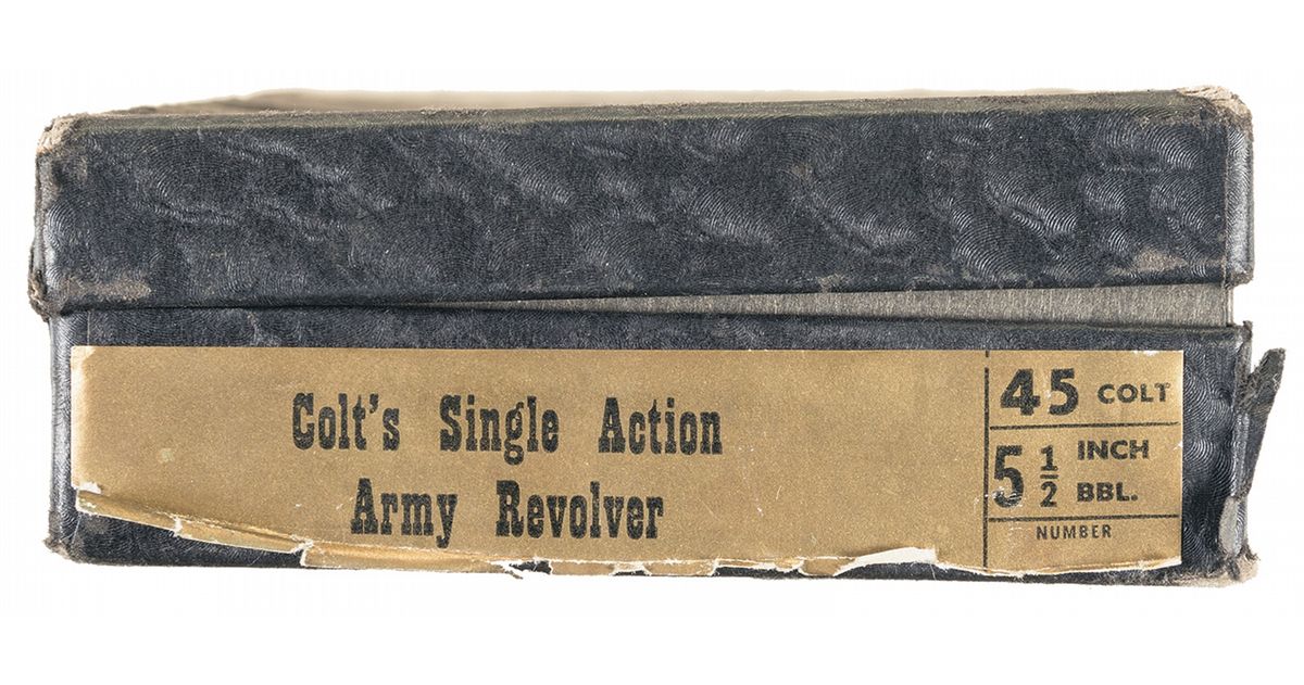 Manufactured in 1956, the introductory year for the Second Generation Single Action Army. Single line address on top of barrel, "COLT SINGLE ACTION ARMY .45" on the left side and the left side of the frame is marked with the two-line, three patent dates followed by the Rampant Colt. Matching serial and assembly numbers, including the inside of each grip panel. Blade front and frame notch rear sights, blue finish with casehardened frame and fitted with checkered hard rubber grips with the Rampant Colt at the top. Comes with the original black hinged lid box numbered to the gun and with the correct end label.
