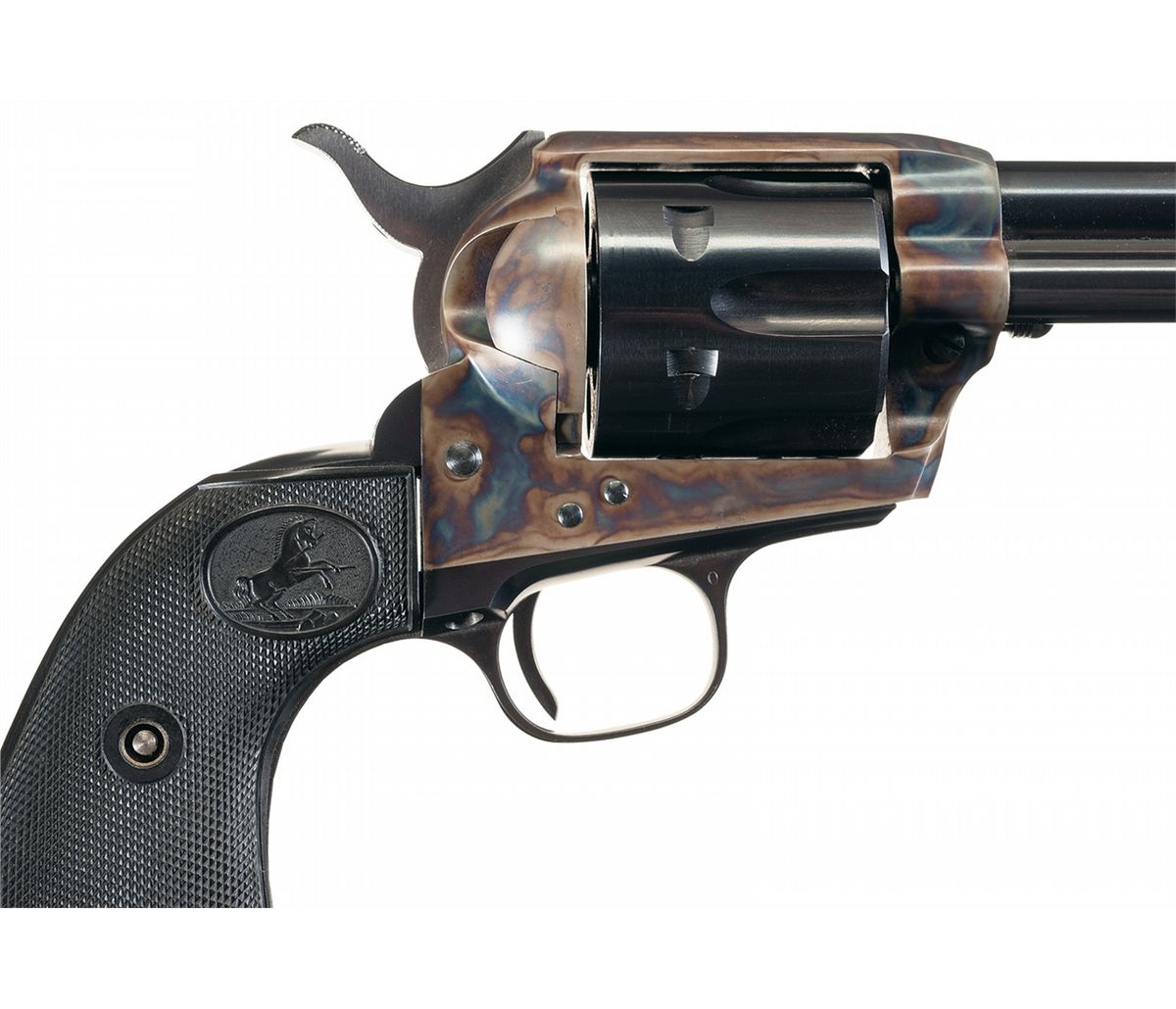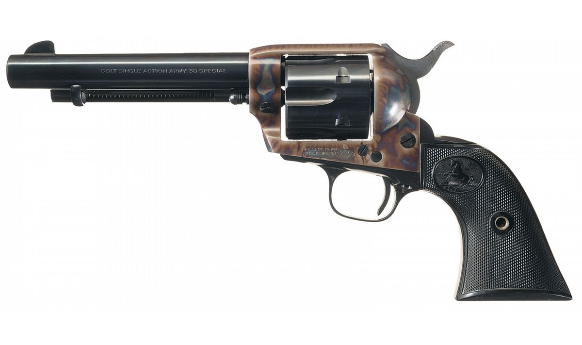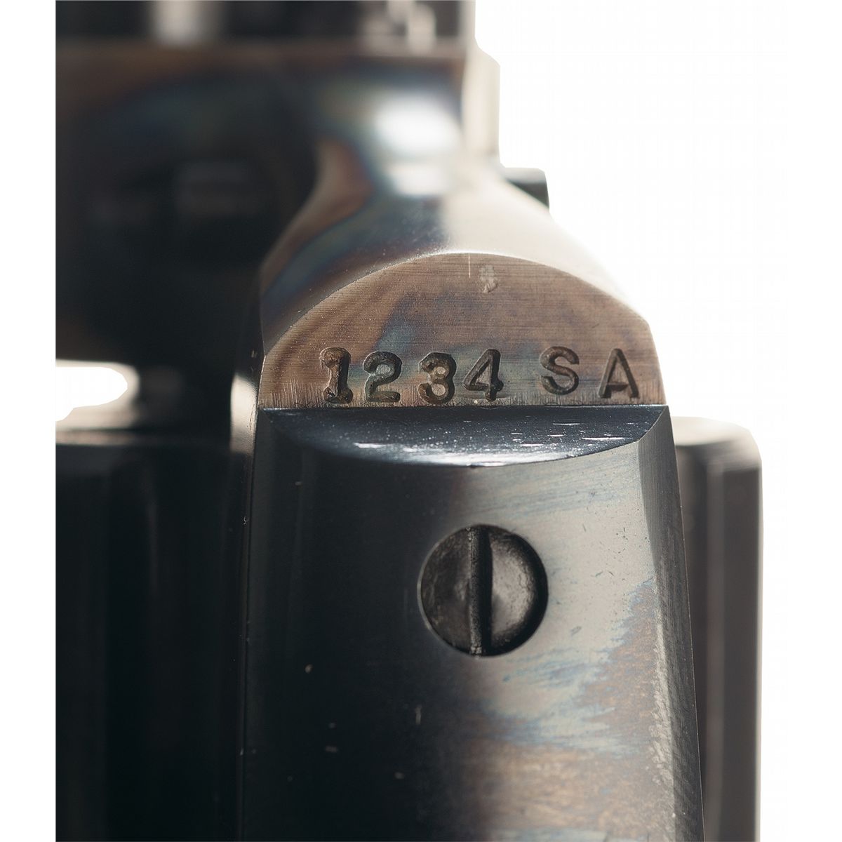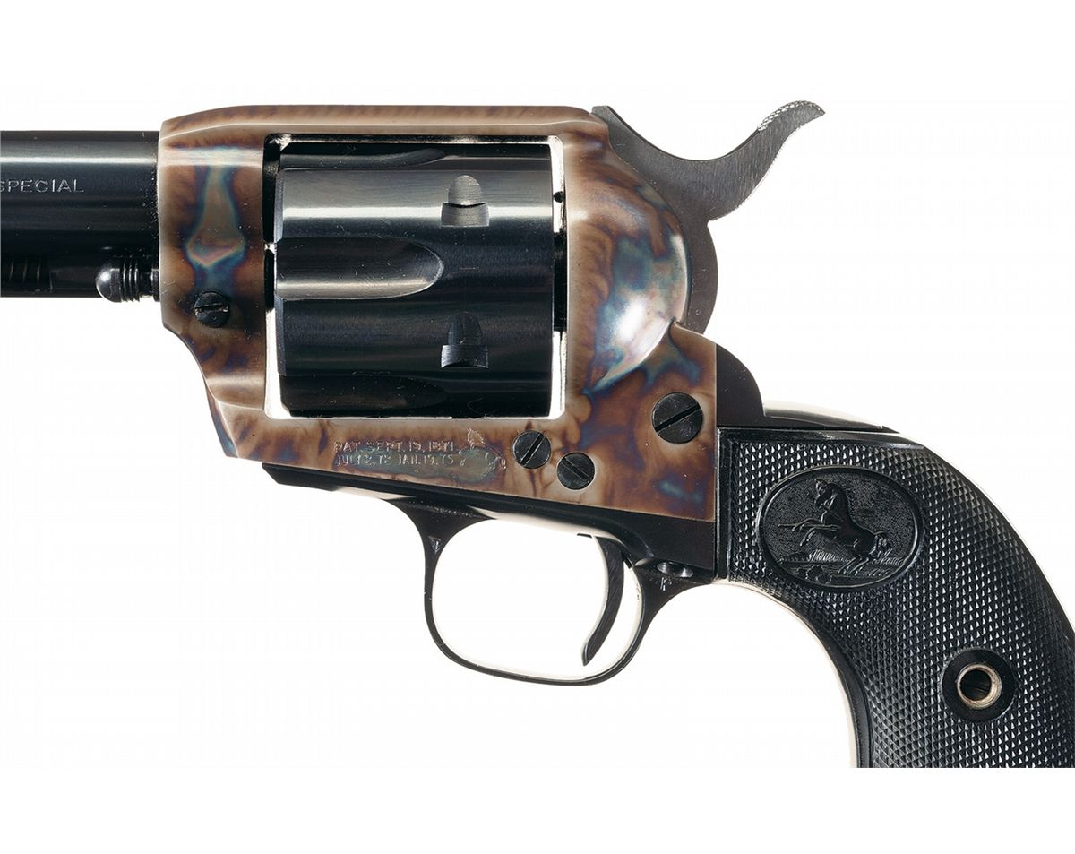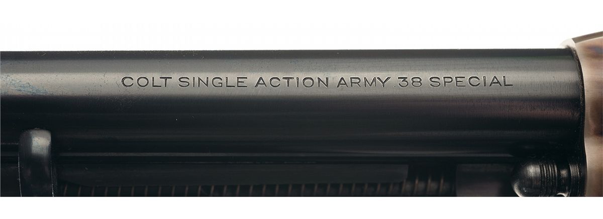 Manufactured in 1956, the introductory year for the Second Generation Single Action Army. Single line address on top of barrel, "COLT SINGLE ACTION ARMY .38 SPECIAL" on the left side and the left side of the frame is marked with the two-line, three patent dates followed by the Rampant Colt. The matching serial number is marked on the bottom of the frame and left side of the grip straps under the grips and the matching assembly number (672) is marked on the right rear of the frame and on the loading gate. Blade front and frame notch rear sights, blue finish with casehardened frame and fitted with checkered hard rubber grips with the Rampant Colt at the top. The grips are marked with the matching serial number on the inside.