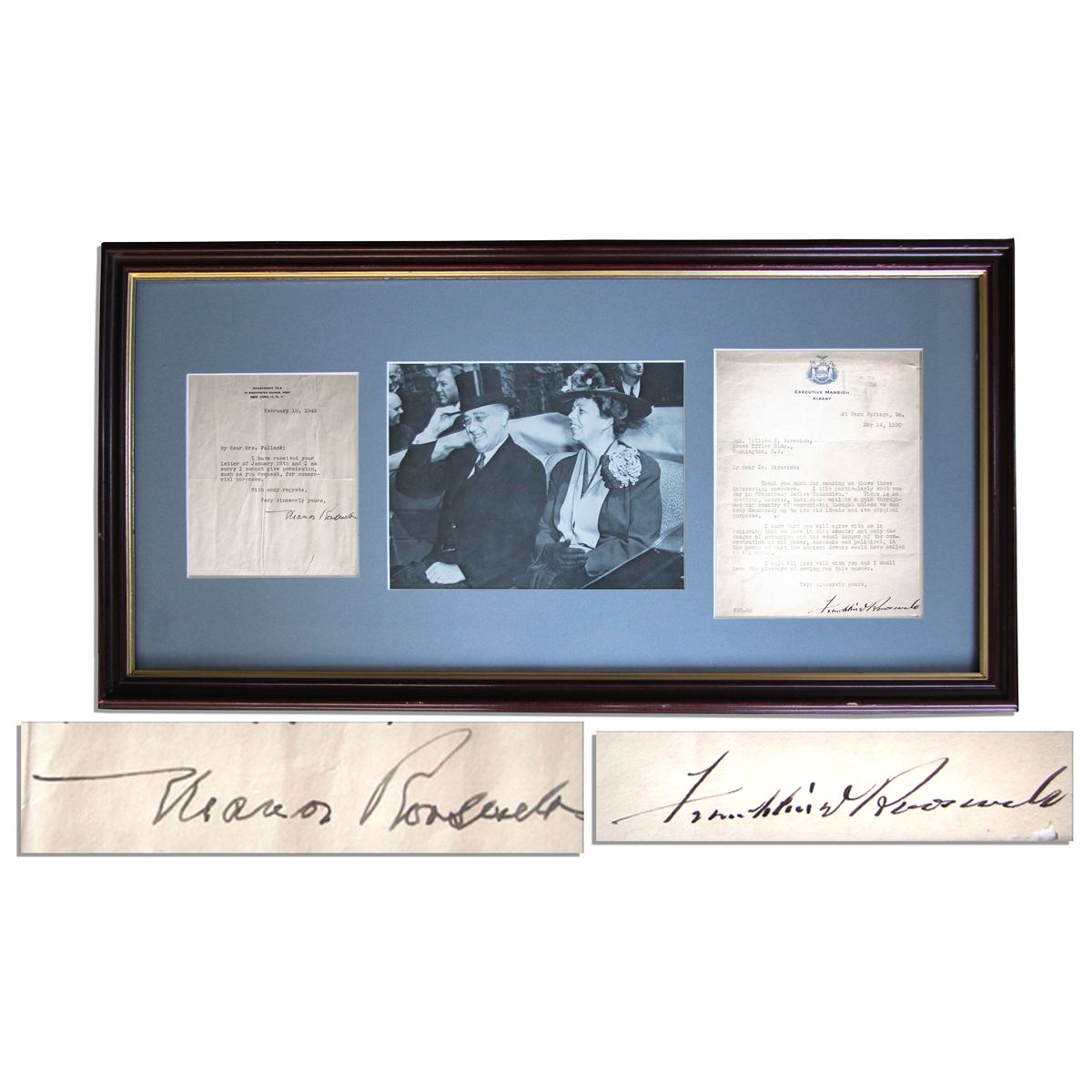 Exceptional typed letter signed by Franklin Roosevelt from 1930, discussing communism directly as well as the concentration of power in the hands of private interests. Lot also includes an additional letter by Eleanor Roosevelt. Franklin Roosevelt writes as Governor of New York on Executive Mansion letterhead to U.S. Congressman William I. Sirovich. Dated 14 May 1930, letter reads in part ''...there will be a gain throughout our country of communistic thought unless we can keep Democracy up to its old ideals and its original purposes...we face in this country not only the danger of communism but the equal danger of the concentration of all power, economic and political, in the hands of what the ancient Greeks would have called an oligarchy...[signed] Franklin D. Roosevelt''. Letter measures 6.5'' x 8.5'' with a strong black ink signature. Framed with a typed letter signed by Eleanor Roosevelt, dated 10 February 1949 upon her personal letterhead. Eleanor writes while working in New York City as U.S. delegate to the United Nations, in part, ''...I cannot give permission, such as you request, for commercial purposes...'' Measures 5.5'' x 6.5'', framed to an overall size of 29.5'' x 15.25''. Light toning, foxing and wear to both letters, overall in very good condition.