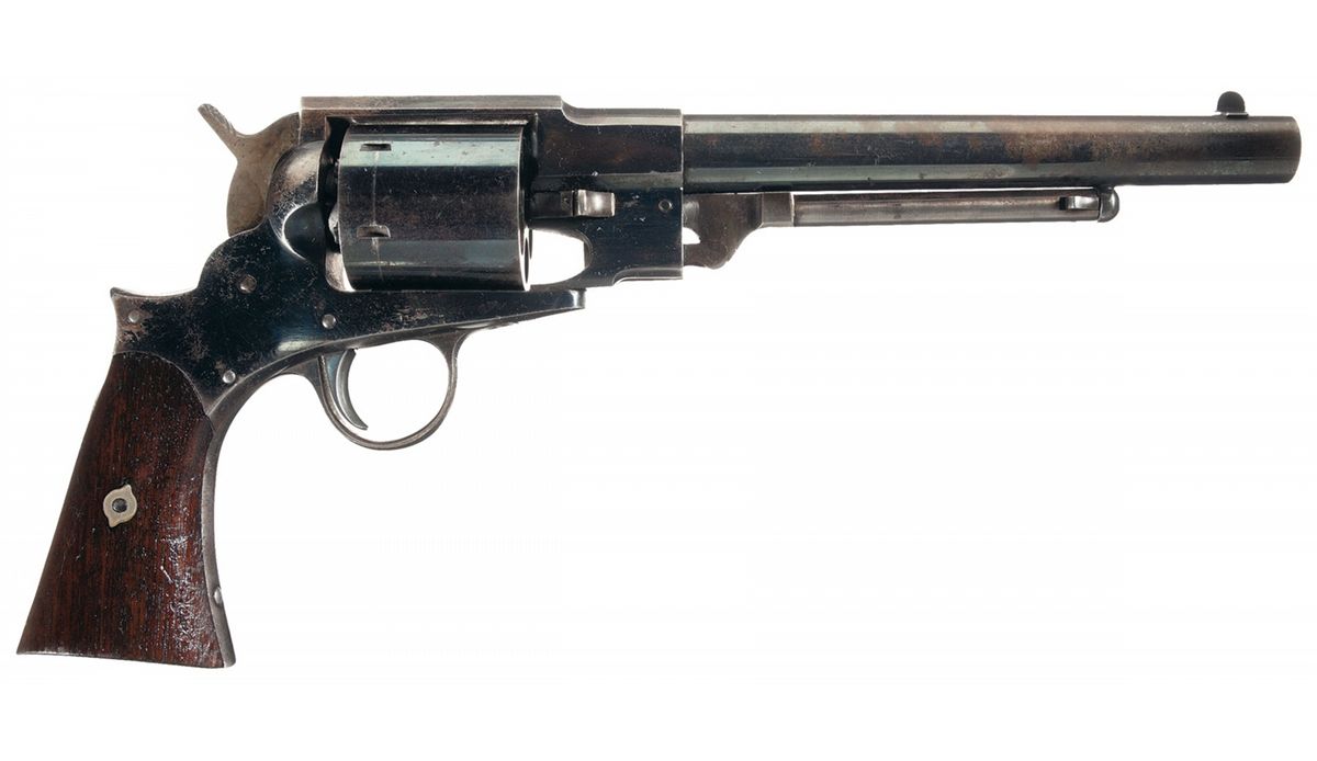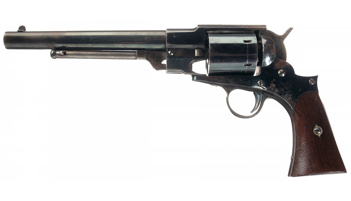 Approximately 2,000 of these revolvers were manufactured by Hoard's Armory, Watertown, New York circa 1863 and 1864. Although no government contracts or other documents have been located to show they were ever used by the military, these revolvers are considered as secondary martial arms. The top strap is marked "FREEMAN'S PAT. DECR 9, 1862/HOARD'S ARMORY. WATERTOWN. N.Y." The serial number is marked on the loading lever, frame underside, barrel, cylinder and cylinder pin. Austin Freeman's patent on the cylinder pin was similar to Bacon's First Model cylinder catch. The cylinder pin was retained by a flat spring on the left side of the frame. An ear on the right side of the pin had a button which will push the spring away from the ear on the left side, allowing the pin to be slid forward about 1/4". This pulls the pin out of the frame at the rear and disengages the hook on the left side of the frame allowing the pin and cylinder to be removed from the right side of the gun. The sights are fixed, the cylinder is un-fluted with recessed percussion nipples and fitted with smooth grips.