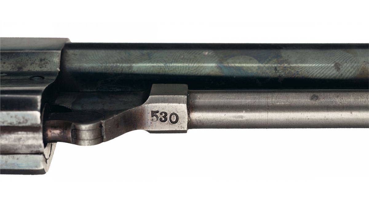 Condition: Extremely fine. The revolver retains 75% bright original high polished blue finish with the balance a smooth brown patina. The hammer retains half of the original case colors. The grips are very fine with a few pressure dents on the bottoms and a few minor handling marks overall. Mechanically fine.