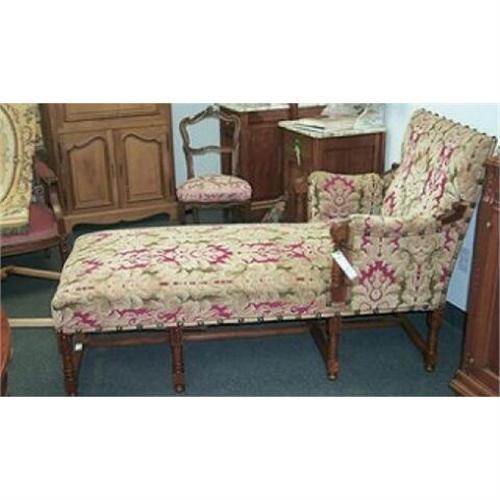 This is an excellent example of the lifestyle of the 1800's. A solid handcarved walnut lounge chair excellent condition. The upolstery is older although I do not know how old and it is a good example of the period. At the foot of the seat are two wooden pieces that extend out. I do not know what they are for. If anyone knows please share with me. This is a rare find.