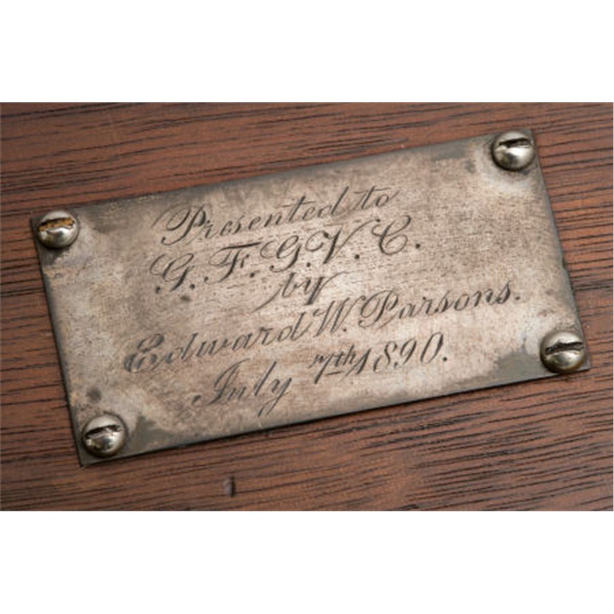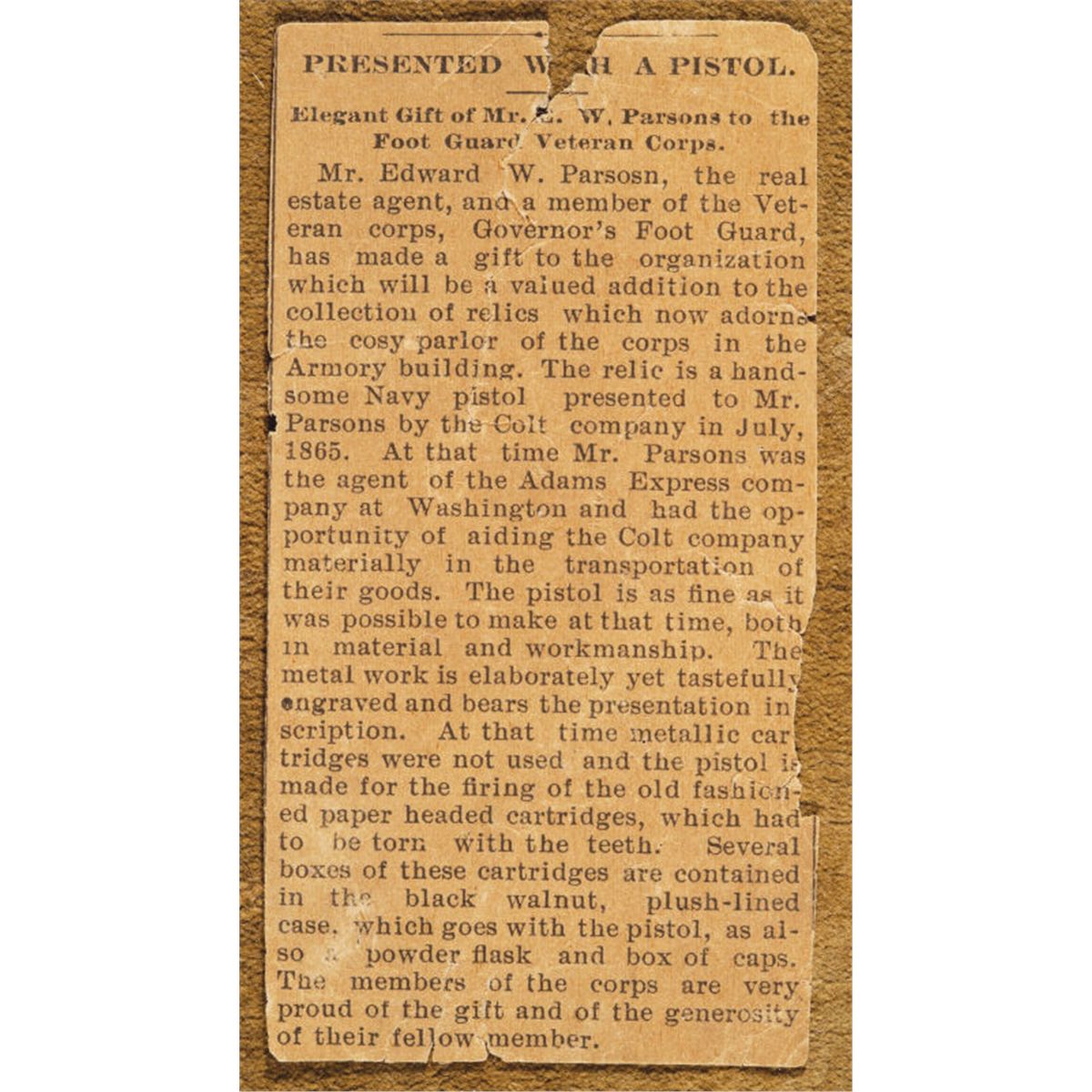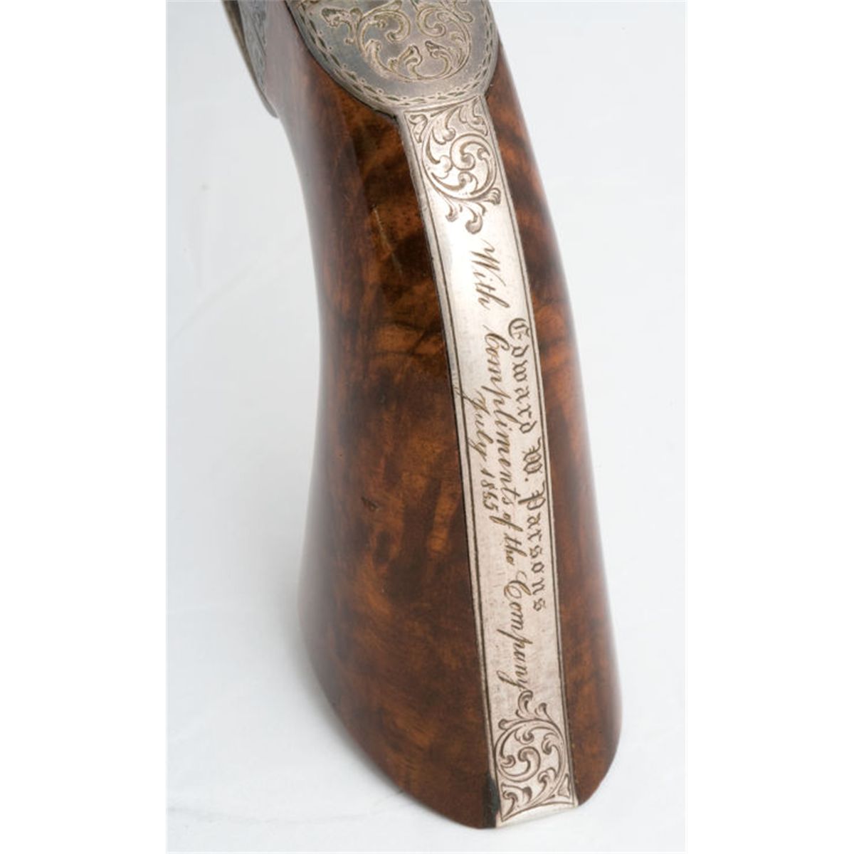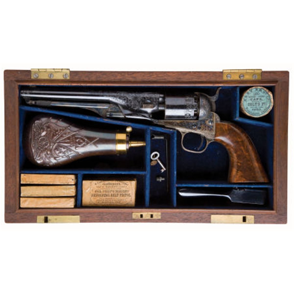 Exceptional Historic, Cased, Engraved and Presentation Inscribed Colt Model 1861 New Model Navy Revolver, From the Colt Co. to E.W. Parsons, of Adams Express Co., Hartford Serial number 19928/E. .36 caliber, 6-shot cylinder with naval engagement roll scene. 7 1/2-inch octagon barrel with German silver blade front sight. Top of barrel marked - Address Col. Saml. Colt New-York U.S. America. -Left side of frame engraved "Colts/Patent." Scroll and border engraved in highly refined and detailed late vine style, with coverage on the barrel, loading lever, wedge, cylinder, frame, hammer, and gripstraps. Wolf head motif on each side of hammer. Finely knurled hammer spur. Rich, blued finish, with case-hardened frame, hammer, and loading lever, and silver-plated brass gripstraps. Varnished select walnut grips of the finest quality. Shipped from the factory with the cylinder not serial-numbered, as noted on some of the other deluxe engraved arms of the period.Rare checkered rammer lever, and American eagle motif, latter on left side of barrel lug. Right side of barrel lug with stand or arms motif.The backstrap was elegantly inscribed in Gothic and script style as illustrated.Accessories of rare and unusual oil-finished brassbound walnut case, lined in blue velvet, with embossed stand of arms powder flask, elegant and scarce presentation grade high gloss blued steel double cavity bullet mold, five packets of combustible envelope cartridges by Colt's Cartridges Works. tin of Eley Bros. percussion caps with green paper label and paper wrapping, blued L-shaped screwdriver/nipple wrench, extra nipple and key. A silver plaque on the case lid is script inscribed "Presented to/G.F.G.V.C./by/Edward W. Parsons,/July 7th 1890." "G.F.G.V.C." was the 1st Company, Governor's Foot Guard, Veteran's Corps, of Hartford, of which Parsons was a member.Though his career began in Hartford as a bookseller, for most of his business life E.W. Parsons served as Chief of the Hartford Division of the Adams Express Company. Parsons had previously organized the Parsons-Fuller Mail Co. (1844), a company that had issued one of the first private postage stamps in the U.S.Parsons later became superintendent of Adams Express Co. for the Hartford area, which firm shipped thousands of Colt revolvers. The enterprising Parsons also became a limited partner of an insurance company, which had been founded by Jacob L. Greene.Colt factory ledgers document this revolver, by listing the description in Journal B, page 294:Hartford Saturday December 9, 1865354 Presentation a/c[For] 1 N.M. Navy Pistol extra Engdwith all appendages in Walnut Casepresented to E.W. Parsons Esq Hartford[$]28/52E.W. Parsons has an intriguing connection to researcher and author John E. Parsons. The Parsons family had ties with Connecticut, and E.W. had left this revolver as a gift to the 1st Co., Governors Foot Guard, Hartford. Eventually the organization needed to repair the armory's roof, and was enabled to do so by selling the Parsons Colt, as well as a deluxe Winchester Model 1873 rifle in a leather case. Both sets were featured in color illustrations in the Antique Arms Annual 1971, pages 102 and 103. John E. Parsons had indicated to author and researcher R.L. Wilson that E.W. Parsons was an uncle. Wilson met John E. Parsons, in 1961, while preparing the Samuel Colt Presents book and exhibition. Irving Blomstrann, Wadsworth Atheneum photographer, drove with Wilson to Parsons' palatial country home in Harrison, New York. There both photographer and author surveyed the Parsons arms collection, displayed upstairs in glass cabinets, the type one might see in a museum. Primarily keen on firearms history, Parsons had several percussion Colts with inscriptions, some of which he lent to the "Samuel Colt Presents" exhibition. The E.W. Parsons Colt set has been widely pictured, including in the Antique Arms Annual 1971, as noted above, as well as in Wilson's The Colt Engraving Book, volume I, page 252, and in Colt Engraving, page 178. A letter from R.L. Wilson, on Colt factory letterhead, originally prepared for Herb Glass (who acquired the Colt and Winchester from the Foot Guard), also accompanies this important set. The Parsons Navy documentation is contained within a clamshell style bookbinder's case of half leather, with extensive background material, including pages from various books in which the set has been featured, various magazine articles, and an historical letter from R.L. Wilson. Among this collection is a newspaper clipping, entitled "Presented with a Pistol," related to the gift of the cased set to the historic military unit in Hartford.The E.W. Parsons Navy ranks among the finest and most historic of Colt percussion revolvers. It is considered an icon within the arms collecting community and a prime example of the appearance of a rare Colt set, as it left the Colt factory destined for presentation to an important personage.Attribution of the engraving on this revolver is to Conrad F. Ulrich.Literature:R.L. Wilson. American Arms Collectors Percussion Colts and Their Rivals The Al Cali Collection, pages 69-73.R.L. Wilson (ed.), Antique Arms Annual, published by the Texas Gun Collectors Association, 1971. Pictured in color on page 103.R.L. Wilson. The Colt Engraving Book, volume I, pages 252-253. Pictured in color.Provenance:E.W. Parsons1st Company Governors Foot GuardHerb GlassRichard Prosser MellonGreg MartinAl CaliRichard Prosser MellonGreg MartinAl Cali