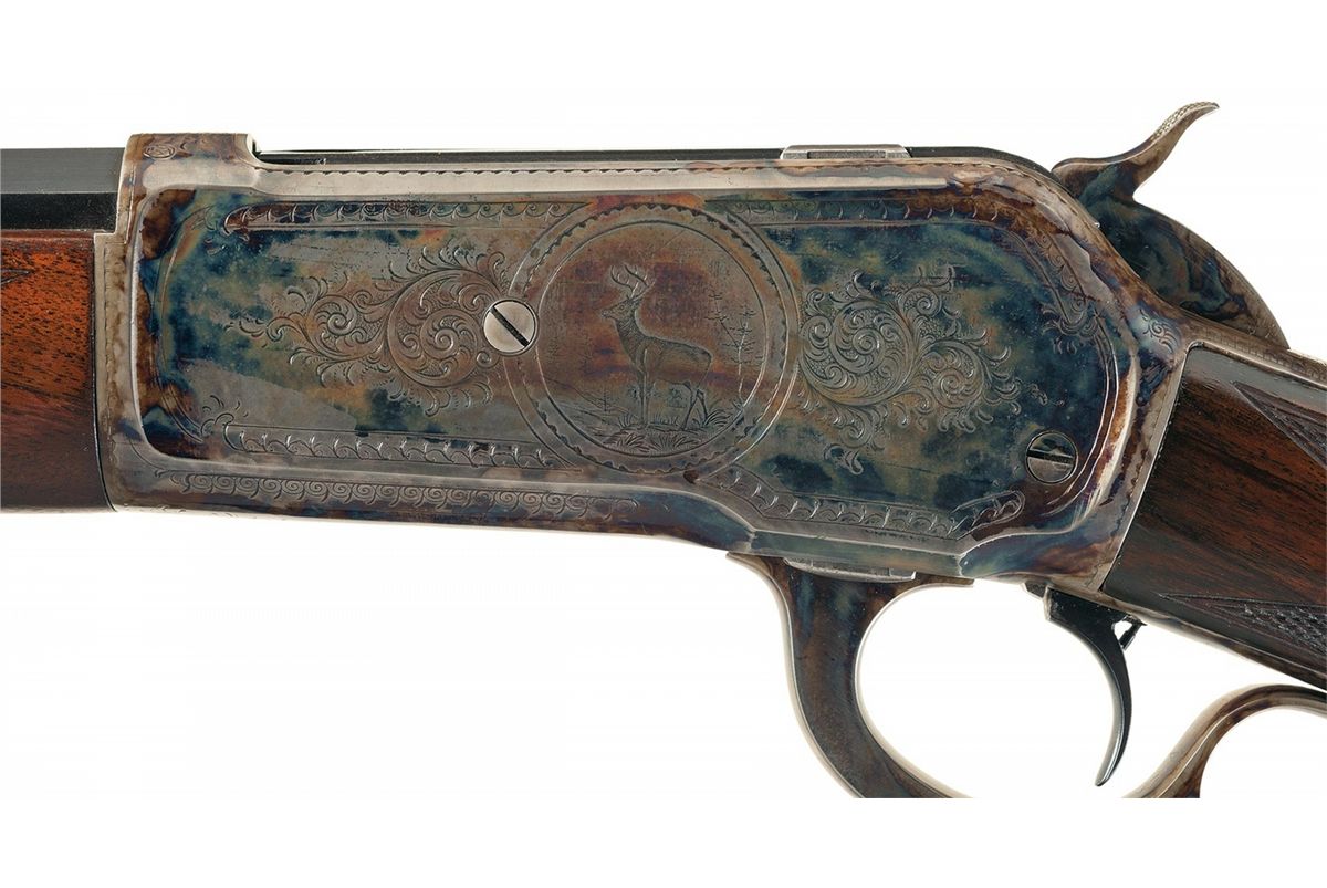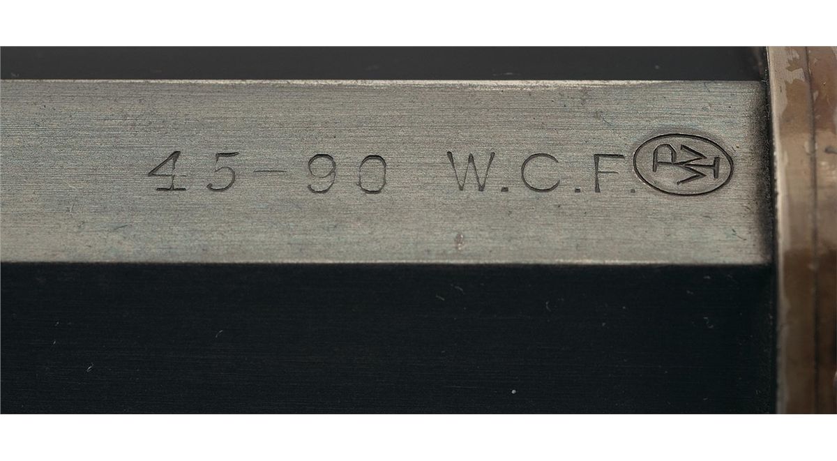 Special Order Winchester Model 1886 Fancy Sporting Rifle manufactured in 1888. The right side of the receiver is inscribed "Made Expressly for/William Ross Tullock." in two lines above the loading gate. Documents that accompany the rifle state that William Ross Tullock was a Scotsman from the Orkney Islands who emigrated to the United States in 1885. Tullock worked as an engineer for the U.S. During his time in the U.S. Tullock met Henry Ford. Tullock returned to Orkney in 1901 and in 1912 used his relationship with Henry Ford to establish the first overseas dealership for the Ford Motor Company. The W.R. Tullock Orkney Car Rental remains in business today. The rifle is accompanied by a Cody Firearms Museum letter which states that this rifle was shipped from the Winchester warehouse on October 8, 1888 and returned for repair on October 18, 1908. The letter documents the rifle's numerous special order features which include: single set-trigger, custom stock 1/2 inch longer and with 3/4 inch more drop than regular, pistol grip, cheekpiece, Swiss butt, $4.00 engraving and sling swivels. The barrel, full-length magazine, bolt and loading gate are blue. The forearm cap, receiver, hammer and lever are color casehardened. The Swiss buttplate is nickel plated. The stock and forearm are highly figured, fancy grain walnut with "Style H" checkering and ''extra oil" piano finish. The pistol grip has an ebony inlay. The receiver, forearm cap and heel of the Swiss buttplate have the Winchester No. 10 engraving illustrated in the Winchester 1897 "HIGHLY FINISHED ARMS" catalogue. This catalogue is reproduced on pages 209-223 of THE BOOK OF WINCHESTER ENGRAVING by R.L. Wilson. The engraving features a white tail deer in a game scene on the left side of the receiver and fine scrollwork with engraved borders on the top, sides and bottom of the receiver. The full octagon barrel has a standard sporting front sight with nickel-silver blade and a buckhorn sporting rear sight. A folding combination rear sight is mounted on the upper tang. The top barrel flat is roll-stamped with the two-line legend "-MANUFACTURED BY THE-/-WINCHESTER REPEATING ARMS CO. NEW HAVEN. CONN. U.S.A.-" ahead of the rear sight. The top of the barrel just ahead of the receiver is stamped with the caliber designation "45-90 W.F.C.". Oval "W/P" Winchester proofmarks are stamped on the top barrel flat just ahead of the receiver and on the top of the receiver to the left of the engraved scrollwork. The proofmarks were probably applied when the rifle was returned to Winchester in 1908. The lower tang is marked with the two line 1884/1885 patent dates and the script serial number "24468". The sights were apparently changed when the rifle was returned to Winchester because the Cody letter lists the sights as "Rocky Mountain front, Sporting leaf rear and Lyman Blank piece". Winchester Model 1886 Fancy Sporting Rifles with factory engraving, inscriptions and numerous special order features like this rifle are very rare.