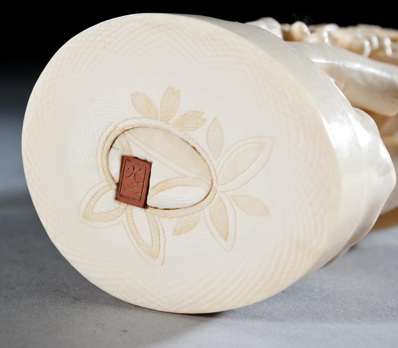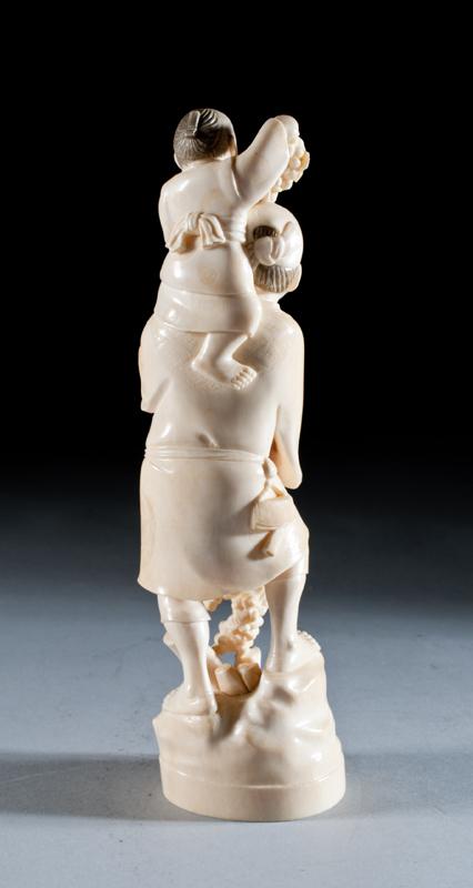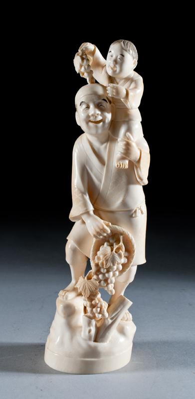 Finley carved to depict a man holding a boy on his shoulder and holding a basket of flowers, the child a bunch of grapes. The base with two character mark within a red plaque, further carved with a chrysanthemum. 9" H, late 19th/early 20th century.