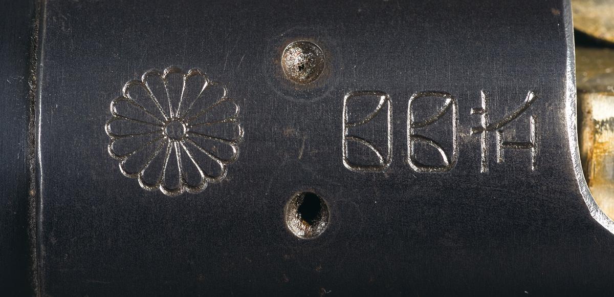 Manufactured at Kokura Arsenal. The carbine retains a clear mum and is without the dust cover. Inverted "V" front sight with side protectors and ladder rear sight. The left side of the receiver has the serial number along with the Kokura Arsenal cannonball mark and a sub-inspector marks. The carbine is correctly finished with a polished bolt and straw colored trigger. Equipped with a folding bayonet and fitted with a green canvas sling.