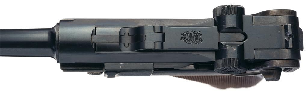 This is an excellent example of an all original post-WWI 1920 era commercial Luger that has the blank chamber area with the standard "DWM" logo on the first toggle. It has the standard commercial style serial number placement with the full number (6034u) stamped on the front of the frame with the "crown/N" commercial proofs on the underside of the barrel, left side of the barrel extension and breechblock. It has the standard safety and loaded markings and is currently fitted with the original early post-war style light colored walnut checkered grips. This pistol is complete with one original WWI era nickel plated magazine with the unmarked wooden base.