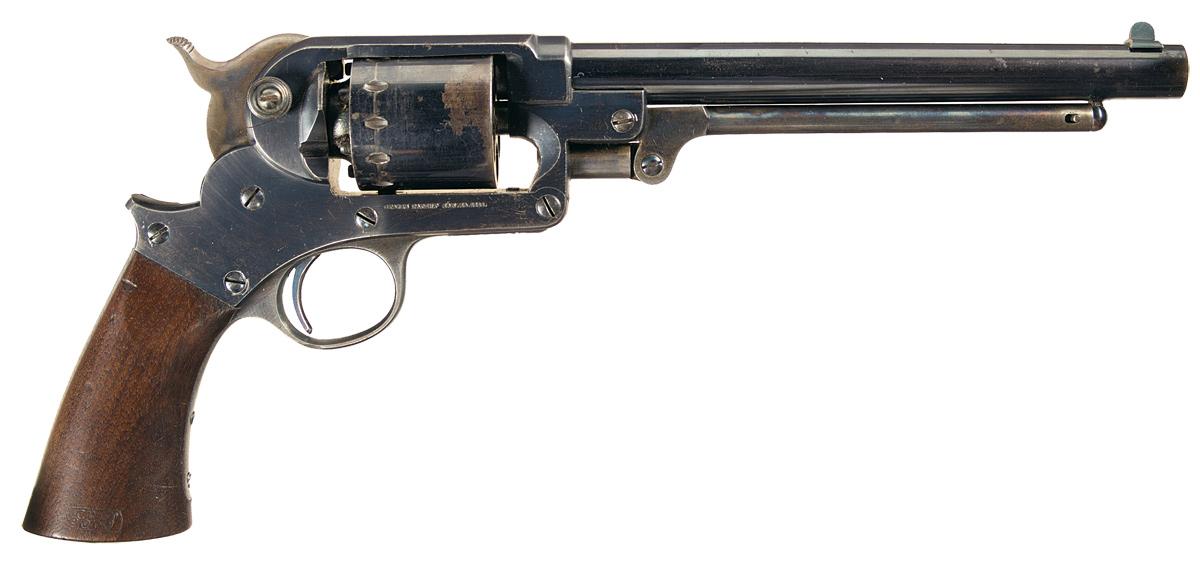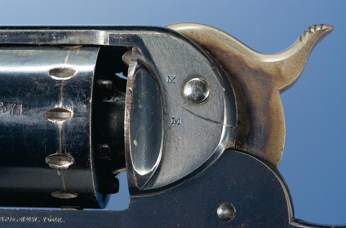 Condition: Excellent Plus. The revolver is probably unfired and shows only storage wear with about 95% of the original, high polish intact. Nearly all of the brilliant casehardening colors remain intact on the loading lever and hammer. Finish loss is primarily limited to the backstrap, trigger guard and some light flaking on the cylinder. The percussion nipples and front and rear faces of the cylinder show minimal evidence of flash pitting from firing. The bore is bright. The grips are in excellent plus condition with very crisp inspection marks. An exceptional example of an important Civil War revolver. This would be nearly impossible to improve upon.