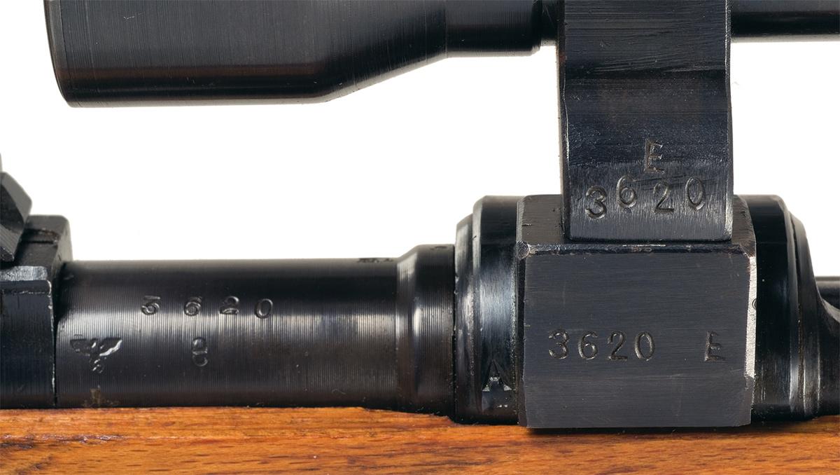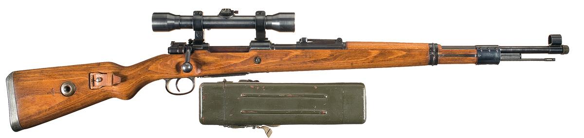 This is an exceptional example of a very scarce late WWII K98 Mauser claw mount sniper rifle fitted with a Hensoldt scope. These rifles were produced from late 1943 to late 1944 using both Mauser and Steyr produced rifles. These rifles used the original WWI scope mounting system of double claw bases soldered and screwed to the top of the front and rear receiver ring. This specific sniper rifle has no receiver ring markings, (removed). The rear of the barrel is marked with the Nazi firing proof and serial number on the left side, an "eagle / 135" proof on top and "CE" on the right side, as well as two "eagle / WaA77" proofs below the front of the rear sight. The left side of the receiver ring directly ahead of the matching serialized mount is marked with the letter "A" and the side wall is marked "Mod. 98". The scope is a 4x Hensoldt marked "DIALYTAN 4x / bmj" and "75868 / blue cross" and has the adjusting dial graduated from 100 to 800 meters. The serial numbers are all matching, including the scope rings and mounts, and a "WaA514" marked scope case is included. The rifle is equipped with the standard correct hooded front sight, adjustable rear tangent sight graduated to 200 meters, steel cleaning rod with slotted head and mounted with a standard laminated stock and handguard and it is fitted with a smooth cupped buttplate and brown leather sling. The right side of the buttstock is stamped with a large Nazi firing proof. Complete with an original green metal scope case marked "5051 D / eagle proof jvd" on the lid, with green fabric strap.