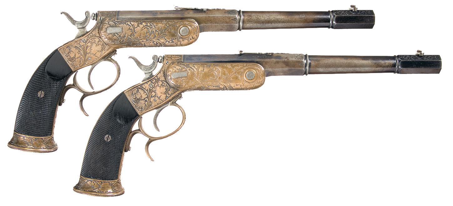 A) These ornate German target pistols feature a heavy solid brass frame and iron barrel. The first 1 5/8" and rear 4 3/8" of the barrel are octagon and round in between. The top flats on the muzzle end are decorated with floral leaf engraving, there is light floral leaf engraving on the front edge of the rear portion, the left upper flat is marked "G. BARTELS KONIGL. HOFBUCHSENMACHER." and the right upper flat is marked "IN WIESBADEN & ZELLA.". The left rear flat is marked "0,2gr11.G.P. M/71. / 1,8 grRI.". The bottom barrel flat ahead of the frame is marked with a crown over "B", "G" and "U" proof and "527". Blade front sight and decorative adjustable rear sight with floral leaf and geometric engraving. The brass frame is relief engraved with vine and leaf designs with a matte background. The engraving pattern extends to the trigger guard, grip straps and buttcap. The bottom of the frame is marked with a crown over "B" and "U" proofmark and the serial number is marked in an oval panel on the butt. Tip up action with feather pattern engraved release button, finger spur on the trigger guard, checkered trigger and hammer and fitted with two piece checkered ebony grips.