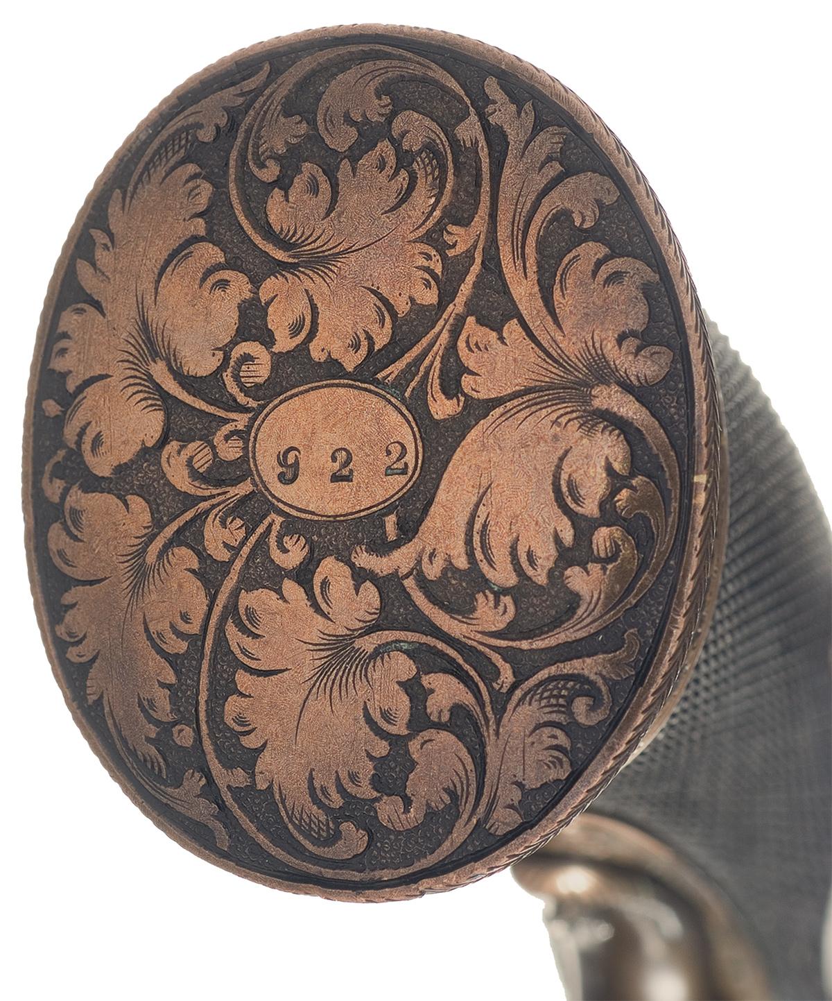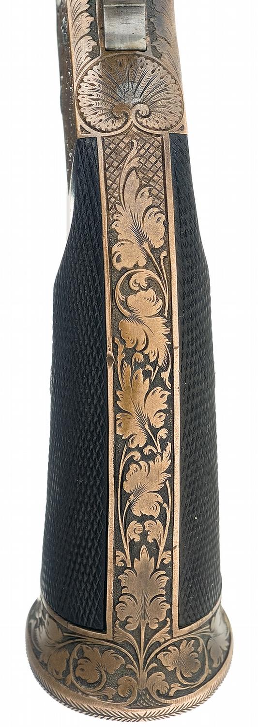 Condition: Very fine. The barrel retains 60% original blue finish with the balance having a smooth brown patina. The frame has an aged patina with strong traces of the darkened original silver on the upper edge and protected areas of the trigger guard. The grips are excellent with only a couple small minor dings and sharp checkering. The engraving remains sharp. The markings are crisp and clear. Mechanically excellent.