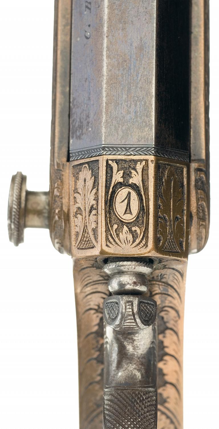 Condition: Very fine. The barrel retains 50% original bright blue finish with the balance having a smooth brownish gray patina. The frame shows some strong traces of the darkened original silver on the upper edge and in the protected areas of the trigger guard, otherwise the brass has an aged patina. The grips are excellent with a minor scratch on the upper right panel, light handling marks and sharp checkering. The markings are crisp and clear. The engraving is sharp. Mechanically excellent.