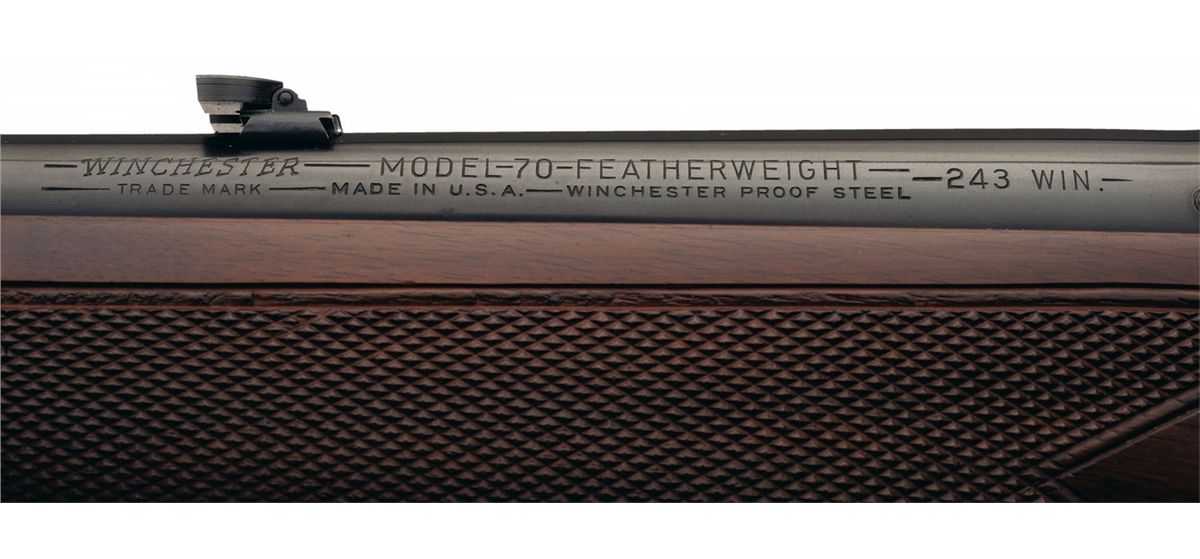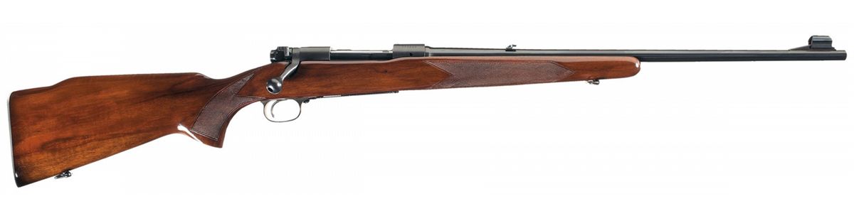 Manufactured in 1956 with a "type 7" hooded front ramp sight with an elevation adjustable flip up rear sight. The straight tang receiver has a matte front bridge and a plain rear bridge drilled and tapped for scope mounting with filler screws. The left rear side of the receiver is drilled and tapped for sight mounting with filler screws. The safety is the "late" type and the bolt handle is hollow. Mounted on a multi-point checkered Monte Carlo walnut stock with sling swivels and a checkered aluminum buttplate.
