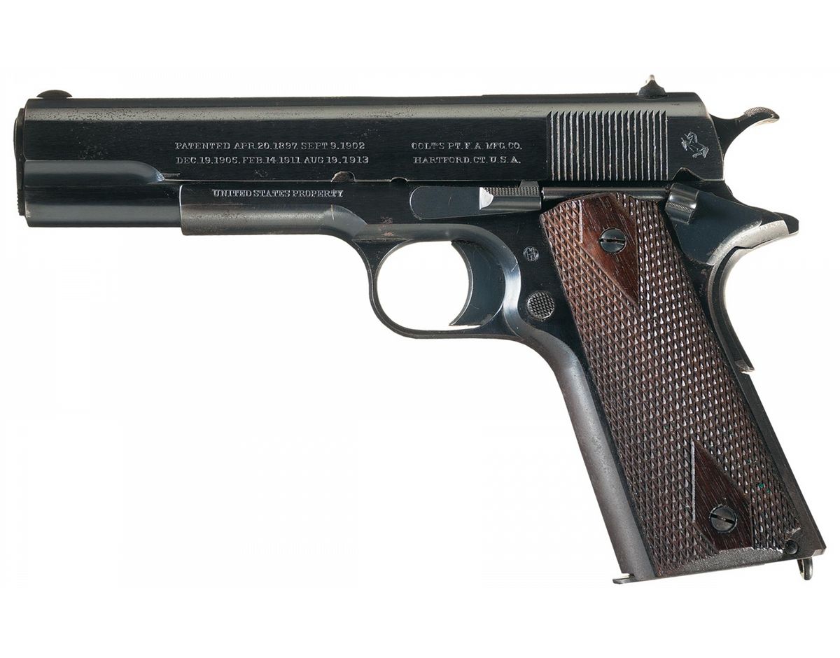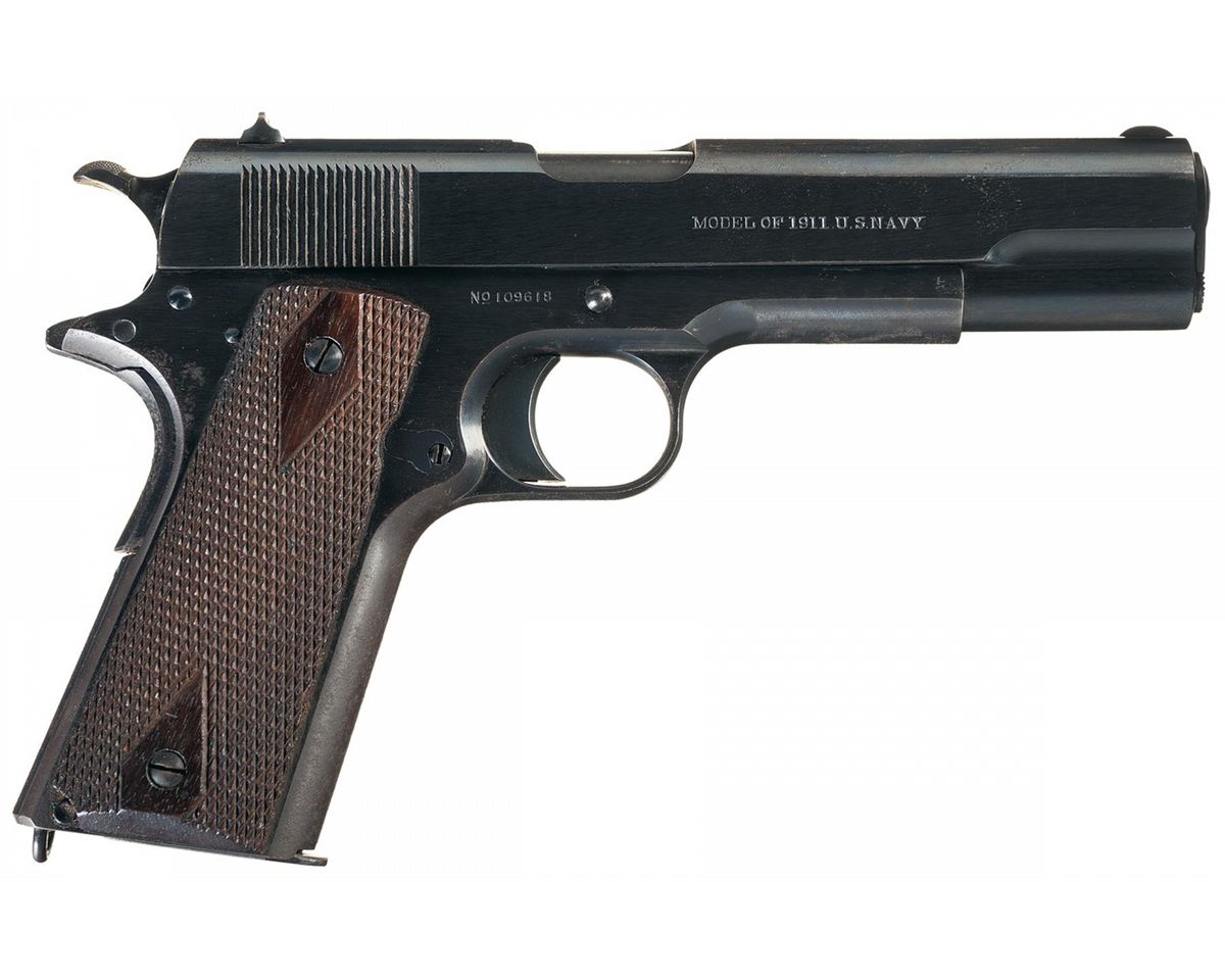 This is a beautiful example of an original Colt "U.S. Navy" Contract Model 1911 Semi-automatic pistol manufactured in 1915. This pistol was one of 500 guns shipped to the Brooklyn Navy Yard on March 5, 1915 for the Naval Militia and the consignor stated that this pistol originally belonged to Lt. Cmr. Allen L. Malone, who was the aide to Adm. King, Commandant of the Philadelphia Navy Yard. These early pre-WWI U.S. Navy contract pistol in original condition that still have their original Navy marked slide are one of the most difficult 1911 series pistols to obtain. These were produced very early on when the Navy was contracting directly with Colt for their service pistol requirements, later all procurements were standardized and purchased only through the U.S. Army. All future procurements only have the U.S. Army markings. The left side of the slide is roll marked in a two line, two block pattern with the 1897-1913 patent dates followed by the Colt factory address, followed by the circled Rampant Colt logo, behind the serrations. The right side of the slide has the very rare "MODEL OF 1911 U.S. NAVY" markings. The left front section of the frame is marked "UNITED STATES PROPERTY", with the circled "GHS" Ordnance inspection mark of Major Gilbert H. Stewart above the magazine release. The right side of the frame is marked with the serial number "No 109618". It also still retains its original early all blue barrel that is stamped with the separated "P" and "H" proof marks on the top of the chamber and a single number "5" stamped on the underside of the barrel in front of the lug. It has all the correct early parts such as a smooth face trigger, checkered slide stop, checkered, thick thumb safety, checkered wide spur hammer, flat main spring housing and checkered walnut grips with diamond pattern around the screws. This beautiful early Colt Navy pistol is complete with one unmarked two-tone magazine with the flat base and an original and also very rare early Rock Island Arsenal marked 1914 dated leather holster with the drop-down belt swivel. The back side of these holsters are marked; "ROCK ISLAND/ARSENAL 1914/J.N.S. over stamped with E.C.", with the name "Malone/Maryland N.M." being inscribed farther down. These early holsters with the drop down swivel are extremely rare as the Army standardized all these holsters, with the early ones all being reworked with the swivel portion removed.