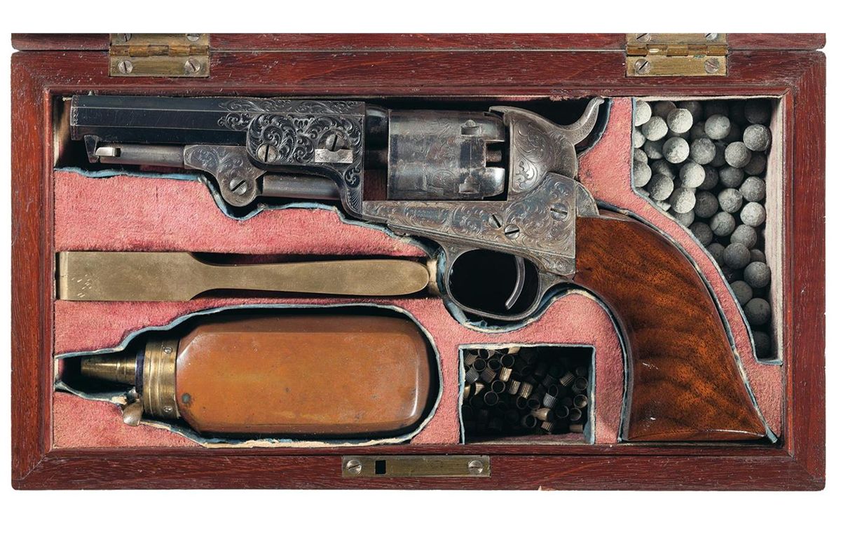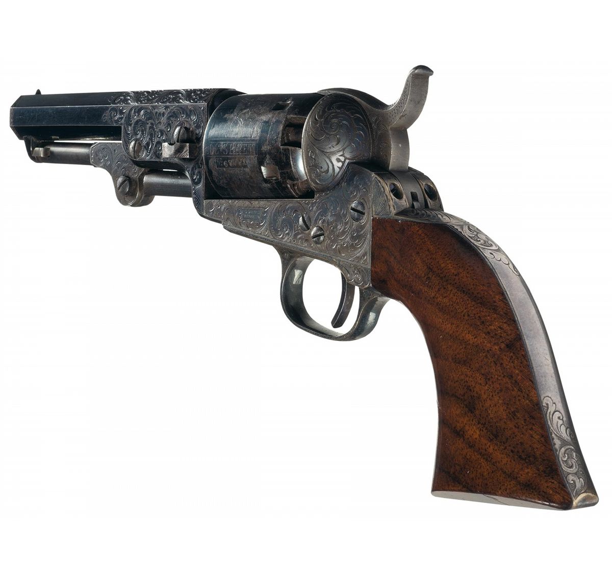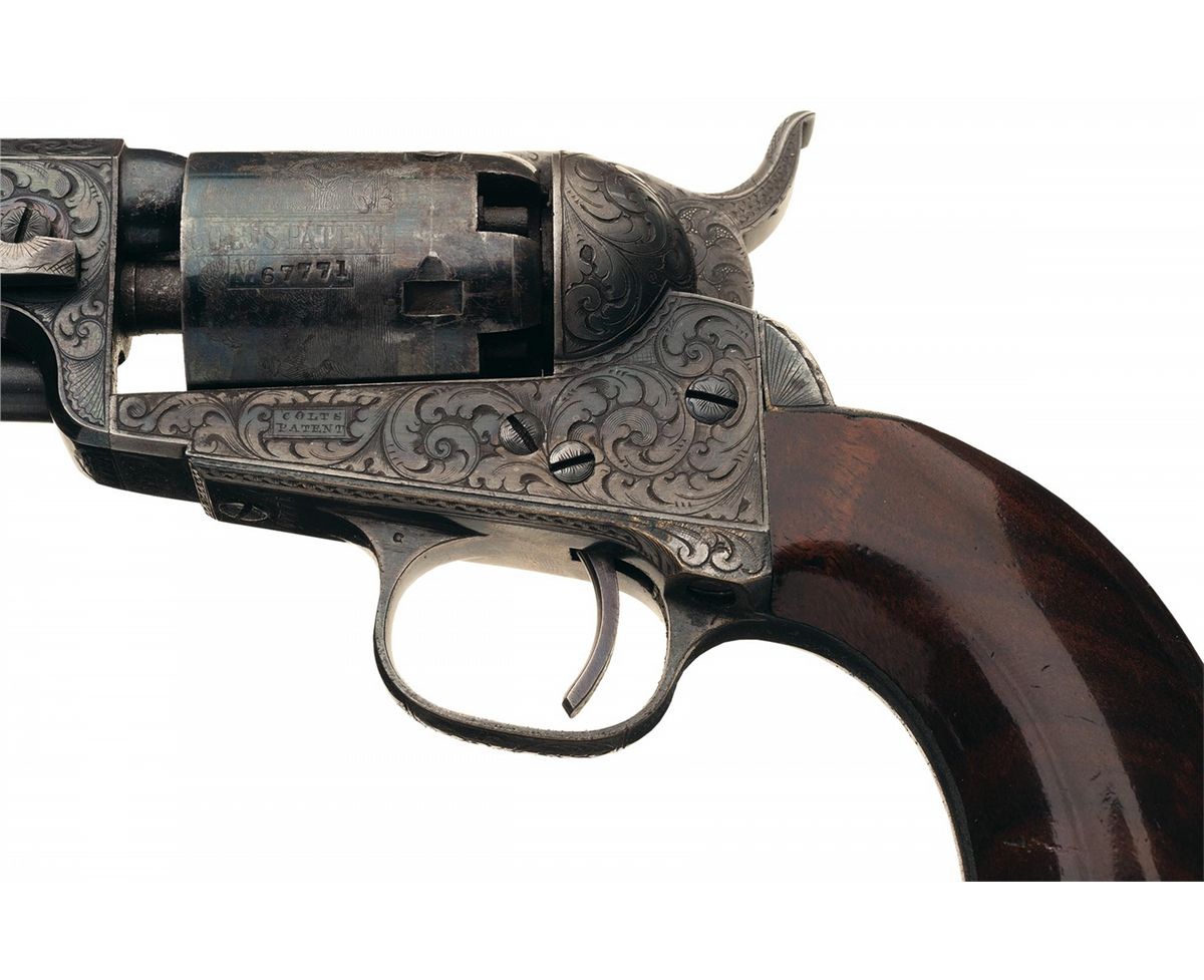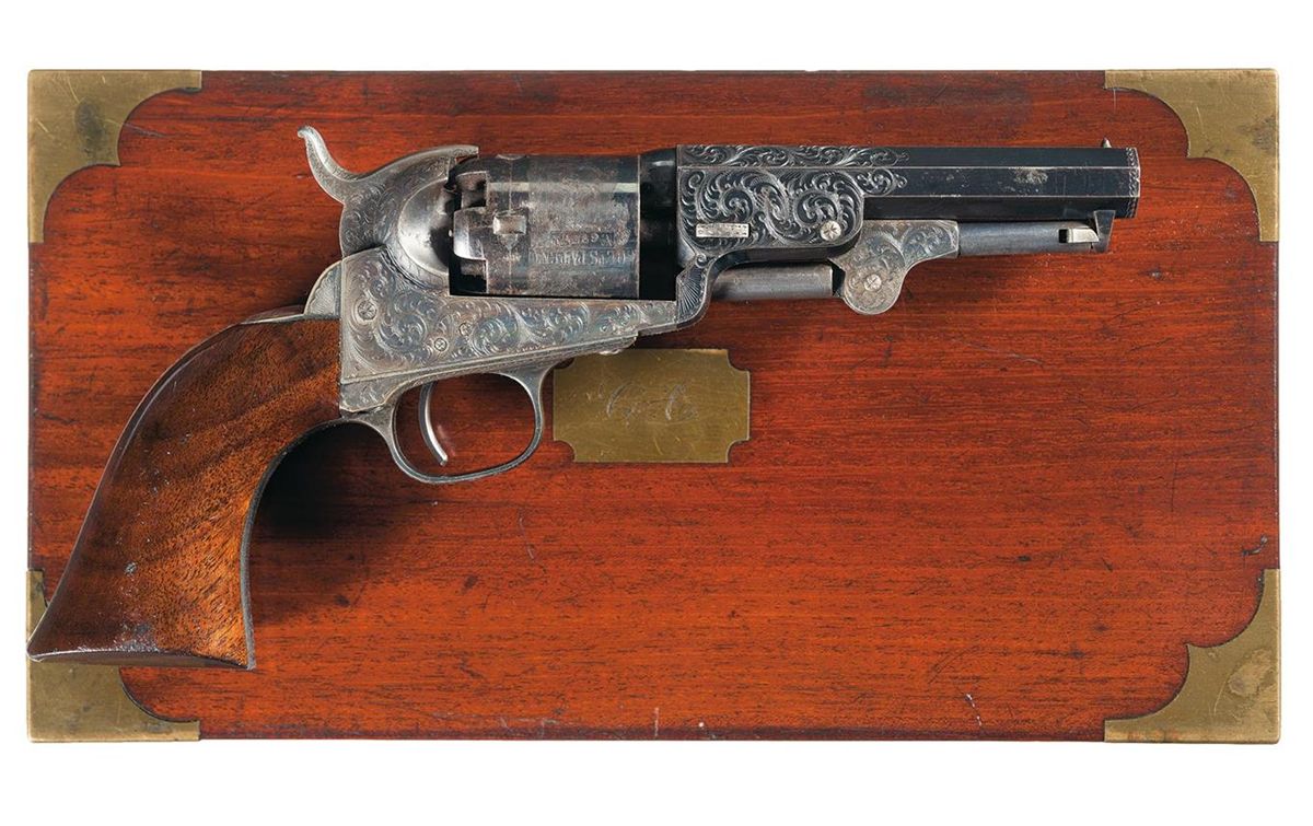 Manufactured in 1853. The revolver has a four inch octagon barrel with loading lever, six-shot cylinder and brass cone shaped front sight. The barrel and cylinder have a high polish blue finish. The loading lever, frame and hammer are color casehardened and the brass trigger guard and back strap have a silver plated finish. The one piece grip is highly figured walnut with a high polish varnish finish. The cylinder is roll-engraved with the Stagecoach Holdup scene. The top of the barrel is presentation engraved "SAML COLT" in the Old English lettering. The revolver has highly detailed scroll engraving on the barrel, loading lever, wedge, frame, hammer, grip straps and on the frame and barrel screws. The engraving appears to be the early work of Master Engraver Gustave Young and features his trademark wolf's head motif on the sides of the hammer. In addition to the Old English Colt legend engraved on the top of the barrel, the left side of the frame has "COLTS/PATENT" engraved in two lines in a rectangle bordered by scrollwork. A punch mark that indicates factory special finish and handling is stamped next to the serial numbers on the barrel, frame and back strap. The full serial number "67771" is stamped on the barrel lug, frame, trigger guard, back strap and cylinder. The partial serial number "7771" is stamped on the loading lever. The revolver is complete with a mahogany French-fitted case with red velvet lining. The case has scalloped brass reinforcements on the corners of the lid and brass bands on the sides. A brass plate inlaid in the lid is engraved with the initials "CA". The case contains 31 caliber lead balls, brass straight leg 1849 Pocket Model bullet mold with "COLTS/PATENT" stamped across the face of both blocks and the small letter "S" stamped on the left block (COLT ACCOUTERMENTS, by Robin Rapley, M#17, page 124), unmarked bottle shaped powder flask with brown lacquer body, gold plated brass top and fixed charger and niter blue spring, blue, L-shaped combination nipple wrench and screwdriver and loose percussion caps. The non Colt case and powder flask are contemporary to the revolver.