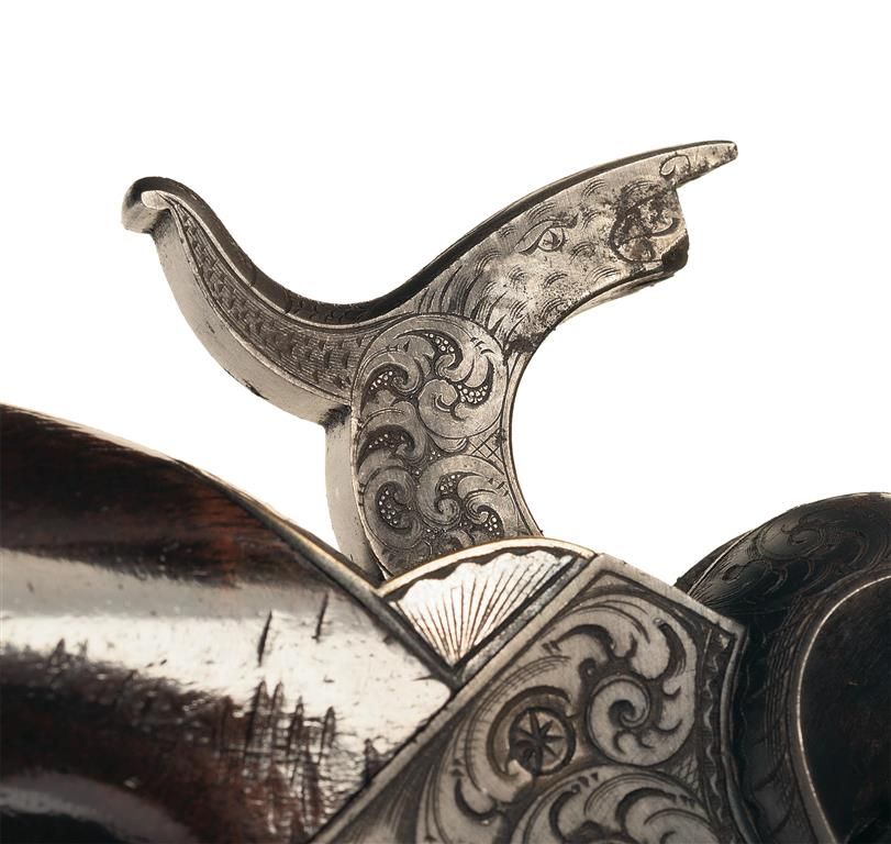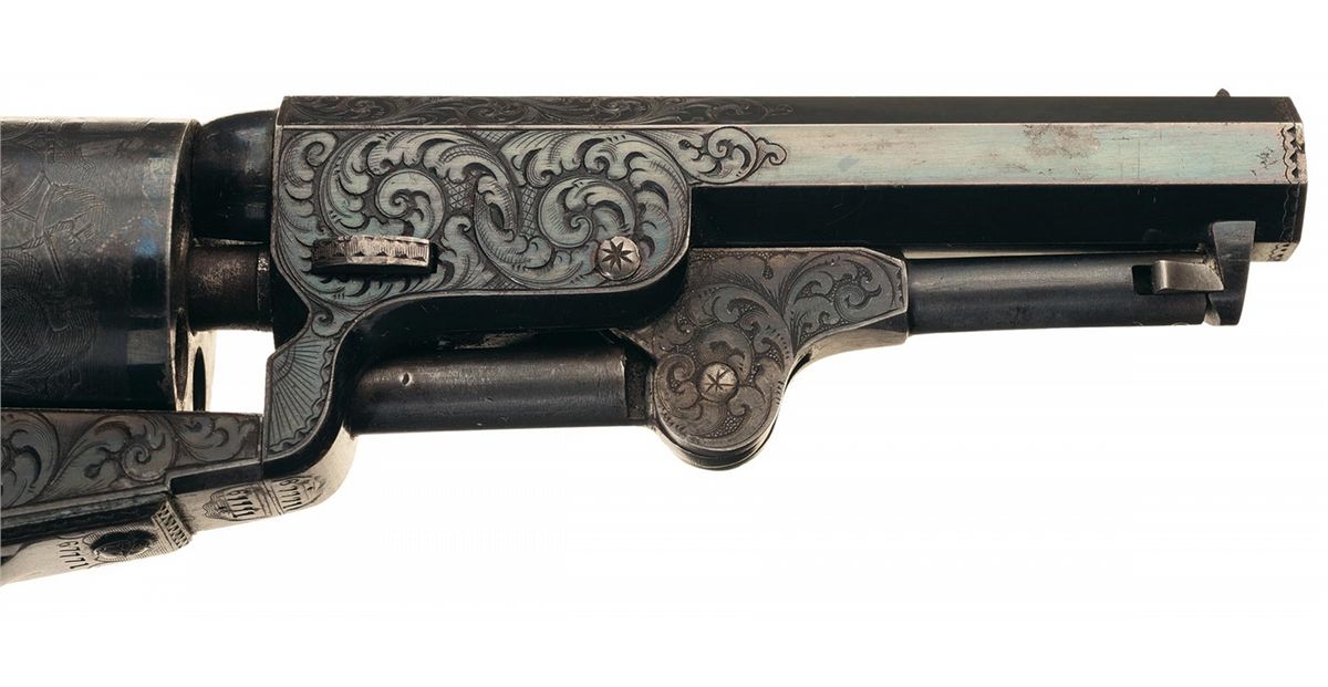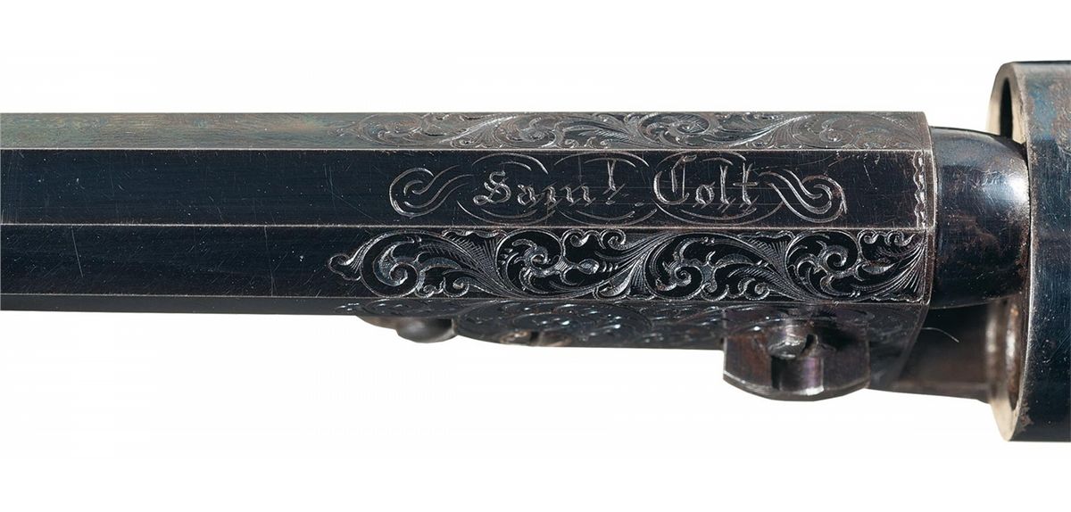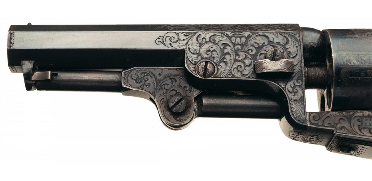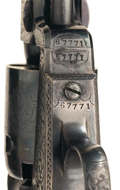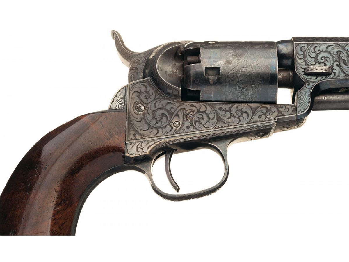 Manufactured in 1853. The revolver has a four inch octagon barrel with loading lever, six-shot cylinder and brass cone shaped front sight. The barrel and cylinder have a high polish blue finish. The loading lever, frame and hammer are color casehardened and the brass trigger guard and back strap have a silver plated finish. The one piece grip is highly figured walnut with a high polish varnish finish. The cylinder is roll-engraved with the Stagecoach Holdup scene. The top of the barrel is presentation engraved "SAML COLT" in the Old English lettering. The revolver has highly detailed scroll engraving on the barrel, loading lever, wedge, frame, hammer, grip straps and on the frame and barrel screws. The engraving appears to be the early work of Master Engraver Gustave Young and features his trademark wolf's head motif on the sides of the hammer. In addition to the Old English Colt legend engraved on the top of the barrel, the left side of the frame has "COLTS/PATENT" engraved in two lines in a rectangle bordered by scrollwork. A punch mark that indicates factory special finish and handling is stamped next to the serial numbers on the barrel, frame and back strap. The full serial number "67771" is stamped on the barrel lug, frame, trigger guard, back strap and cylinder. The partial serial number "7771" is stamped on the loading lever. The revolver is complete with a mahogany French-fitted case with red velvet lining. The case has scalloped brass reinforcements on the corners of the lid and brass bands on the sides. A brass plate inlaid in the lid is engraved with the initials "CA". The case contains 31 caliber lead balls, brass straight leg 1849 Pocket Model bullet mold with "COLTS/PATENT" stamped across the face of both blocks and the small letter "S" stamped on the left block (COLT ACCOUTERMENTS, by Robin Rapley, M#17, page 124), unmarked bottle shaped powder flask with brown lacquer body, gold plated brass top and fixed charger and niter blue spring, blue, L-shaped combination nipple wrench and screwdriver and loose percussion caps. The non Colt case and powder flask are contemporary to the revolver.