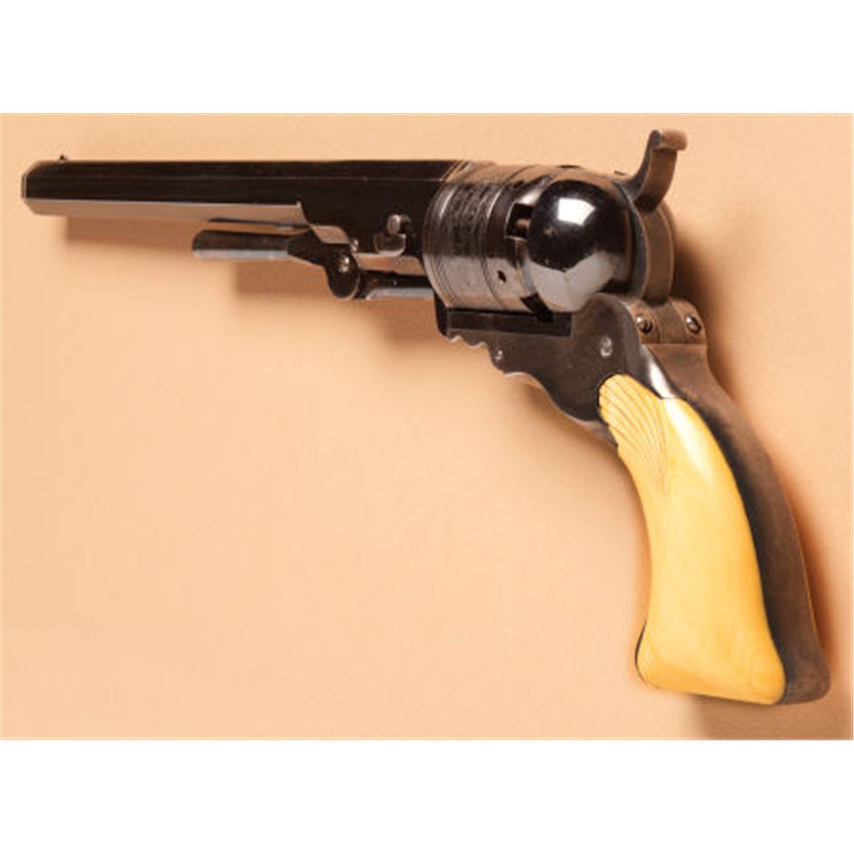 Exceptional, Rare and Fine Cased and Shell Carved Ivory-Gripped Texas or Holster Model No. 5 Paterso