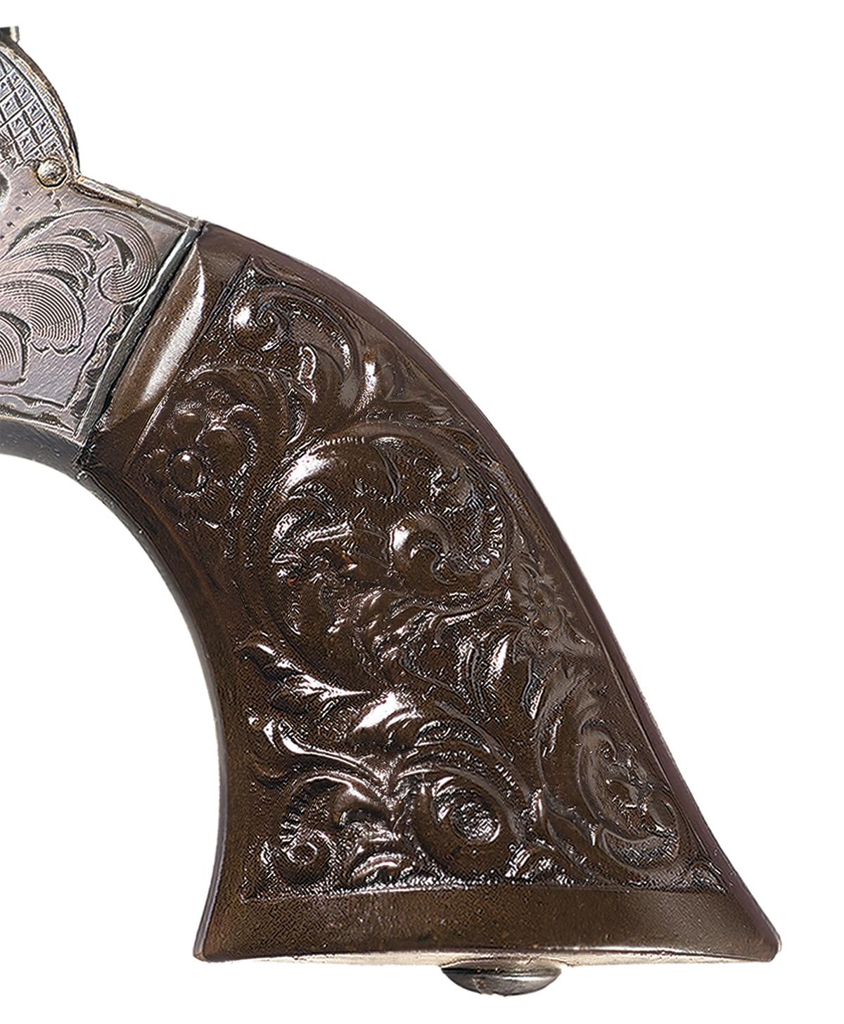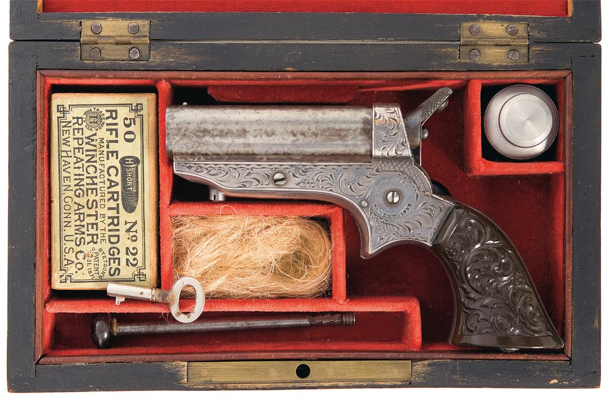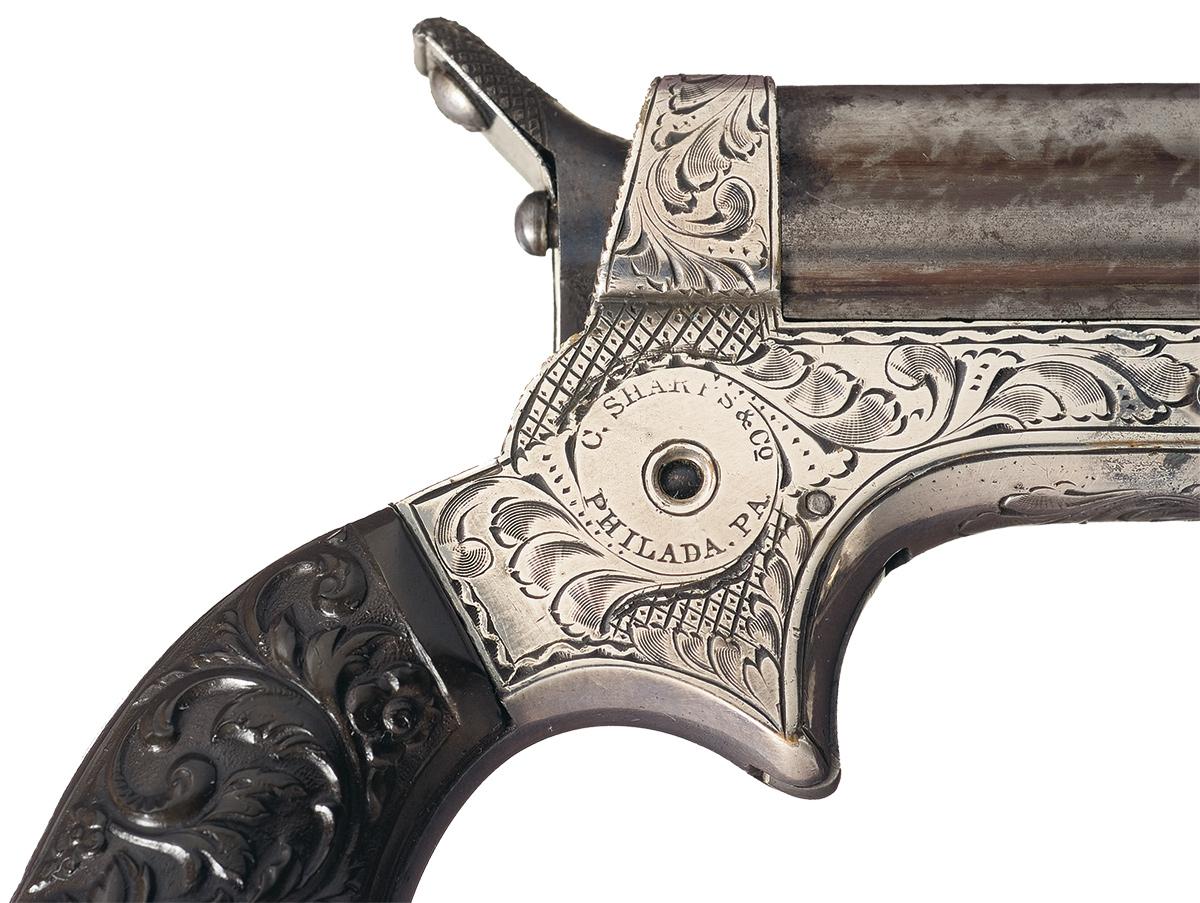 Made between 1859 and 1874. The sides and bottom of the frame feature scroll factory engraving, with a geometric pattern at the rear of the frame. The barrels are brown striped in an irregular pattern like on some Henry Philadelphia Derringers (same city of manufacture, probably same people). The left side of the frame is marked "C. SHARPS / PATENT 1859" and the right side "C SHARPS & Co. / PHILADA, PA". Blue barrels, silver plated frame and fitted with floral carved Gutta Percha grips. The bottom of the barrel is numbered "39085". Complete with a partitioned hardwood case with red velvet lining, oiler, cleaning rod and a 50 count box of Winchester Repeating Arms Co. 22 short bullets.