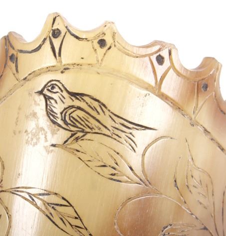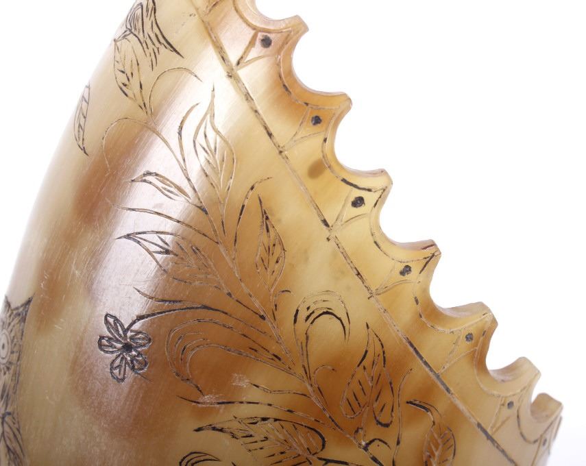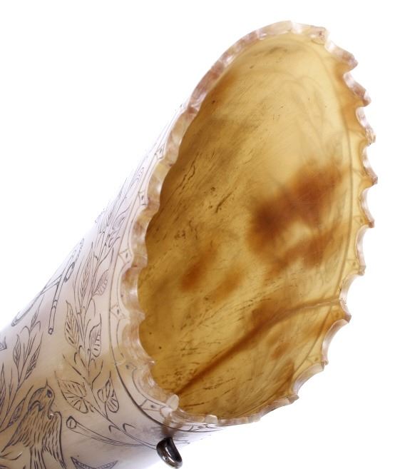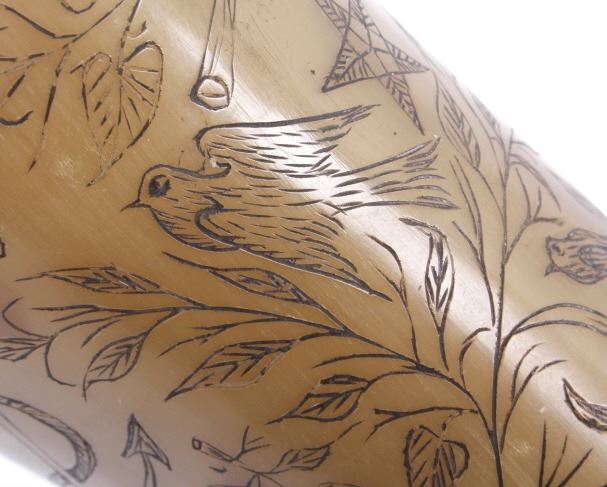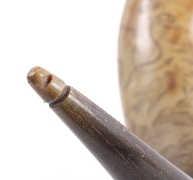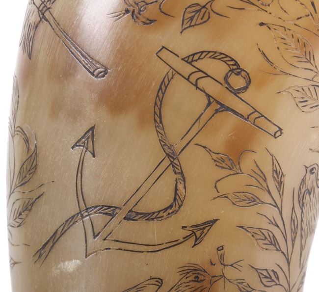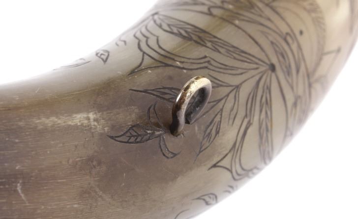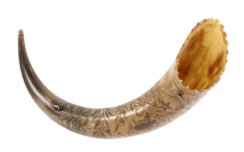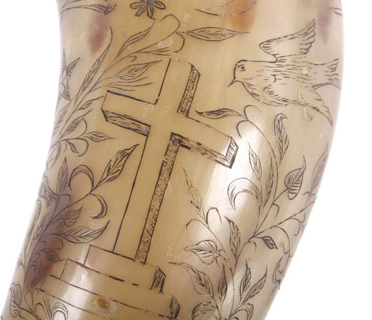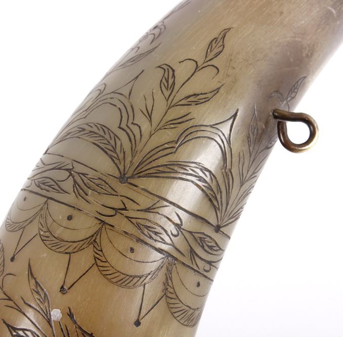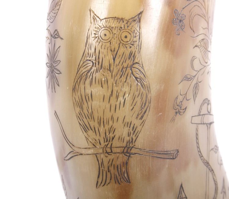 Included for bidding in this lot is an exceptionally crafted scrimshaw steer horn. Starting with the horn itself - you will notice a gorgeous color gradient of rich caramel brown on the tip, which fades to a soft brown/grey, and finally fading into soft khaki, and red near the base. The base of the horn shows gorgeous scalloped edges, with repeating diamonds adorning the high and lows of the rounded edges. The majority of the horn shows an intricate, weaving floral pattern. In addition to the floral pattern, you will see a curious owl, an nautical anchor, a biblical cross - flanked by doves, and scattered small birds. The horn also utilizes two brass eyelet hooks for a shoulder strap. The tip of the horn shows hand carving, but remains solid - attributing this piece to be used as decoration, rather than a powder horn. The horn shows good condition. The piece measures approximately 14" long, 12 1/2" deep, and 4" wide at the base of the horn.