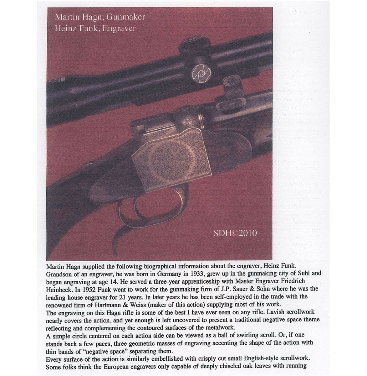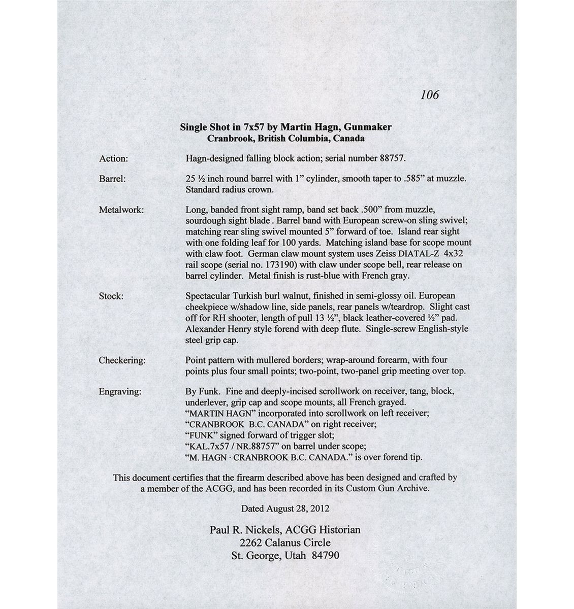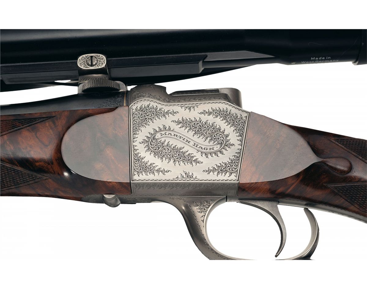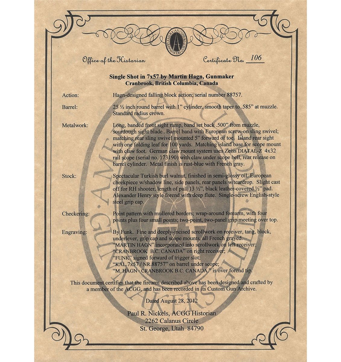 This is a beautiful example of a custom made single shot rifle made by Martin Hagn. Martin Hagn was born in Munich, Germany in 1943. After attending public school he attended the Gunmaker School in Ferlach, Austria from the age of 14 to age 19. He completed 4 years of gunmaking training and 1 year of stockmaking. After graduation he worked for Griffin & Howe in New york until 1966. In 1967 he returned to Germany and worked for Kettner Company and Oberhammer in Cologne, and Krieghoff in Ulm to gain more experience. In 1969 he received his Masters Degree in Munich. From 1970 to 1985 Hagn owns his own shop in Germany where he focused on the Hagn Single Shot rifle, a design for which he is well known for. In 1985 he moved to Canada and has been building custom rifles ever since. This fine rifle features a blue barrel and coin finished remaining parts. The action is nicely engraved with fine floral scroll designs by German engraver Heinz Funk of Eckernforde, Germany. The engraving design extends to the trigger guard/lever, top of the breech block and there is a small wedge on each side of the barrel at the breech with a gold inlaid band. The sides of the action are engraved "MARTIN HAGN" in a banner, the serial number is engraved on the lower tang and signed "FUNK" in front of the trigger. The barrel is fitted with a ramped blade front sight and folding leaf rear sight with "100" meter marking and gold sighting line, and has a Zeiss Diatal-Z 4x32 scope mounted on claw type bases. The sides of the scope mounts are engraved with the same design. The top of the barrel is engraved "KAL. 7 x 57 NR. 88575" at the breech and "M. HAGN GRANBROOK B.C. CANADA." ahead of the rear sight. There is a sling swivel mounted on a barrel band ahead of the forearm and there is a tang mounted safety. Mounted with a beautiful checkered Turkish burl walnut forearm and pistol grip stock with teardrop flats, engraved metal grip cap, cheek piece, sling swivel and leather wrapped recoil shield. The screw heads on the sling swivels are engraved with a floral design. The included American Custom Gunmakers Guild certificate from the Office of the Historian certifies that the firearm described has been designed and crafted by a member of the ACGG and has been recorded in its Custom Gun Archive. The certificate confirms the features described including the Funk engraving. Also included are letters from Hagn Rifles & Actions regarding this rifle.