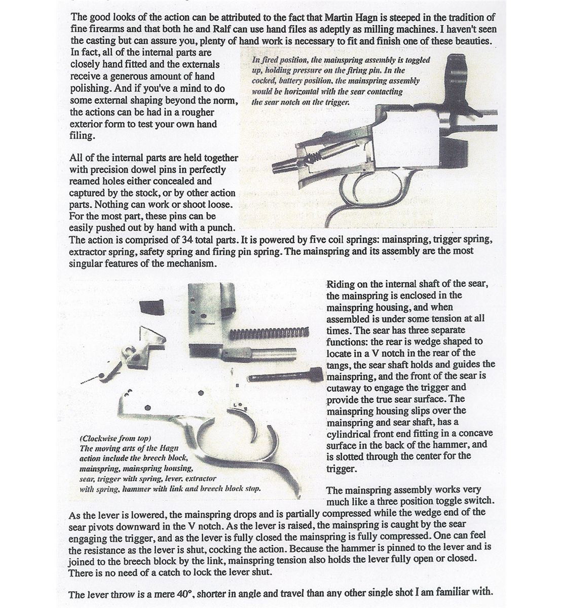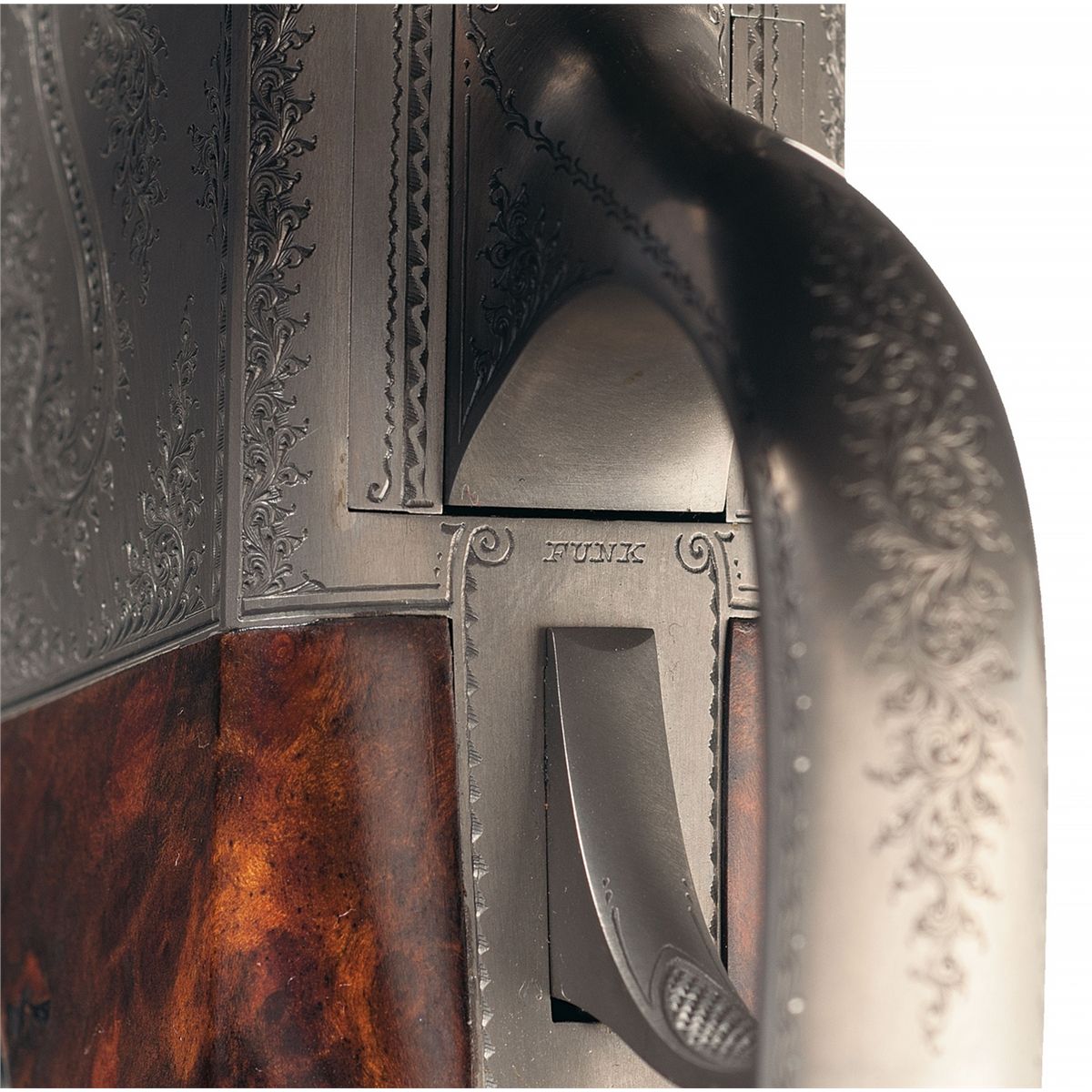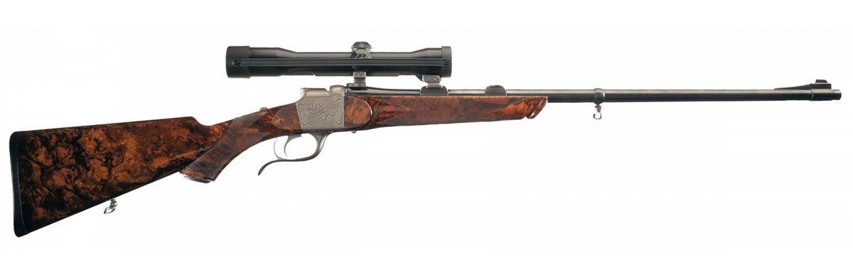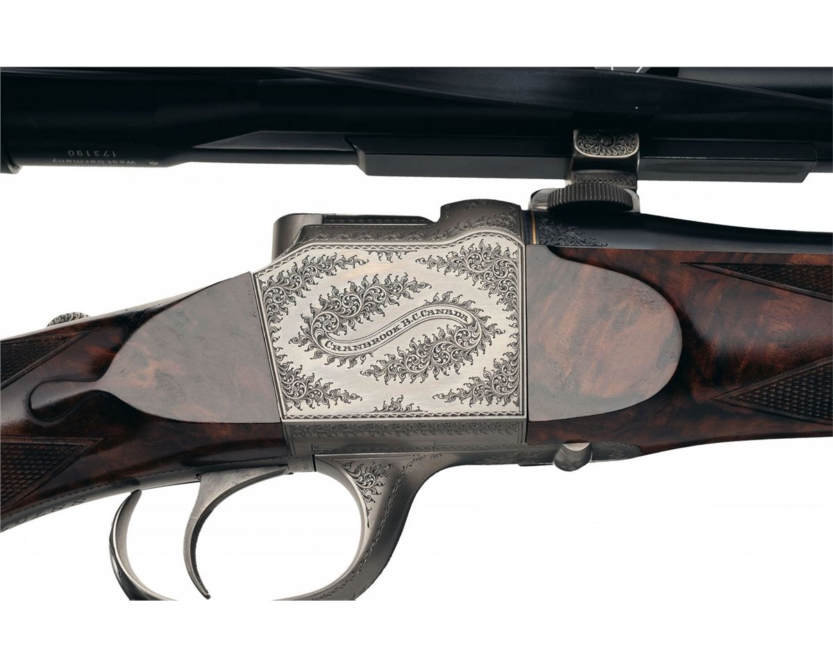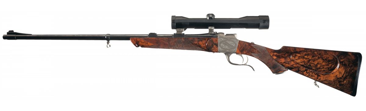 This is a beautiful example of a custom made single shot rifle made by Martin Hagn. Martin Hagn was born in Munich, Germany in 1943. After attending public school he attended the Gunmaker School in Ferlach, Austria from the age of 14 to age 19. He completed 4 years of gunmaking training and 1 year of stockmaking. After graduation he worked for Griffin & Howe in New york until 1966. In 1967 he returned to Germany and worked for Kettner Company and Oberhammer in Cologne, and Krieghoff in Ulm to gain more experience. In 1969 he received his Masters Degree in Munich. From 1970 to 1985 Hagn owns his own shop in Germany where he focused on the Hagn Single Shot rifle, a design for which he is well known for. In 1985 he moved to Canada and has been building custom rifles ever since. This fine rifle features a blue barrel and coin finished remaining parts. The action is nicely engraved with fine floral scroll designs by German engraver Heinz Funk of Eckernforde, Germany. The engraving design extends to the trigger guard/lever, top of the breech block and there is a small wedge on each side of the barrel at the breech with a gold inlaid band. The sides of the action are engraved "MARTIN HAGN" in a banner, the serial number is engraved on the lower tang and signed "FUNK" in front of the trigger. The barrel is fitted with a ramped blade front sight and folding leaf rear sight with "100" meter marking and gold sighting line, and has a Zeiss Diatal-Z 4x32 scope mounted on claw type bases. The sides of the scope mounts are engraved with the same design. The top of the barrel is engraved "KAL. 7 x 57 NR. 88575" at the breech and "M. HAGN GRANBROOK B.C. CANADA." ahead of the rear sight. There is a sling swivel mounted on a barrel band ahead of the forearm and there is a tang mounted safety. Mounted with a beautiful checkered Turkish burl walnut forearm and pistol grip stock with teardrop flats, engraved metal grip cap, cheek piece, sling swivel and leather wrapped recoil shield. The screw heads on the sling swivels are engraved with a floral design. The included American Custom Gunmakers Guild certificate from the Office of the Historian certifies that the firearm described has been designed and crafted by a member of the ACGG and has been recorded in its Custom Gun Archive. The certificate confirms the features described including the Funk engraving. Also included are letters from Hagn Rifles & Actions regarding this rifle.