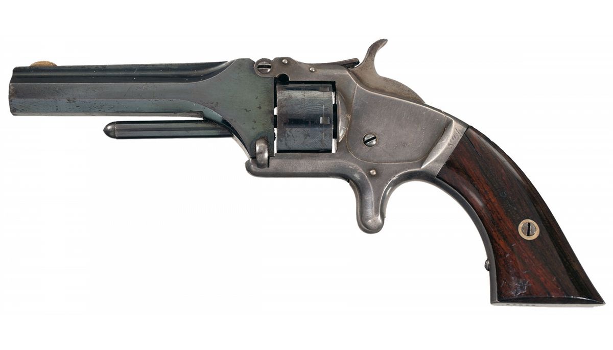 Manufactured 1860 to 1868, this is an excellent example of the most desirable pocket pistols manufactured. The top of the barrel rib is marked with the one line address, the cylinder is marked with the 1855 and 1859 patent dates, and the serial number is marked on the butt and stamped on the inside of the right grip panel. Blue barrel, ejector and cylinder, casehardened hammer and trigger, and silver plated frame. Fitted with smooth two-piece varnished rosewood grips.