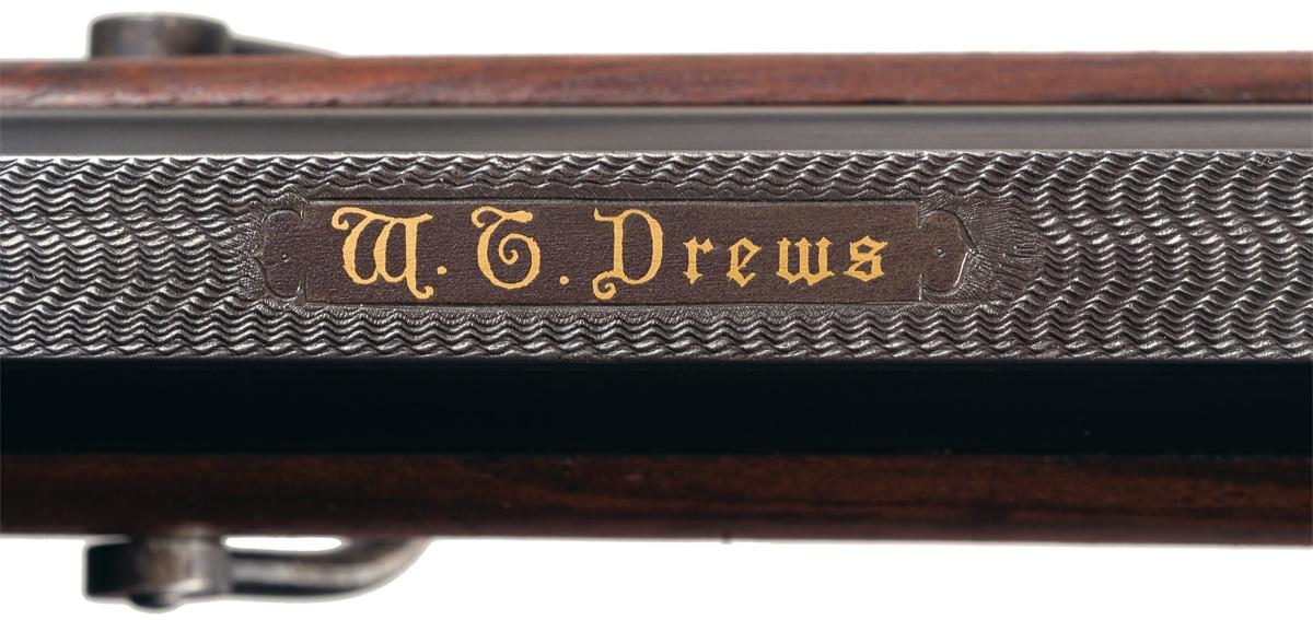 Silver bead front and 1000 meter tangent rear sights, with "Antinit" on the left side of the chamber and "W.G. Drews" inlaid in gold on top of the rib. Standard receiver markings, with butter knife bolt, double set triggers and casehardened trigger base. Checkered half length stock with sling swivels, shadow-line cheekpiece and serrated buttplate.