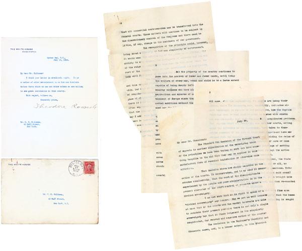 STANDARD OIL CASE, THE “DESPOTS” WITH JUDICIAL POWER, CORPORATE CONTROL & POWER, CONCENTRATION OF WEALTH AND EVEN THE DRED SCOTT DECISION DISCUSSED Typed Letter Signed. “Theodore Roosevelt”; Oyster Bay, N.Y., July 25, 1908. 1 page on White House stationary. Includes the original typed letter-press copy of the missive to which Roosevelt, the “Trust Buster” was responding. Addressed to Reuben D. Silliman, a Wall Street Jewish lawyer and former Circuit Court judge, who was influential both the presidencies of Teddy Roosevelt and William Taft. With the inclusion of the original letter sent to Roosevelt, a rare occurrence when collecting presidential letters, we can gather the full scope and depth of what the president meant in his reply when he emphasizes: “I think your letter is absolutely right. It is a matter of utter astonishment to me how men hesitate before facts which we cannot blink unless we are willing to see some grave convolutions in this country...” The Republican 1908 convention had just been held a month before, and it was a foregone conclusion William H. Taft would be the party’s nominee. Two years earlier, Roosevelt had “busted” Standard Oil’s monopoly. Roosevelt was on his way out. His last two years in office he grew increasingly distrustful of big business, despite its close ties to the Republican party in every large state. Public opinion had been shifting to the left after a series of scandals, and big business was in bad odor. Abandoning his earlier caution and conservatism, Roosevelt freely lambasted his conservative critics and called on Congress to enact a series of radical new laws — the Square Deal — that would regulate the economy. In this exceptional letter his friend Silliman covers deeply important matters of the day that reflect on the Justice system and reminds us of just how in a span of a 100 years, few things change: Silliman’s four page letter: Dear Mr. President: The Standard Oil decision of the Circuit Court of Appeals is another illustration of the underlying truth of the principles we have been trying to work out into something tangible to the end that they may be applied in some satisfactory form of remedial legislation or otherwise made effective. That decision shows how wholly negative is the action of the courts. It demonstrates, and to my mind it demonstrates conclusively, that the root of the disappointments experienced by the people and your administration is in the present character of the court control of commerce under a divided sovereignty. I am not sure that it is right to speak of a “divided sovereignty” any longer. May we not as well concede at once that if the courts and the vested interested are able to maintain their present position there is not only a single sovereignty but that it finds lodgement in the singularly complicated, far removed and negative action of the courts? The decisions in the Employer’s Liability and Minnesota cases, and, to a lesser extent, in the Standard Oil case, show how repressively the courts are using their powers, while the Minnesota case, especially, indicates almost humorously in certain of its paragraphs, how the Supreme Court has come to feel that it alone is vested with wisdom and can adequately deal with the country’s complicated problems. The Supreme Court and nearly all the inferior courts, acting under the influence of its leadership, have taken to themselves somewhat of the airs of benevolent despots and have exercised with the sublime confidence of one holding the reins of arbitrary power, and largely in the interest of more or less corrupt vested interests, the delicate privilege of setting at naught the people’s will as expressed through the action of the other coordinate branches of government. The Congress, the Attorney General, the State Legislatures, the State Attorneys General, one or all, no longer have the wisdom to deal with property questions. Nothing is even supposed to be settled (I had almost said sound) until, having been enacted as legislation, it is brought into court, negatively examined and re-examined, and then re-enacted and examined again. So on ad infinitum. The process has developed the most fine spun and interminable system of perpetuating iniquity that the human mind has yet devised. While one scheme of swindling is sought to be reached a new form is devised. But the property of the country continues to pass into the control of fewer and fewer hands, until today the welfare of every man, woman and child is to a large extent capable of being deeply influenced by the caprice of a few wealthy citizens who have already transferred their social aspirations and spheres of action to the more congenial environment of Europe where they are free to express their abnormal ambition without the criticism of those who finally must pay the bills. If there is to be any independent manhood in this country the tendency toward consolidation must be checked even if the prevailing system of corporate control and ownership has to be rooted out at its foundations. What re property improvements worth if the final end of is all is monopoly and the one man control of all avenues of employment? A dependent people is necessarily servile. A servile people is never happy. I still believe, and I am sure that you agree with me, that the constitution originally contemplated one sovereign power qualified to act in the field of national commerce when and to the extent that the Congress, in its wisdom, should find the conditions of the country required it. This does not mean that the government of the country is to be concentrated on the banks of the Potomac, nor that all commercial controversies can be transferred into the federal courts. Those matters will continue to be subject to the discretionary control of the congress and there need be little, if any, change in the machinery of our government. The recognition of the principle would, however, bring about uni