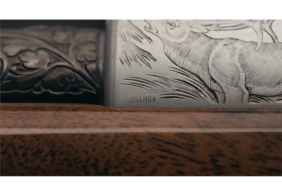 Manufactured in 1973 in Belgium, this rifle features a blue barrel manufactured without sights and French grey finish on the remaining parts. The follower and bolt assembly are polished, and the trigger is gold washed. The front receiver ring is engraved with a bugling elk on the left side, a running deer on the right side and the remainder of the action is floral vine leaf and punch dot engraved. The both sides of the receiver are signed "N WATRIN". The hinged floor plate engraved with a deer in a wooded scene with floral leaf engraving below and on the attaching metal and signed "A MARECHAL" below the deer. The trigger guard is engraved with a bear with a floral leaf pattern above and below, with "DR" below the bear. There is a two inch wedge of floral leaf engraving on the breech end of the barrel sides. The screw heads and stock bolts are also engraved with a leaf design. The stock is extra fancy select walnut with a high gloss finish, fine line checkering and floral and punch dot hand carving on the forearm and grip area, contrasting forend and grip cap with a diamond shaped brass inset on the grip cap, raised comb, cheekpiece, vented Browning recoil pad and sling swivel studs.