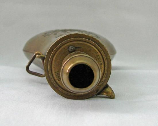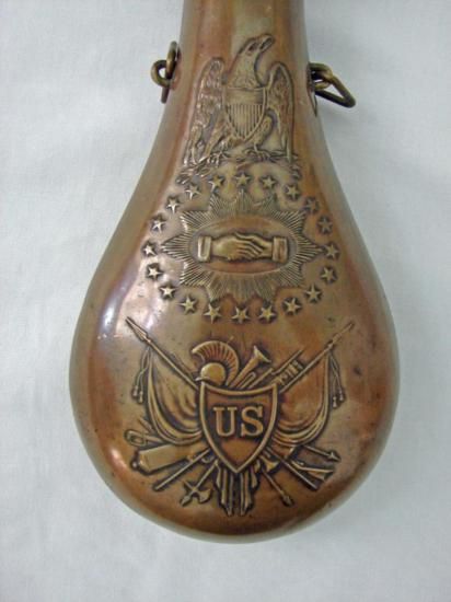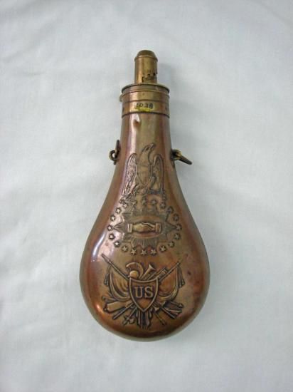 U.S. 1850 brass ~Peace~ powder flask marked ~BATTY, ADK, 1850~ on spout base, ~K~ on spout ferrule. _LENGTH 9 inches. Provenance: Property deaccessioned from the Centennial Museum at the University of Texas at El Paso to benefit the Museum Collections Fund. (Accession #54.22.3 and H1038 inked on spout ferrule) __Literature: Houze, Herbert G. THE SUMPTUOUS FLASKE: EUROPEAN AND AMERICAN DECORATED POWDER FLASKS OF THE 16TH TO THE 19TH CENTURIES. Cody, WY: Buffalo Bill Historical Center, 1989. pp.134-35.