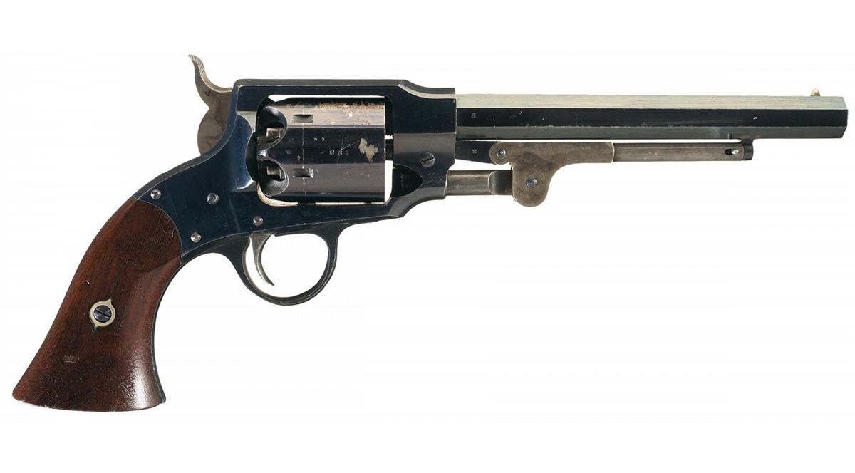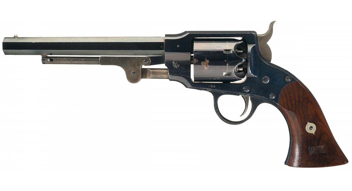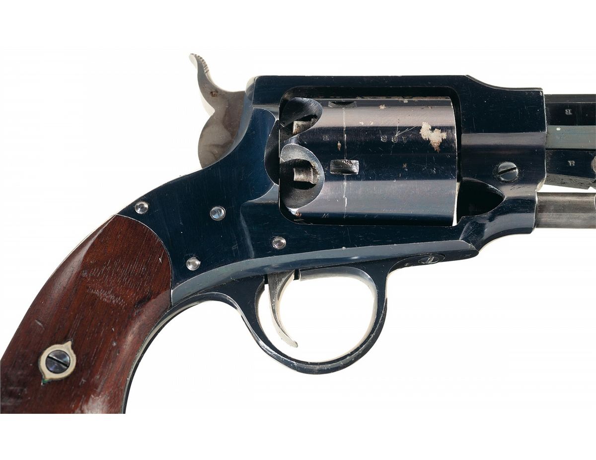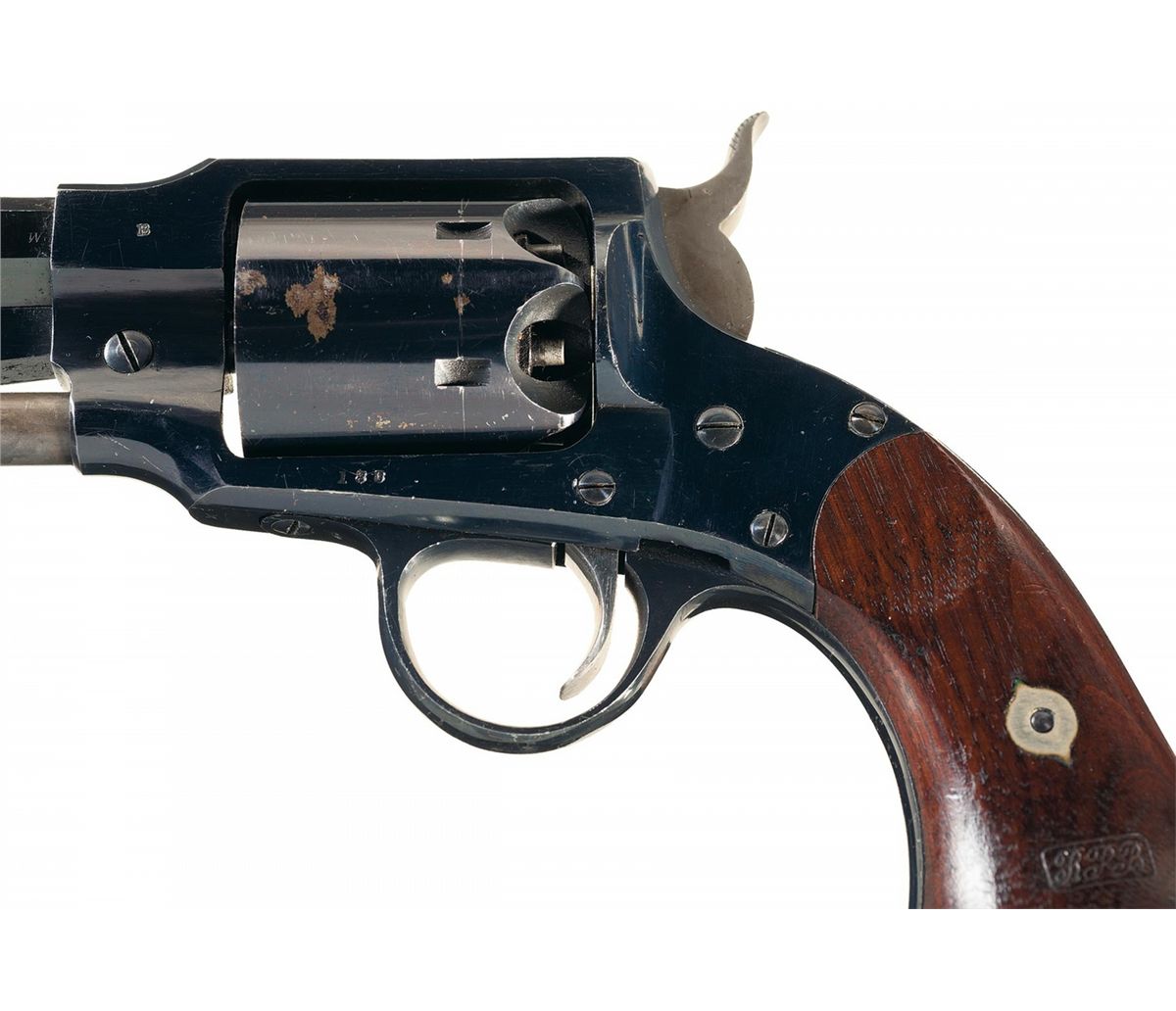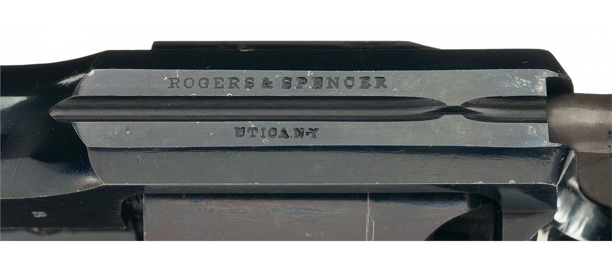 This is an excellent example of one of the approximately 5,800 percussion revolvers manufactured circa 1863-65 by Rogers & Spencer of Willowdale, New York (which is near Utica). The U.S. Ordnance contract was for 5,000 revolvers, 1,500 to be delivered by the end of April 1865 and the balance by September of 1865. There is no record of issuance of any of the revolvers, due to the Civil War ending. The top strap is marked "ROGERS & SPENCER/UTICA NY". The matching serial number is marked on the bottom barrel flat, left side of the frame, cylinder and on the butt. There are small single letter "B" inspection mark on most of the parts, "W" on the left rear barrel flat and bottom of each grip panel and an "X" on the bottom of the frame ahead of the trigger guard. The revolver is finished blue with a casehardened hammer and loading lever assembly and bright trigger. Brass cone front, frame notch rear sights and fitted with smooth walnut grips with a sharp "RPB" cartouche on the lower left panel.