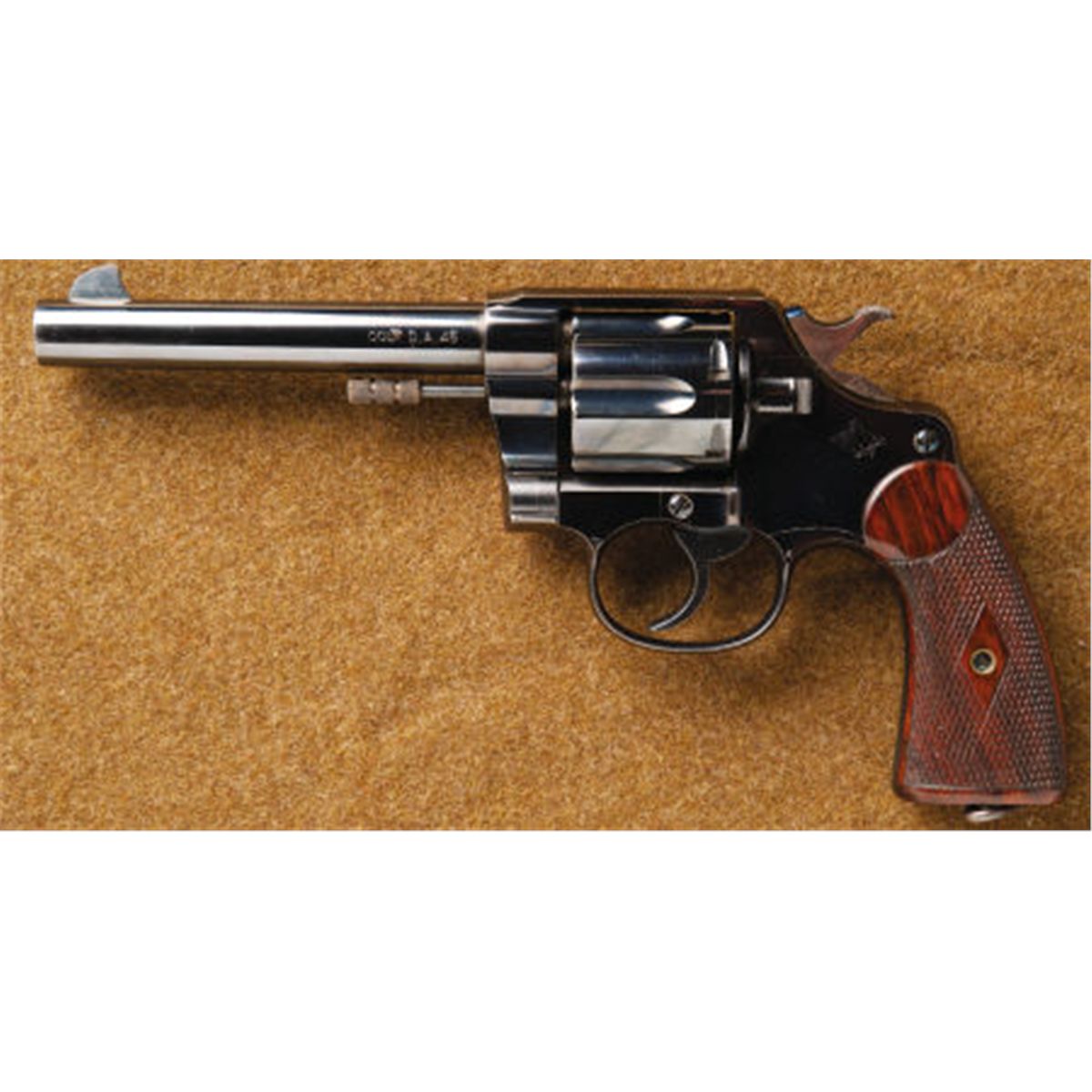 *Exceptional U.S.M.C. Colt New Service Model 1909 Double Action Martial Revolver. Serial no. 24639, .45 Colt caliber, 5 ½-inch barrel with standard address. Blued finish. Checkered walnut grips. Martially marked on butt, dated lanyard ring. Manufactured in 1910. 1,300 of this model were manufactured for the United States Marine Corps.Condition: Excellent to mint with minor flaking in spots on barrel and lower portion of gripstrap. Grips excellent. Action crisp.