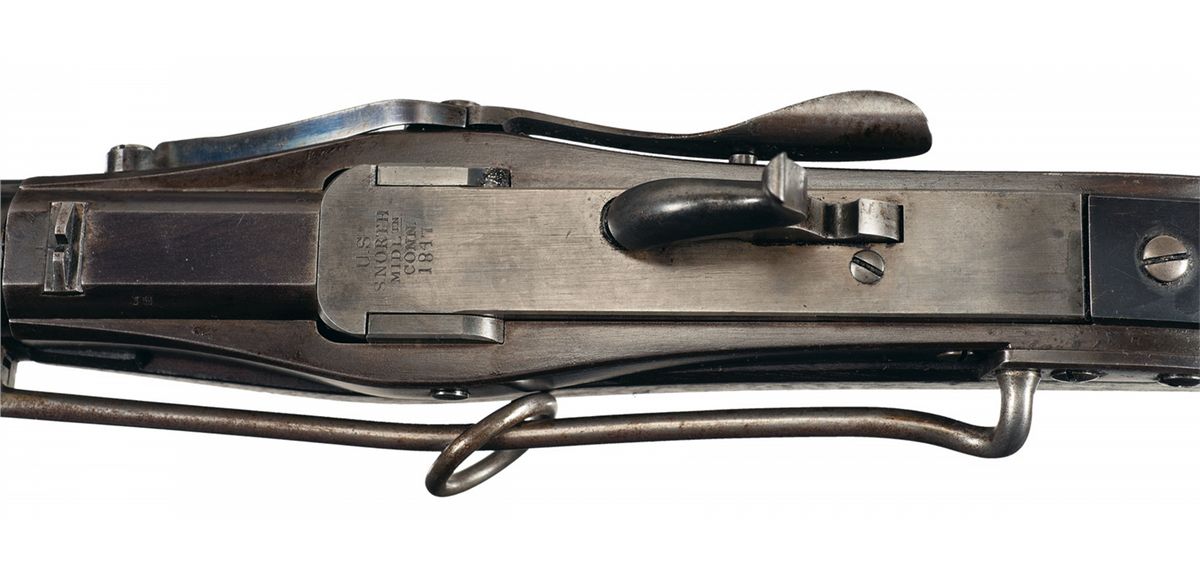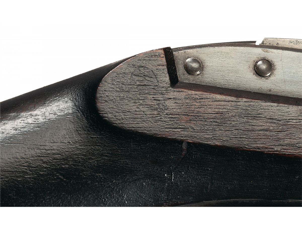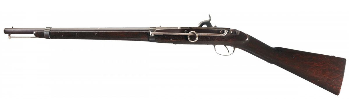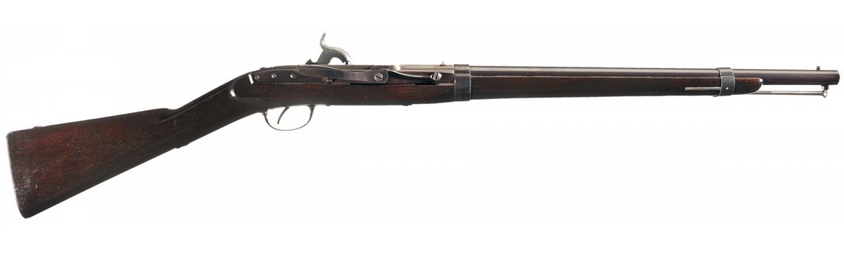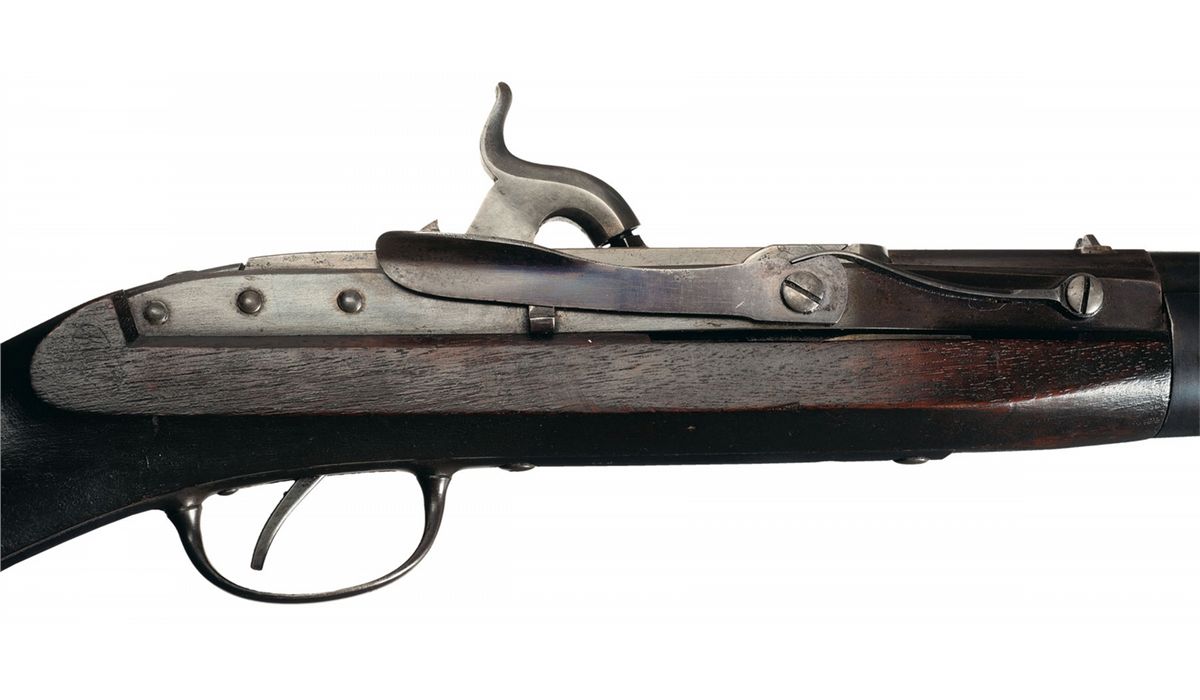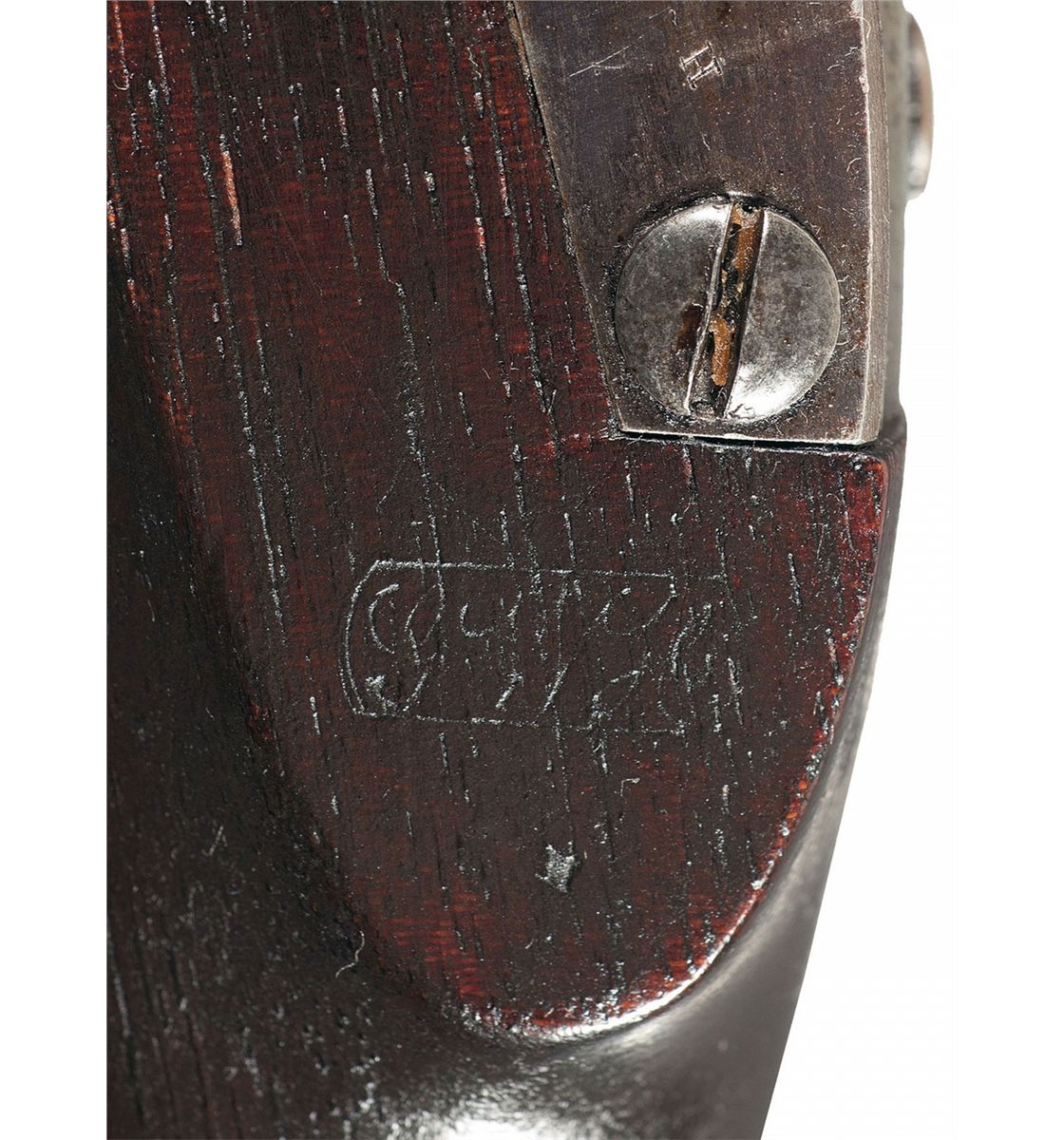 Also known as the "Side Lever Hall", Simeon North manufactured approximately 10,500 of these carbines between 1844 and 1855. The top of the breechblock is marked "U.S./S. NORTH/MIDLTN/CONN./1847" and the left rear of the barrel is marked "JH". There is a small "H" on the lower tang behind the trigger guard. The carbine has the breechblock thumb lever that was finished in bright niter blue on the right side of the receiver and extended sling bar and ring on the opposite side. Fixed post and notch sights and iron cleaning rod. The breech block and hammer are casehardened and the remaining metal parts are finished with brown lacquer. Mounted with a smooth one-piece full straight grip stock, secured by two barrel bands and smooth flat iron buttplate. There is a boxed "GWH" cartouche on the left flat. The Model 1843 Hall/North Carbine was the last of the Hall carbines and rifles issued by the U.S. Army. Model 1843 Hall carbines were carried by U.S. Dragoons during the Mexican War and continued in service through most of the Civil War, being issued to many cavalry units in Illinois, Missouri and Kansas, as well as the 4th Arkansas,5th Iowa, 2nd Wisconsin, 1st Indiana and 8th and 9th New York.