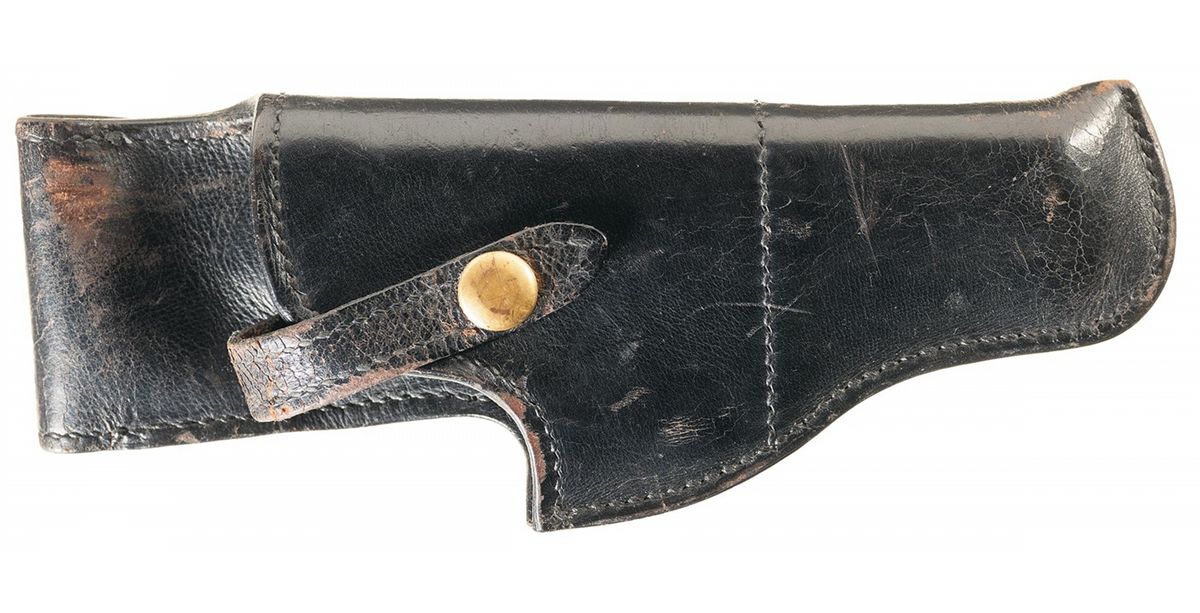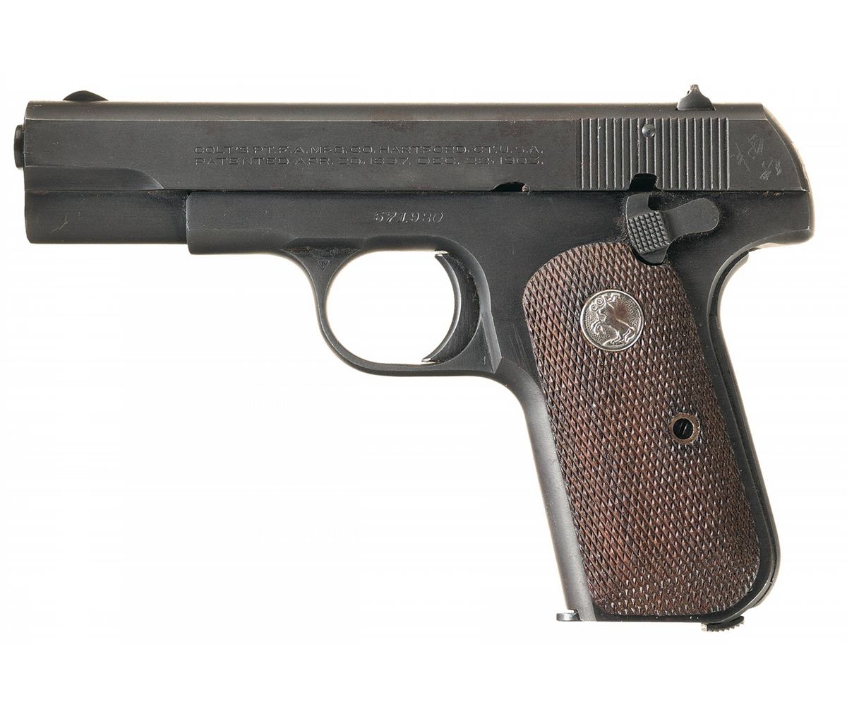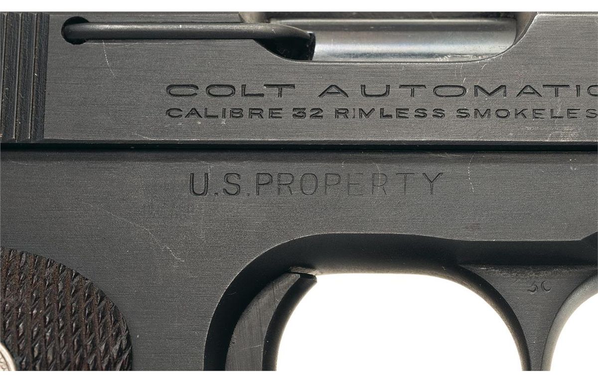 Manufactured in 1945. The pistol has the Colt "Parco-Lubrite" finish introduced in 1945, full blue barrel, checkered oil finished walnut grips with nickel silver Rampant Colt medallions and full blue eight shot magazine. The slide has the late flat top rear sight and wide ramp front sight with serrated face. The right side of the frame is roll stamped "U.S. PROPERTY". The serial number, "571930" is roll stamped on the left side of the frame above the trigger. The Colt "Triangle/VP" proofmark is stamped on the upper left corner of the trigger guard bow and a "4" assembler's mark is stamped on the lower left corner. The Ordnance escutcheon acceptance mark is lightly stamped on the left side of the frame behind the slide lock. The right side of the slide is roll stamped "COLT AUTOMATIC/CALIBRE 32 RIMLESS SMOKELESS" in two lines below the ejection port. The elongated two-line Hartford address and 1897 and 1903 patent dates are roll stamped on the left side of the slide and the Rampant Colt is stamped behind the serrations. The bottom of the magazine floor plate is stamped "CAL 32/COLT". The pistol is complete with a General Officer's black leather open top holster with gold plated brass fittings. A total of 2,368 Colt .32 Pocket Automatic Pistols were issued to U.S. Army General Officers between 1950 and 1972.
