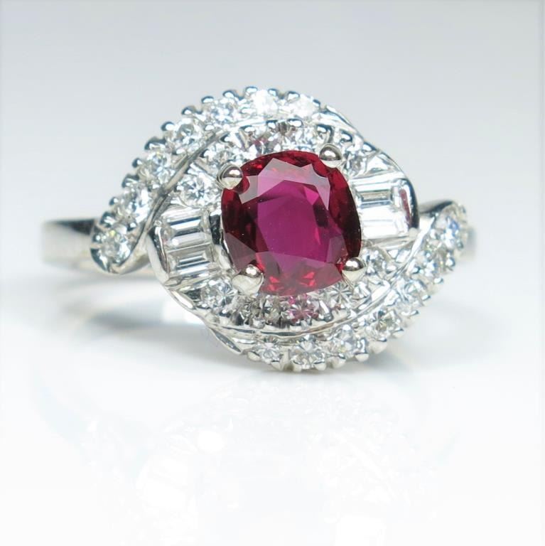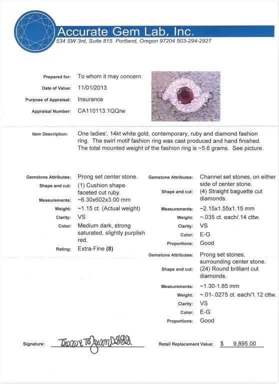 featuring a 1.15 carat Extra Fine Ruby with VS clarity set in a stunning swirl design with 4 baguette and 24 round cut accent Diamonds weighing 1.26 carats with Fine E-G colors and VS clarity set in 14 karat white gold. Full Appraised Value - $10,000.00