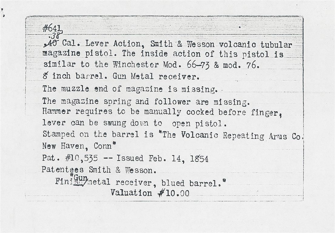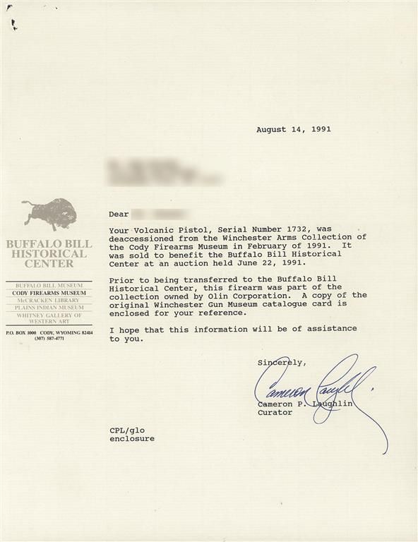 This is a very fine example of a historic Navy size lever action pistol manufactured by the Volcanic Repeating Arms Co., c. 1856. The pistol is complete with a letter from the Buffalo Bill Historical Center that states it was formerly part of the Winchester Gun Museum and was deaccessioned from the Winchester Arms Collection of the Cody Firearms Museum and sold at auction in June 1991. The pistol has the distinctive blue octagon barrel with integral magazine, gun metal receiver and casehardened lever with finger hole. The barrel has a brass cone front sight. A fixed rear sight is mounted in a dovetail on the receiver. The casehardened hammer has a knurled spur. The two piece flat bottom walnut grips have a high polish varnish finish. The top barrel flat is roll stamped "THE VOLCANIC/REPEATING ARMS CO./PATENT NEW HAVEN CONN. FEB. 14. 1854" in three lines. The barrel legend indicates that the pistol was manufactured by the Volcanic Repeating Arms Co., before the firm was reorganized as the New Haven Arms Co., by Oliver Winchester in April 1857. The serial number, "1732" is stamped on the right side of the lever, the right side of the butt underneath the grip and on the inside of both grips. All of the visible serial numbers match. The Volcanic pistols and carbines were revolutionary firearms which combined a primed self contained rocket ball cartridge, integral magazine and repeating lever action. The Volcanic pistols and carbines drew shirt maker Oliver Winchester into firearms manufacturing. The Volcanic lever action and integral magazines were refined to serve as the basis for the successful New Haven Arms Co., Henry lever action rifles and the Winchester Model 1866, Model 1873 and Model 1876 rifles.