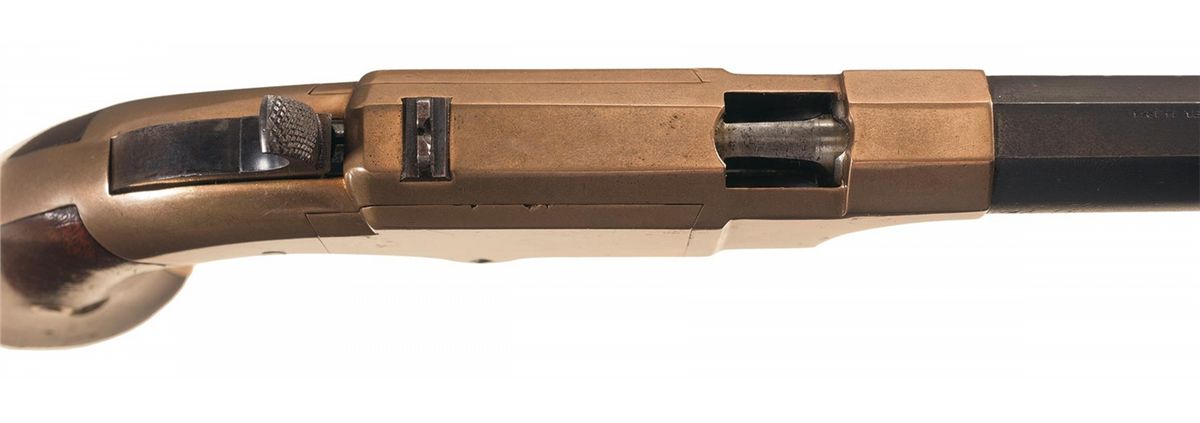 Extremely fine. The barrel and integral magazine retain at least 90% of the original blue finish. The barrel has some very minor edge wear at the muzzle and numerous shallow wide dents present on both sides adjacent to the receiver. The blue has developed a slight plum colored patina. Most of the niter blue finish is present on protected areas of the cartridge elevator and bolt. The hammer and lever retain 80% of the original case colors which have faded to a mottled gray-brown patina. The brass frame and side plates are in fine condition with a few scattered handling marks (removal of the grips exposed much remaining silver plating). There are three very small dents in the top of the right side plate but the joints of both side plates are tight. The follower is a period replacement. The grips are very fine and retain nearly 90% of the original varnish finish. The grips have minor handling marks; the right grip has slightly more wear with a shallow dent next to the screw escutcheon, a small chip at the back edge and finish loss along the heel. Wear on the left grip is limited to some minor handling marks and some varnish wear along the heel. The barrel markings and serial numbers are sharp. This is a historic example of a historically significant Volcanic Repeating Arms Co., Lever Action Navy Pistol from the Winchester Gun Museum. It would be hard to improve on this outstanding pistol.