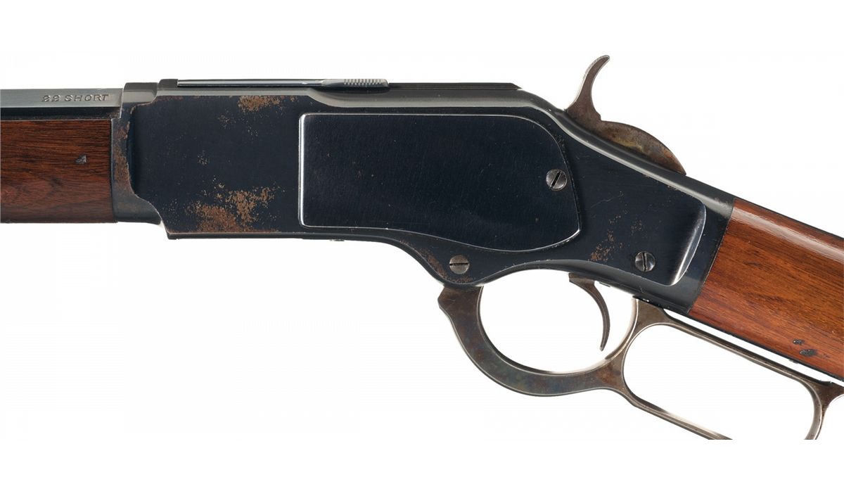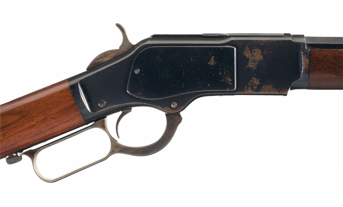 Condition: Excellent plus. The rifle has minimal handling wear and shows only scattered and very minor storage marks. More than 95% of the original blue finish remains. The only significant wear in the blue finish on the barrel and receiver is some flaking on the left and right side of the receiver ahead of the side plate. The hammer, lever and crescent buttplate have nearly all of the color casehardened finish with vivid case colors. The forearm and stock are both excellent plus with virtually all of the original varnish; wear is limited to a few scattered and very minor storage marks. The barrel and receiver markings are crisp. This is an exceptional original example of a Model 1873 .22 Short Lever Action rifle that was manufactured by Winchester.