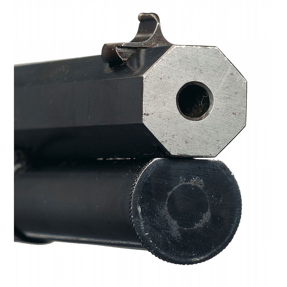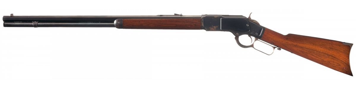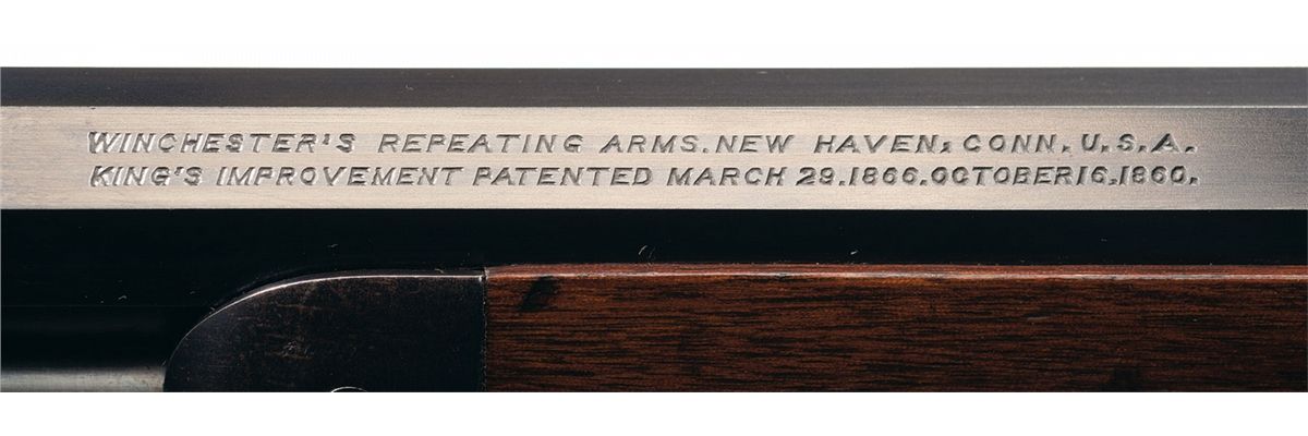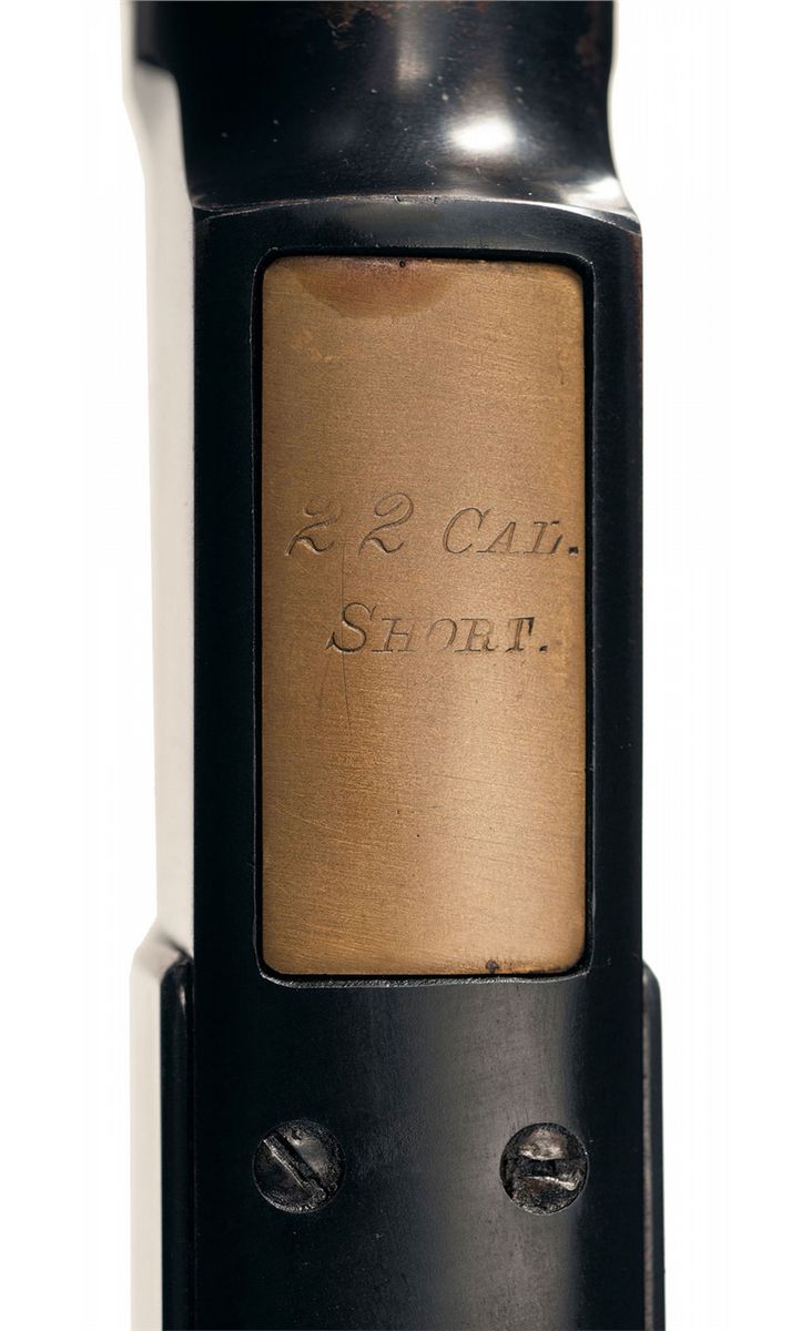 Winchester Model 1873 .22 Short Rifle manufactured c.1920. This rifle, manufactured toward the end of Model 1873 rifle production after the model was declared "obsolete" around serial number 702,000, is the highest known serial number Model 1873 .22 rifle and is discussed on page 526 of "WINCHESTER NEW MODEL OF 1873, A TRIBUTE, VOL.II" by James Gordon. The rifle has a full-octagon barrel and Third Style receiver with integral dust cover rail and dust cover with serrated edges. The barrel has a dovetail mounted sporting style front sight with silver bead and a sporting style rear sight. The barrel, magazine, forearm cap and receiver are blue and the hammer, lever and crescent buttplate are color casehardened. The stock and forearm are straight grain black walnut with a varnish finish. The left barrel flat is roll-stamped with the two-line legend "WINCHESTER'S REPEATING ARMS.NEW HAVEN, CONN. U.S.A./KING'S IMPROVEMENT PATENTED MARCH 29 1866. OCTOBER 16. 1860." ahead of the rear sight. The caliber designation "22 SHORT" is roll-stamped of the left barrel flat ahead of the receiver. Oval Winchester "W/P" proof marks are stamped on the top of the barrel and the receiver. ".22 CAL/SHORT" is stamped in script letters on the bottom of the brass cartridge elevator. The upper receiver tang is roll-stamped "MODEL 1873/-WINCHESTER-/TRADE MARK. REG. IN.US.PAT.OFF." in three lines. The serial number "719227B" is stamped on the lower tang between the lever latch and the tang screw.