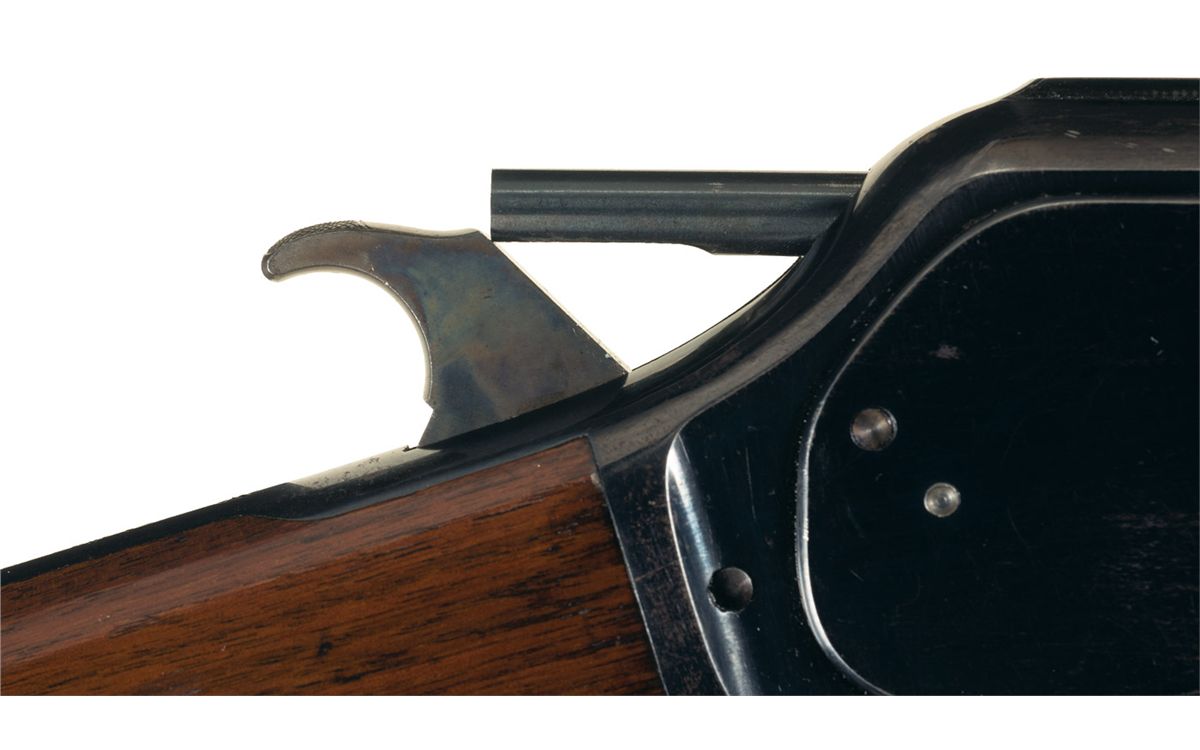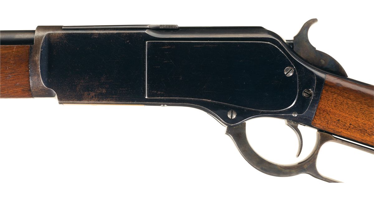 This excellent original Winchester Model 1876 rifle was manufactured in 1882. This rifle has the Third Model receiver with integral dust cover rail and dust cover with serrated rear edge. The 28-inch round barrel has a sporting style front sight with nickel-silver blade and folding leaf rear sight graduated to 1000 yards and marked "1876" at the top of the leaf. The upper tang is factory drilled and tapped. The crescent steel buttplate has a sliding brass trap door and the butt trap contains a jointed steel cleaning rod. The barrel, forearm cap, receiver, dust cover and buttplate are blued. The loading gate and bolt have a fiery niter blue finish. The hammer and lever are color casehardened. The stock and forearm are straight grain American walnut with a polished varnish finish. The top of the barrel is roll-stamped with the two-line legend "WINCHESTER'S-REPEATING-ARMS. NEW HAVEN. CT./KING'S-IMPROVEMENT-PATENTED-MARCH 29.1865. OCTOBER 16.1860." ahead of the rear sight. "CAL. 45-60" is stamped in script on the top of the barrel immediately in front of the receiver. "45-60" is stamped in script on the bottom of the cartridge elevator. The upper tang is roll-stamped "{ MODEL. 1876}" in fancy letters with foliate devices at either end. The serial number "41113" is stamped in script numerals between the lever latch and the rear tang screw.