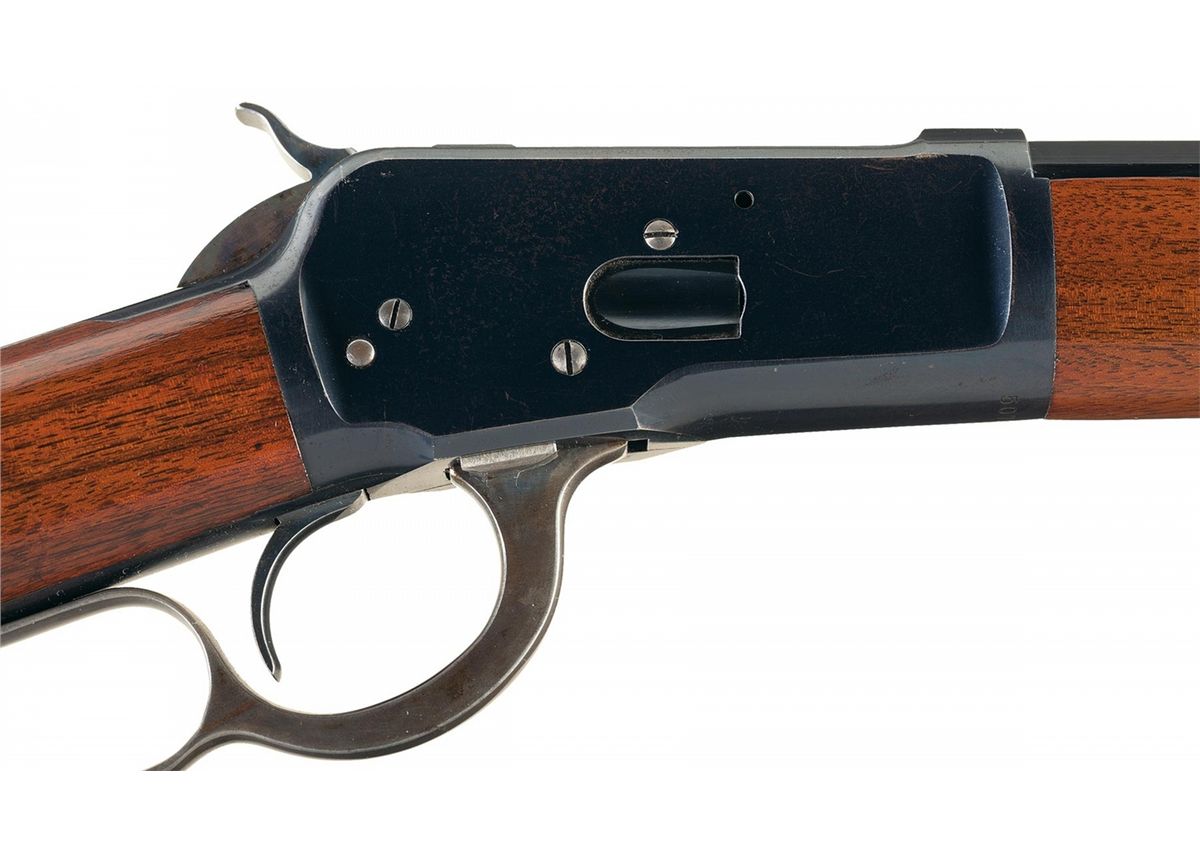 This is a beautiful exceptional example of a Winchester Model 1892 lever action rifle that was manufactured in 1909 and chambered the desirable 25-20 caliber, the lowest production caliber of all the 1892 rifles. The left barrel flat is marked with Winchester factory two line address and 1884 patent date ahead of the rear sight, followed by the Winchester "WP" oval proof behind the rear sight with "25-20 W.C.F." in front of the receiver. The Winchester "WP" oval proof is also marked on top of the receiver. The top tang has the standard second pattern, three line Winchester/Model 1892 markings with the full serial number on the bottom of the receiver. It is fitted with a nickel sporting front sight with the adjustable buckhorn type rear sight. As noted it has the desirable full length octagon barrel and magazine tube. It is fitted with a standard walnut forearm and stock with the stock fitted with a casehardened crescent buttplate.