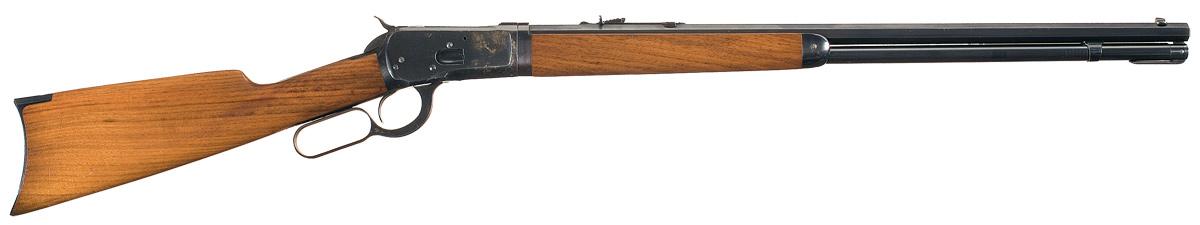 This is an exceptional example of a Winchester Model 1892 Take-Down Lever Action Rifle that was manufactured in 1917. The rifle has the desirable octagon barrel and full-length magazine. The stock and forearm are varnished walnut with a blued forearm cap and crescent steel buttplate. The barrel is fitted with a blade front sight with set screw and patent markings and a sporting style rear sight. The rifle has a full blue finish. The left side of the barrel is roll-stamped with the two-line legend: "MANUFACTURED BY THE WINCHESTER REPEATING ARMS CO./NEW HAVEN. CONN. U.S.A.PATENTED OCTOBER 14. 1884." ahead of the rear sight and "44 W.C.F." behind it. The oval Winchester "WP" proofmark is stamped on the top barrel flat and the top of the receiver. The upper receiver tang is roll-stamped: "MODEL 1892/-WINCHESTER-/TRADE MARK. REG.U.S.PAT. OFF. & FGN." in three lines. The serial number, "858380" is roll stamped across the lower portion of the receiver.