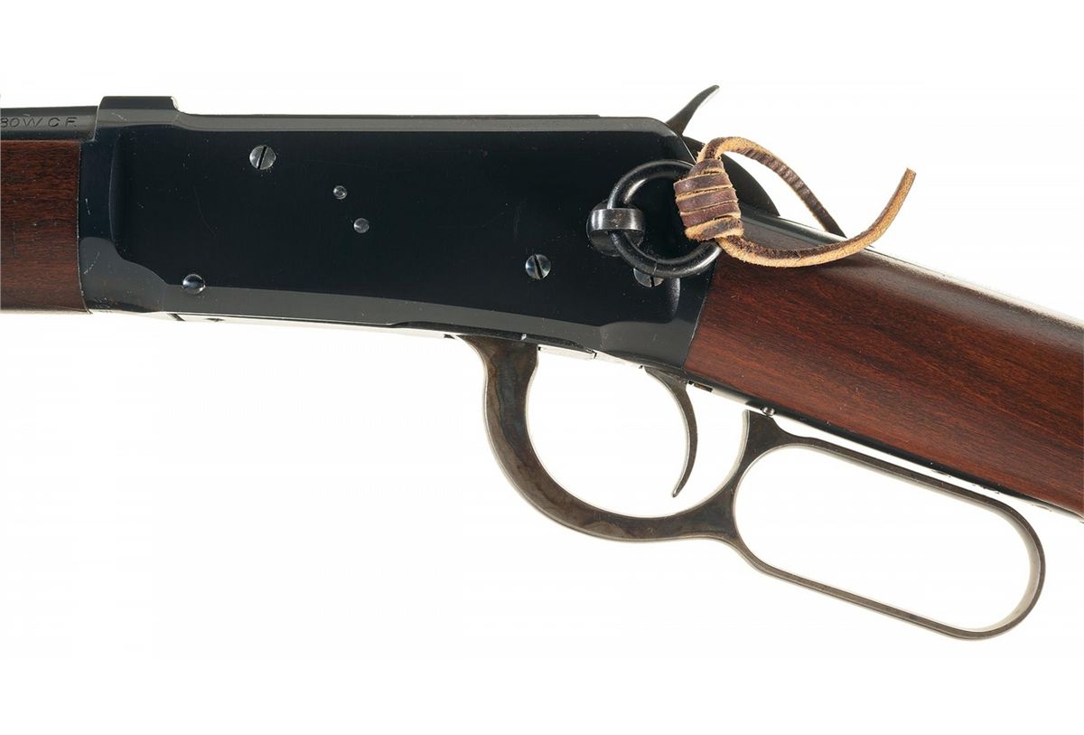 Manufactured in 1911. Beaded blade front sight and three leaf rear sight, saddle ring with leather thong and stud on the left side of the receiver. The left side of the barrel is marked with the two line address/patent date ahead of the rear sight followed by the two line nickel steel/smokeless powder marking and "30 W.C.F." at the breech. The Winchester oval proof is on top of the barrel and receiver at the breech. The upper tang has the three line model, maker, trade mark information marking and the serial number is on the bottom front of the receiver. Blue finish with casehardened hammer and lever, and mounted with a smooth walnut forearm and straight grip stock with a carbine buttplate.