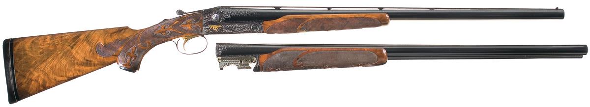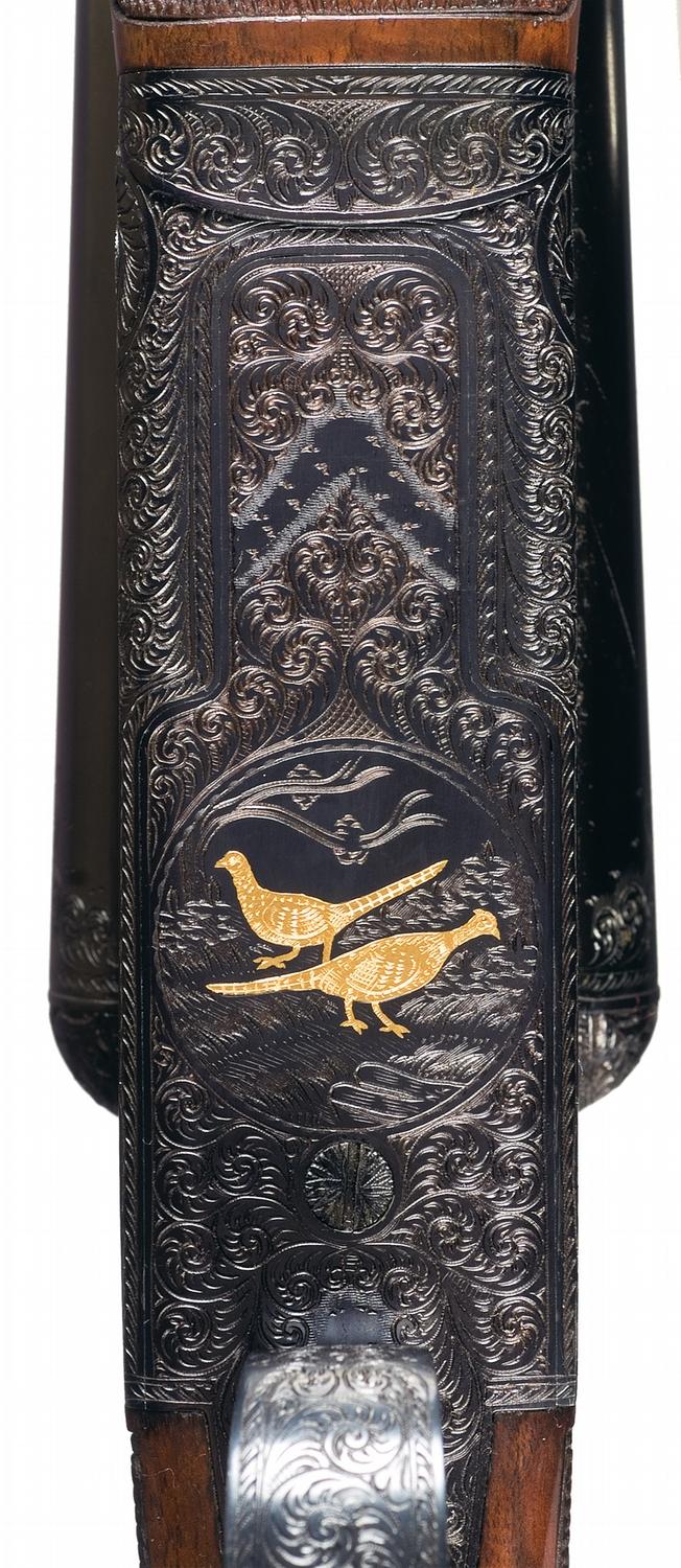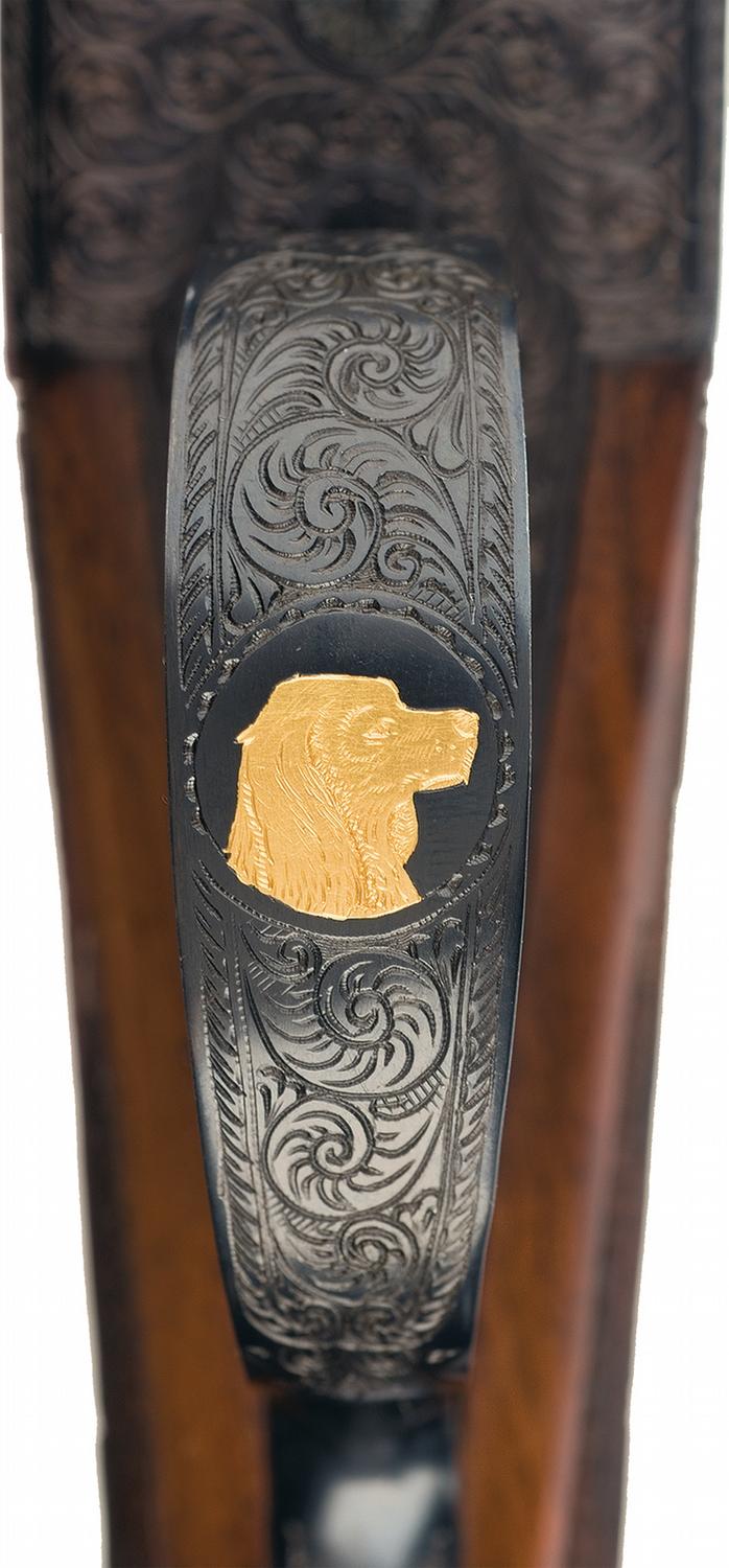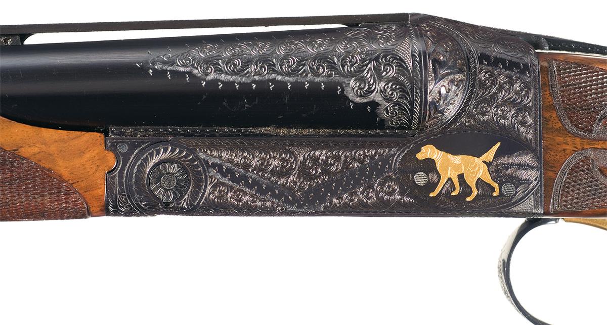 Introduced by Winchester in 1931, the Model 21 was one of the company's finest effort ,with regard, to quality, reliability and strength. The model was introduced as a production line gun and moved to the custom shop in 1960 but it was in fact, a hand-built custom-made shotgun from the beginning. This shotgun is a two barrel set, one 28" and the other 26". Each set of barrels has a 3" wedge of fine floral scroll engraving on the rear sides, a vent matte rib with a single ivory bead sight and marked "CUSTOM BUILT BY WINCHESTER" at the breech end. The top rear of the left barrel of each set is marked "MODEL 21 WINCHESTER 12 GAUGE 3 IN. CHAM. / MADE IN NEW HAVEN CONN. U.S.A.". Each has jeweled flats, lug, ejectors and breech face, and extra fancy, highly figured triple X walnut forearms with finely floral scroll engraved hardware, ebony forend inset and fancy Fleur-de-Lis checkering. The 26" set has the chokes marked as improved cylinder/cylinder and the 28" set modified/improved cylinder. The receiver, break lever and trigger guard are finely floral scroll engraved with a gold inlaid hunting dog with a field scene in an oval panel on each side of the receiver, two gold inlaid pheasants on the underside in a field scene and the head of a hunting dog on the trigger guard. The fences have deep relief oak leafs with a matte background. The water table and breech face are jeweled with the Winchester proof and the three line address/model designation on the left side and a "crown/GP" proof on each side. Gold washed trigger with selector mounted in it, tang mounted automatic safety with gold "SAFE" and mounted with an extra fancy triple X, highly figured American walnut pistol grip stock with fancy Fleur-de-Lis checkering, engraved grip cap with gold inlaid "GRAND / AMERICAN", solid, leather wrapped recoil pad and gold initial oval. Complete with a leather bound hard case with maroon lining, Winchester label affixed to the inside of the lid, canvas cover and two snap caps. The accompanying copy of the U.S. Repeating Arms Company letter states that the gun was completed on September 4, 1975 as a Grand American. The letter verifies the gauge, 28" barrel choked improved cylinder and modified with vent rib, the 26" barrels choked cylinder and improved cylinder, 3" chambers and 21-6 Grand American engraving with gold inlays. No other information is available.