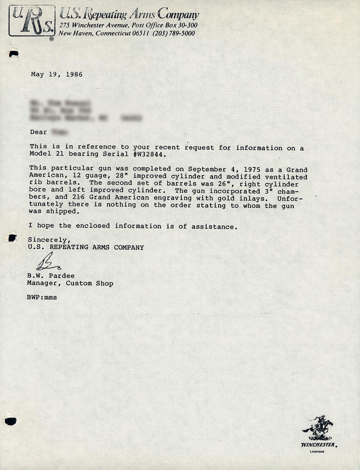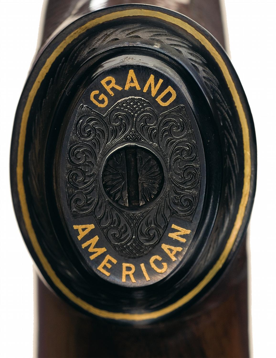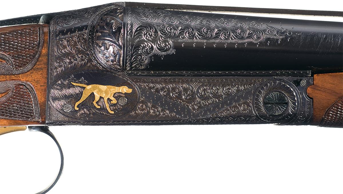 Introduced by Winchester in 1931, the Model 21 was one of the company's finest effort ,with regard, to quality, reliability and strength. The model was introduced as a production line gun and moved to the custom shop in 1960 but it was in fact, a hand-built custom-made shotgun from the beginning. This shotgun is a two barrel set, one 28" and the other 26". Each set of barrels has a 3" wedge of fine floral scroll engraving on the rear sides, a vent matte rib with a single ivory bead sight and marked "CUSTOM BUILT BY WINCHESTER" at the breech end. The top rear of the left barrel of each set is marked "MODEL 21 WINCHESTER 12 GAUGE 3 IN. CHAM. / MADE IN NEW HAVEN CONN. U.S.A.". Each has jeweled flats, lug, ejectors and breech face, and extra fancy, highly figured triple X walnut forearms with finely floral scroll engraved hardware, ebony forend inset and fancy Fleur-de-Lis checkering. The 26" set has the chokes marked as improved cylinder/cylinder and the 28" set modified/improved cylinder. The receiver, break lever and trigger guard are finely floral scroll engraved with a gold inlaid hunting dog with a field scene in an oval panel on each side of the receiver, two gold inlaid pheasants on the underside in a field scene and the head of a hunting dog on the trigger guard. The fences have deep relief oak leafs with a matte background. The water table and breech face are jeweled with the Winchester proof and the three line address/model designation on the left side and a "crown/GP" proof on each side. Gold washed trigger with selector mounted in it, tang mounted automatic safety with gold "SAFE" and mounted with an extra fancy triple X, highly figured American walnut pistol grip stock with fancy Fleur-de-Lis checkering, engraved grip cap with gold inlaid "GRAND / AMERICAN", solid, leather wrapped recoil pad and gold initial oval. Complete with a leather bound hard case with maroon lining, Winchester label affixed to the inside of the lid, canvas cover and two snap caps. The accompanying copy of the U.S. Repeating Arms Company letter states that the gun was completed on September 4, 1975 as a Grand American. The letter verifies the gauge, 28" barrel choked improved cylinder and modified with vent rib, the 26" barrels choked cylinder and improved cylinder, 3" chambers and 21-6 Grand American engraving with gold inlays. No other information is available.