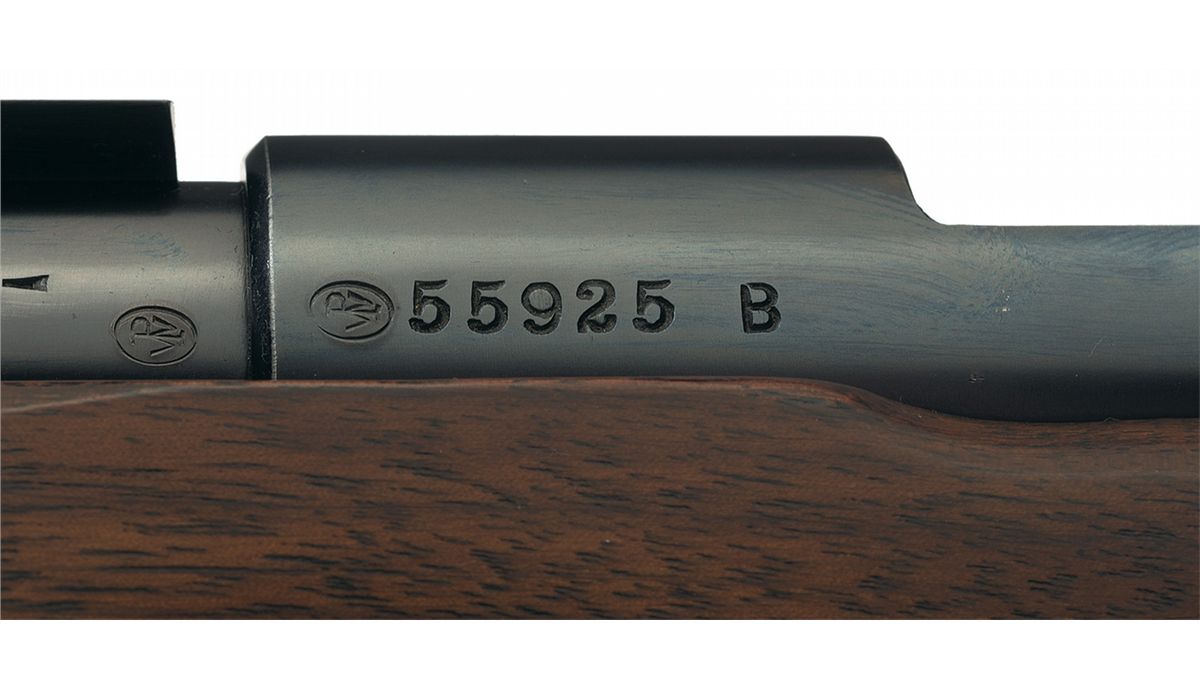 Manufactured in 1946. There is a Globe style front sight mounted on the dovetail mounted front sight block, there are two scope blocks mounted towards the rear of the heavy barrel, the receiver dovetail has a filler block installed and there is a rear sight mount attached to the left rear of the receiver. Mounted on a smooth walnut pistol grip stock with an accessory rail mounted in the forearm with a palm stop/sling swivel installed and a checkered steel buttplate.