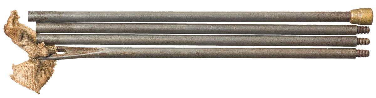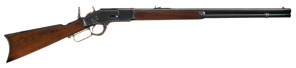 Winchester Second Model 1873 Sporting Rifle with round barrel and full-length magazine manufactured in 1879. The barrel, magazine, forearm cap, and receiver are blued. The loading gate has a fiery, niter blue finish. The hammer, loading lever and crescent buttplate have a color casehardened finish. The stock and forearm are straight-grain black walnut with a varnish finish. The dust cover guide is secured with two screws and the dust cover has the serrated finger grip found on late production Second Model guns. The knurling on the hammer has distinct borders. The bottom of the cartridge elevator and barrel, correctly, lack caliber markings. The barrel is fitted with a nickel-silver, fixed blade, front sight and a sporting style rear sight. A folding "Combination Tang Peep Sight" with "Pat. Jan. 29/79" markings on the post and "Pat. May 6/84" markings on the base is fitted on the receiver tang. The buttplate has a sliding brass trap; the trap contains a jointed, four-piece, steel cleaning rod with brass tip. The top of the barrel is roll-stamped with the two-line legend: "WINCHESTER'S-REPEATING-ARMS. NEW HAVEN. CT./KING'S- IMPROVEMENT- PATENTED - MARCH 29.1866.OCTOBER 16. 1860.". The serial number, "60967" is located on the lower receiver tang behind the loading lever latch. The upper receiver tang markings are covered by the combination sight.
