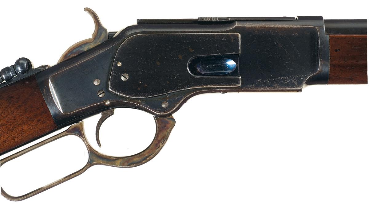 Condition: Excellent. The rifle retains more than 97% of the original blue finish. Wear is limited to some very minor storage scratches and edge wear on the receiver and side plates. The loading gate retains nearly all of the niter blue finish. The hammer, loading lever and buttplate have nearly all of the original casehardened finish with vivid case colors. The barrel markings are crisp. The bore is bright. The stock and forearm are in excellent condition with nearly all of the original varnish finish and shows the desirable raised grain appearance that should be found on an "untouched" stock. This is an exceptional example of a Winchester Second Model 1873 Rifle in highly desirable condition that would be nearly impossible to upgrade.