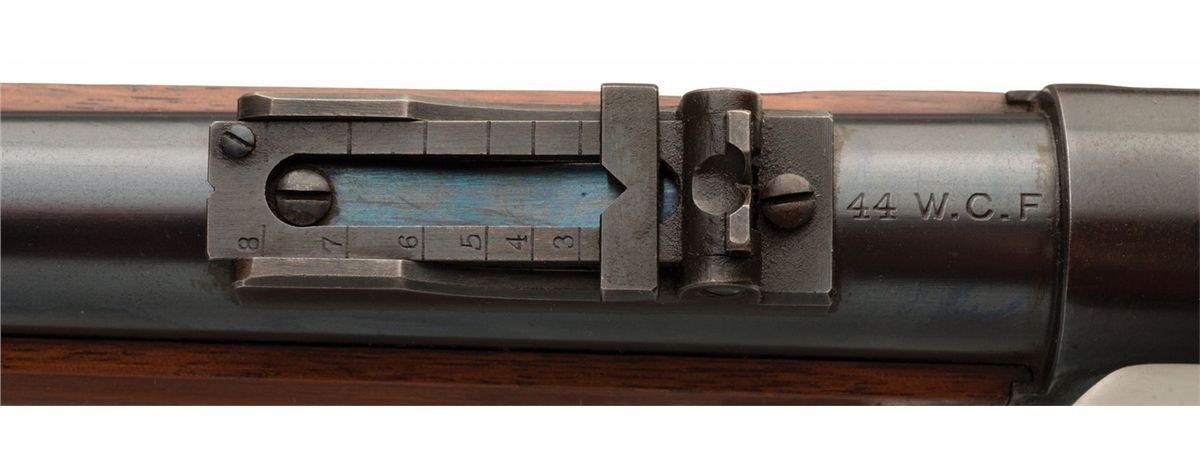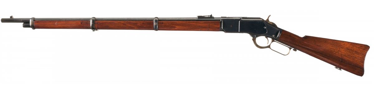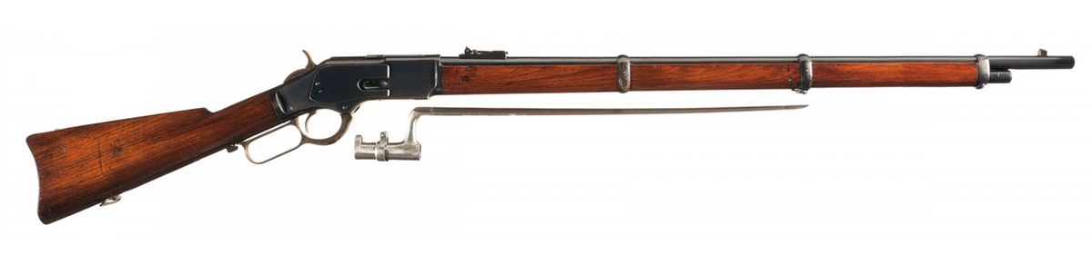 Manufactured in 1903. Blade front and military style folding leaf rear sights, with two line address and patent markings, caliber marking behind the rear sight, and three barrel bands. Casehardened hammer and lever, with "44 CAL." on the elevator, "-Model. 1873.-" on the top strap and an integral dust cover rail. Smooth straight grip stock with sling swivels and a smooth butt with storage compartment, containing a 5-piece cleaning rod. With an unmarked socket bayonet, 21 inches overall with an 18 inch triangular spike.