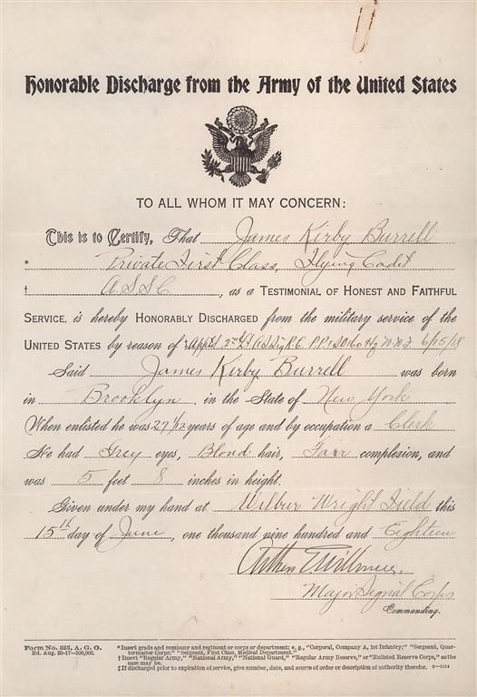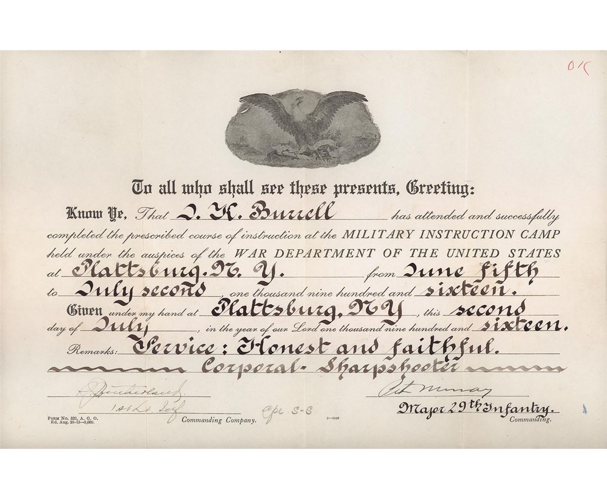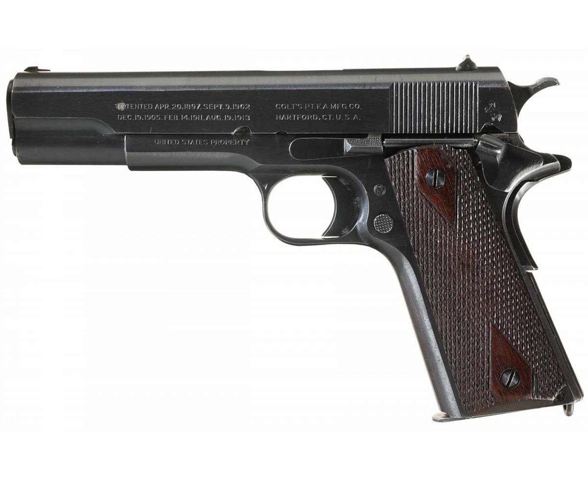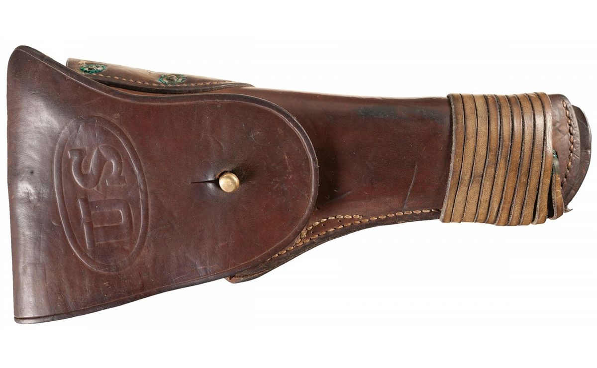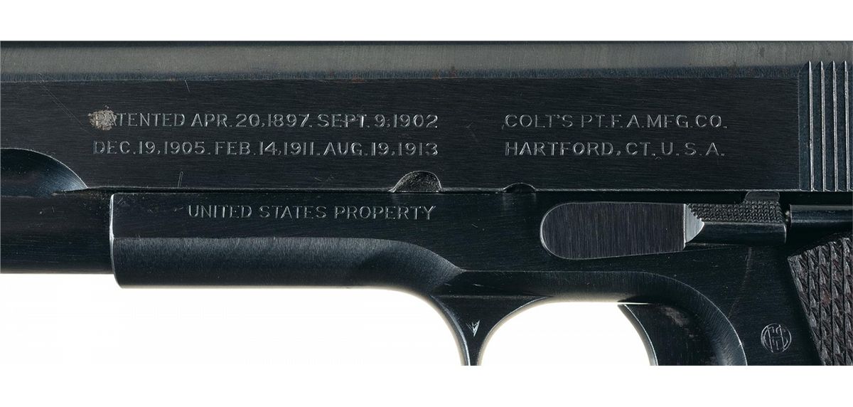This is a beautiful example of a early 1918 US Army, Colt contract pistol that is accompanied with a set of documents (provided by the consignor) from James Burrell who was commissioned as a Second Lieutenant in the Air Service ( Aeronautics) in June 1918. The pistol itself is a very nice late totally original WWI military contract pistol that has the new "block" style markings but still retains the wartime brushed blue military finish, diamond checkered walnut grips and the two-tone magazine. The accompanying documents for Mr. Burrell include a certificate awarding him a Corporal-Sharpshooter in July 1916, he received a Certificate of Graduation from the US School of Military Aeronautics, at Princeton University, February 1918 and then was commissioned as a Second Lieutenant in the US Army "Air Service" (Aeronautics) in June 1918. His service record which also accompanies this lot notes that he entered service as a Pilot Flying Cadet in Oct 1917 and was subsequently discharged in late June 1918. It would certainly be worth doing some additional research to determine who James Burrell actually was. The right side of the frame is stamped with the serial number: "No 219896" behind the slide stop hole and the right side of the slide is marked "MODEL OF 1911.U.S.ARMY". The left side of the slide is marked with the 1897-1913 patent dates in a two-line block followed by the two-line Hartford address, with the Rampant Colt behind the slide serrations. The left side of the frame is stamped with the circled initials "GHS" monogram of the US Army Ordnance inspector Gilbert H. Stewart. The top flat of the frame around the disconnector hole is stamped with the small Provisional Ordnance Inspector's, assembler's and Colt production order proofmark that consists of a small "H", "W" and "G" proof. The blue barrel has a separated "P" and "H" proofmark stamped on the chamber and it is fitted with the correct WWI blue and checkered thumb safety, slide release, flat main spring housing and Colt wide spur checkered hammer. It has the correct diamond checkered walnut grips and is complete with the correct two-tone blue magazine. The pistol is accompanied by an original WWI brown leather "US" marked flap holster stamped on the back, "G&K/ 1917/J.A.O."